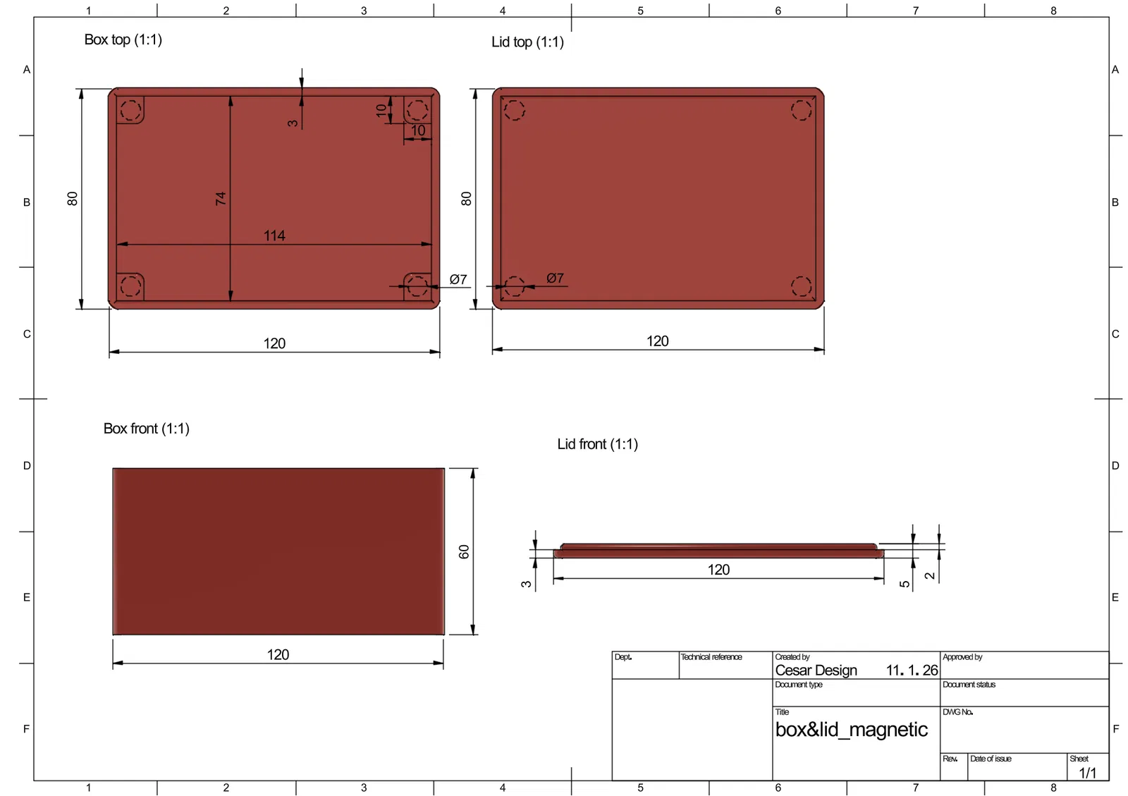 Hộp để bàn tiện dụng kèm nắp nam châm 120×80 mm, dùng nam châm tròn 6×3 mm được giấu kín bằng cách pause khi in. Nắp có gờ định vị ôm khít, đóng chắc chắn, gọn gàng, không cần kẹp hay bản lề.