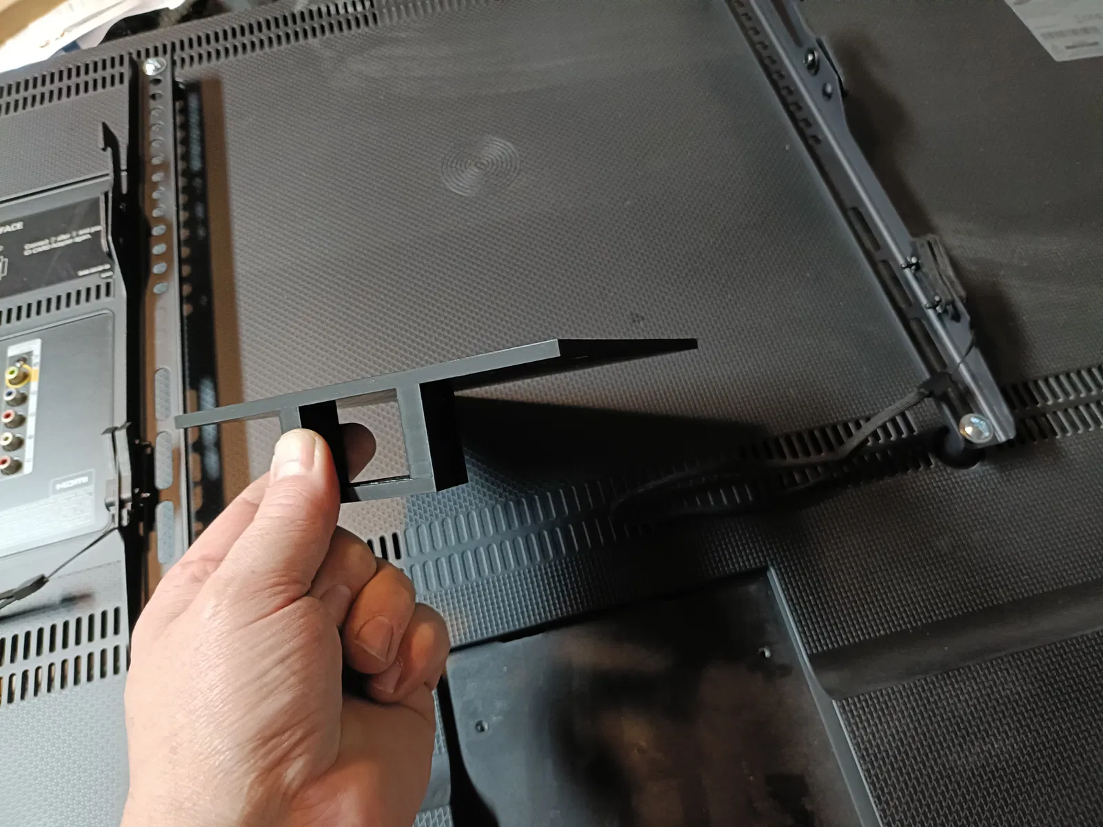 Mình treo TV trong phòng ngủ lên tường nhưng dây cáp bị vướng lung tung khắp nơi, nên mình làm một tấm đế có lỗ để dẫn dây gọn gàng và ngăn nắp hơn.