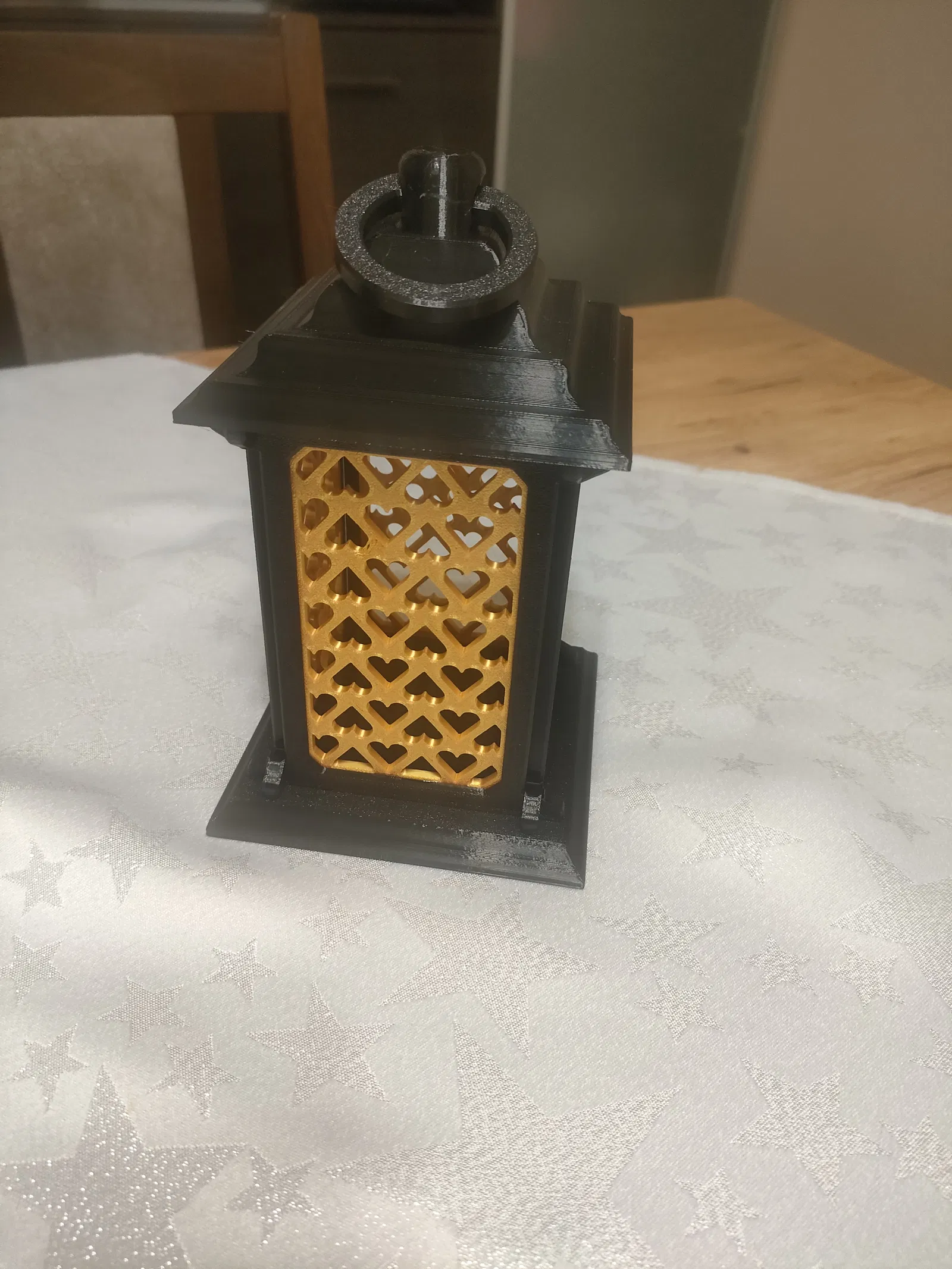 Mẫu đèn lồng trang trí in 3D chủ đề trái tim cho Valentine, dùng nến LED בלבד. Thiết kế modular snap-fit, không cần ốc; có 2 nắp (có/không khoen). Kích thước 110×110 mm, cao 181–204 mm.