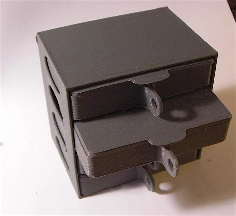 Một cuộc thám hiểm sớm các khay các bộ phận sau khi nhìn thấy một vài lựa chọn khác xung quanh. Những khay chia này rất đẹp và nhỏ và một tủ nhỏ cho phép bạn xếp chúng. Hình dạng cơ bản bắt nguồn từ những người khác đang làm tủ nhỏ của các khay có kích thước và chức năng khác nhau. Bắt đầu từ việc phối lại một trong những khay từ @Wkarraker của Thingiverse-một khay 12 thùng để bắt đầu. Scratch. Tôi đã thay đổi nhiều yếu tố khác nhau của các thiết kế đó nhưng nhìn thấy các ý tưởng khác luôn là nơi khởi đầu tốt. Các lỗ thông qua là nhỏ nên không cần thiết hỗ trợ.