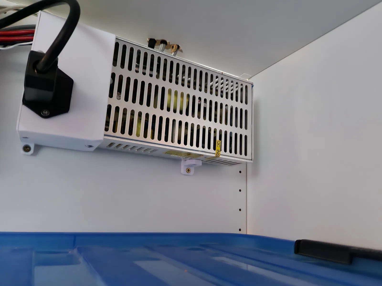 Ý tưởng là gắn PSU trong enclosure của mình và đi dây cáp ra ngoài thông qua nắp che. Để làm vậy, mình đã chỉnh sửa lại nắp che PSU zin từ Prusa và thêm một cái bracket phụ.