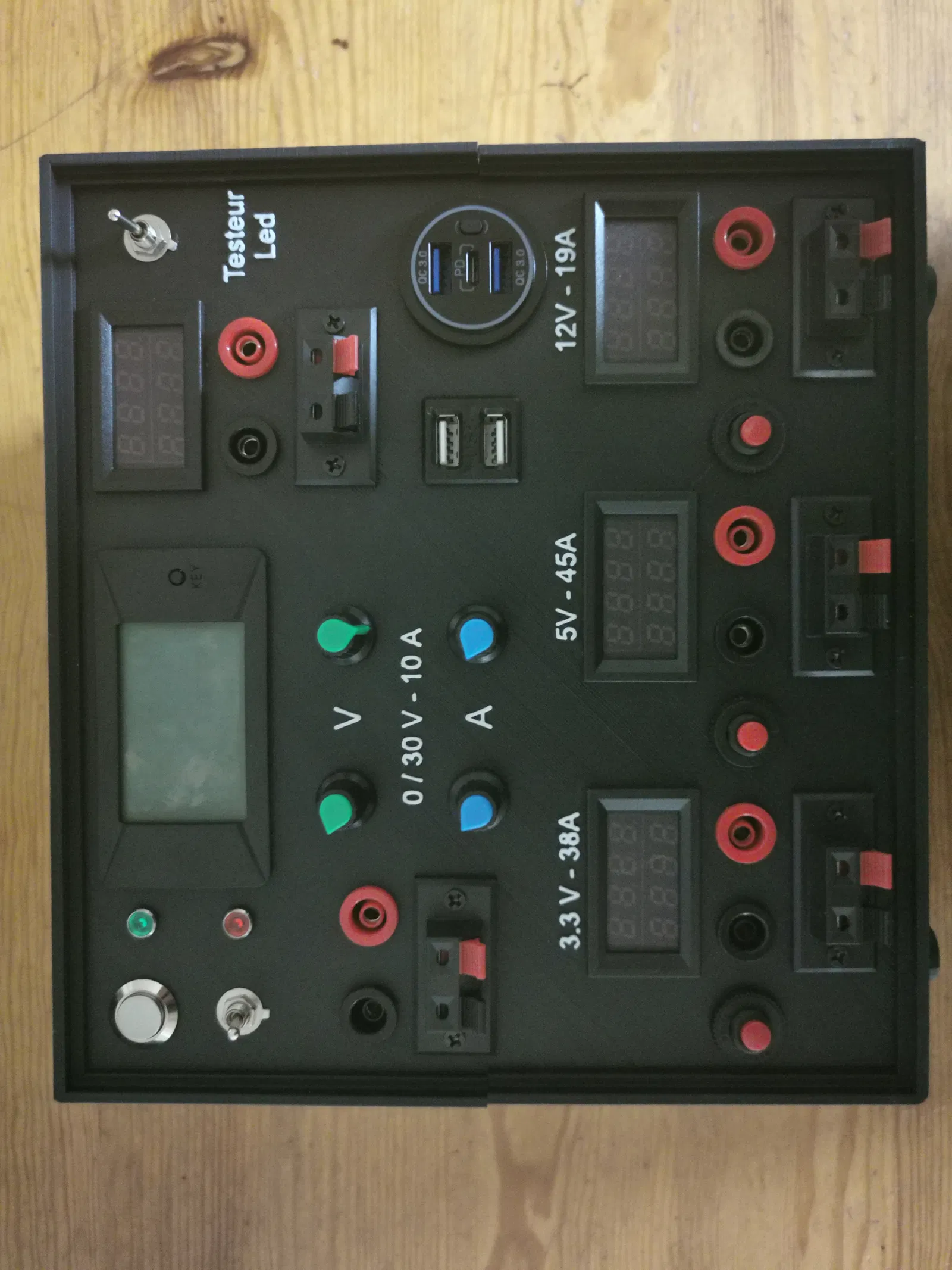 Mình bổ sung thêm, để bộ này hoàn chỉnh hơn, một bộ test LED. Ở mỗi ngõ ra cố định, mình gắn thêm một màn hiển thị V/A 4 digits, tương tự như cho bộ test LED. Bên trong, mình gắn thêm vào nguồn PC một module Buck-Boost 30V 10A Max cho ngõ ra biến thiên. Với bộ test LED, mình dùng module XL6009. Ngoài ra còn có 5 cổng USB để sạc hoặc cấp nguồn cho nhiều thiết bị khác nhau ở 5V.