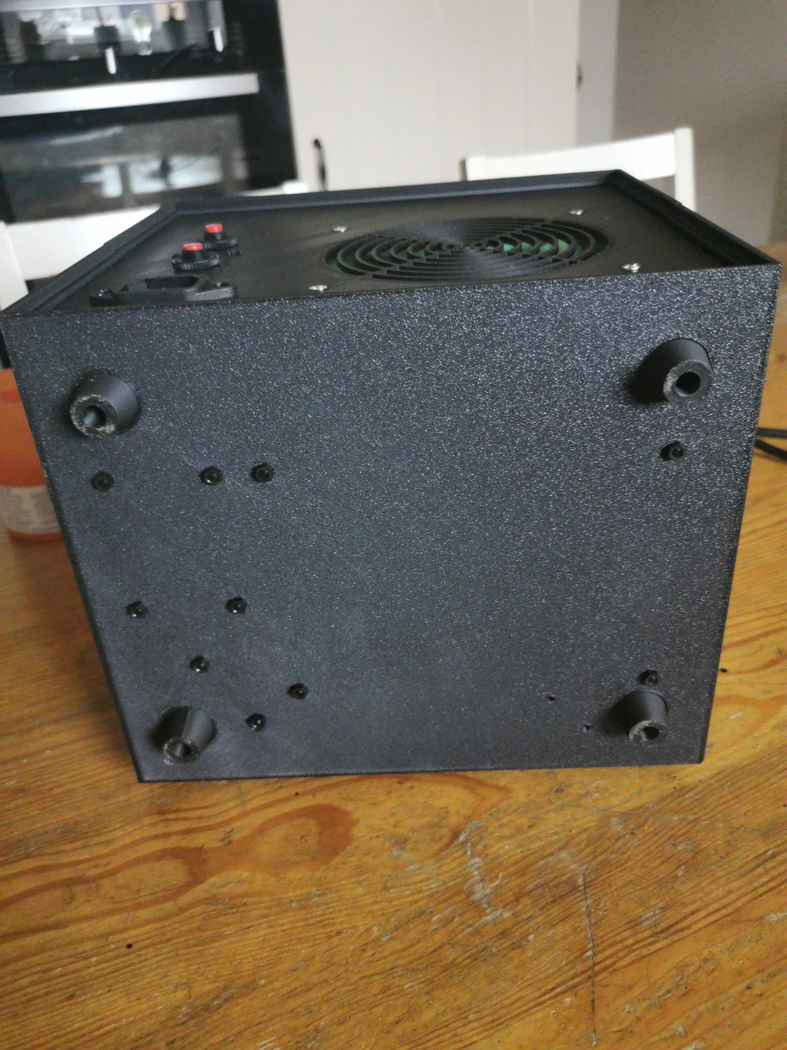 Phần mặt trước (façade) dưới và trên lắp khớp với nhau rất vừa. Bạn có thể đặt đai ốc cho bu-lông M3 vào các vị trí đã chừa sẵn bên trong, và giữ cố định bằng các nút chặn nhỏ (bouchons) thiết kế cho mục đích này. Các nút chặn được tạo ra để đai ốc không bị rơi vào trong hộp khi bạn đóng lại bằng vít.