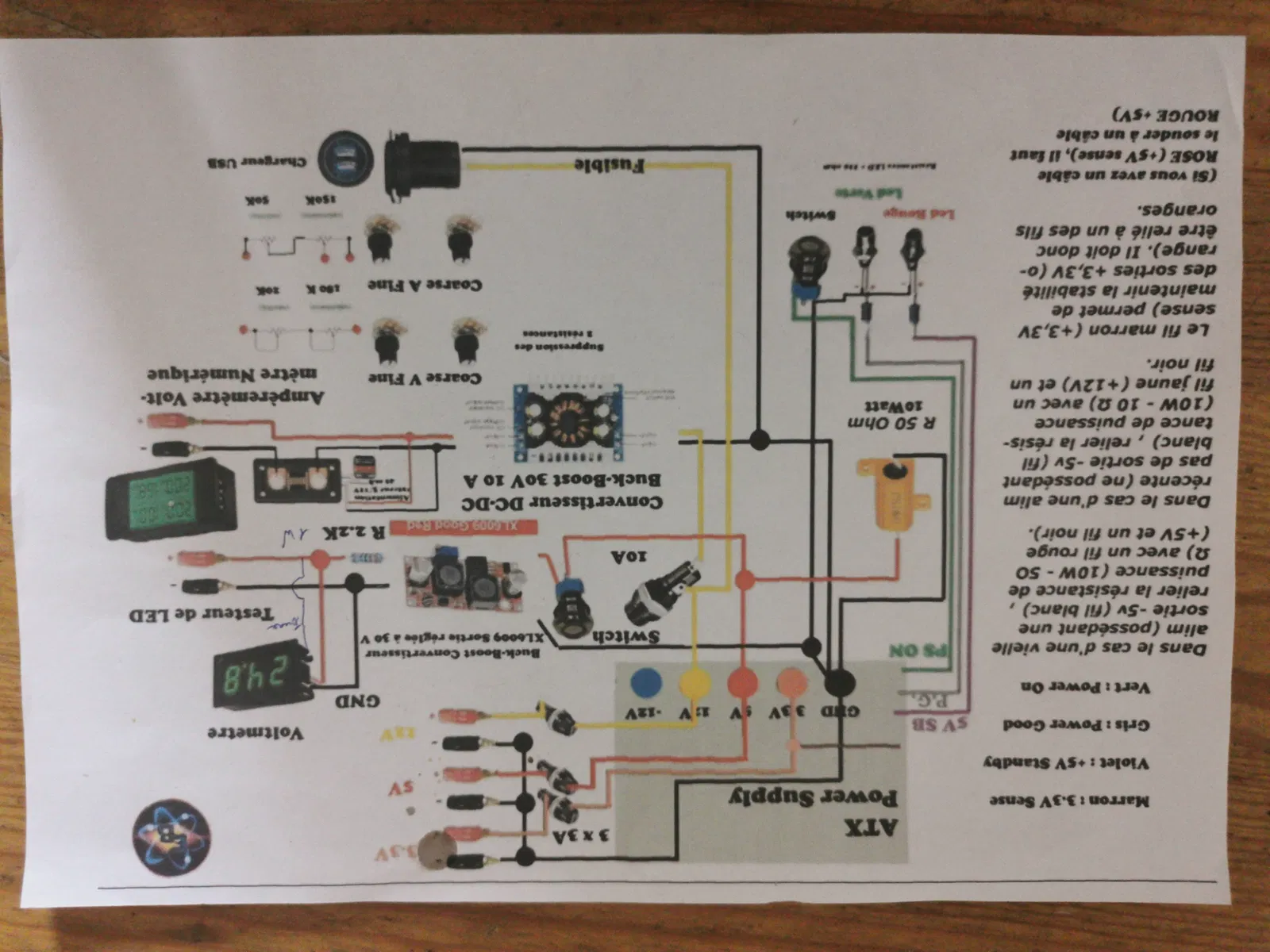 Xin chào, mình đã làm bộ nguồn phòng thí nghiệm này từ một bộ nguồn PC ATX. Mình dựa trên một sơ đồ tìm được trên YouTube để thực hiện phần đấu nối điện, rồi chỉnh sửa lại để nó được đầy đủ hơn. Các ngõ ra được bảo vệ bằng cầu chì tự phục hồi (automatic fuse).