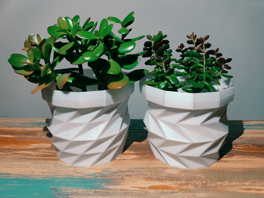 Bộ chậu cây tam giác remix từ mẫu của Bluebie, đã đổi và lật đối xứng các mảng tam giác để tạo thành nhiều chậu đồng bộ. In nhanh, ít lỗi; dễ chỉnh wall/bottom thickness bằng Cura (Spiralize Outer Contour/vase mode).