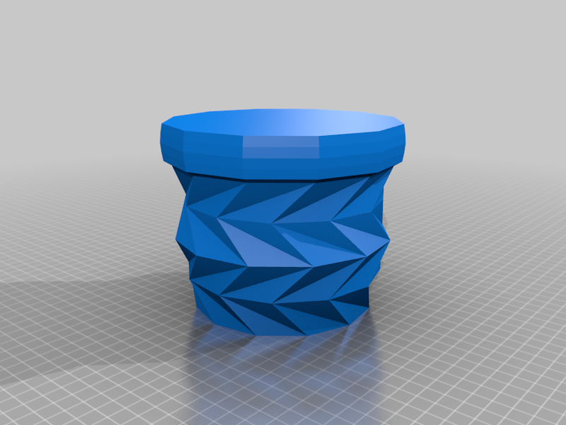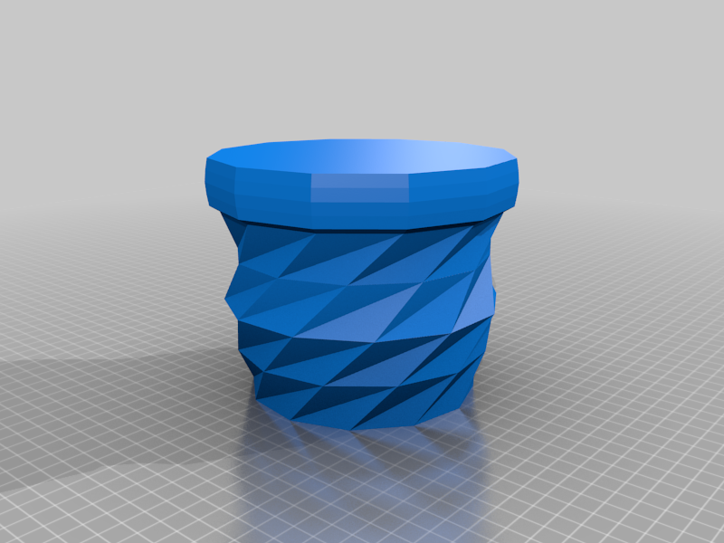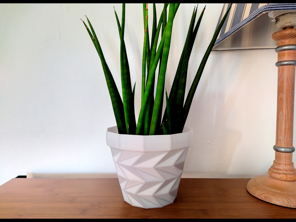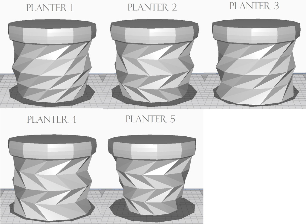 Bản remix từ “Triangulated Flower Pot” của Bluebie (thingiverse.com/thing:266392). Các phần tam giác đã được đổi chỗ và lật đối xứng để tạo thành một bộ chậu hoa.