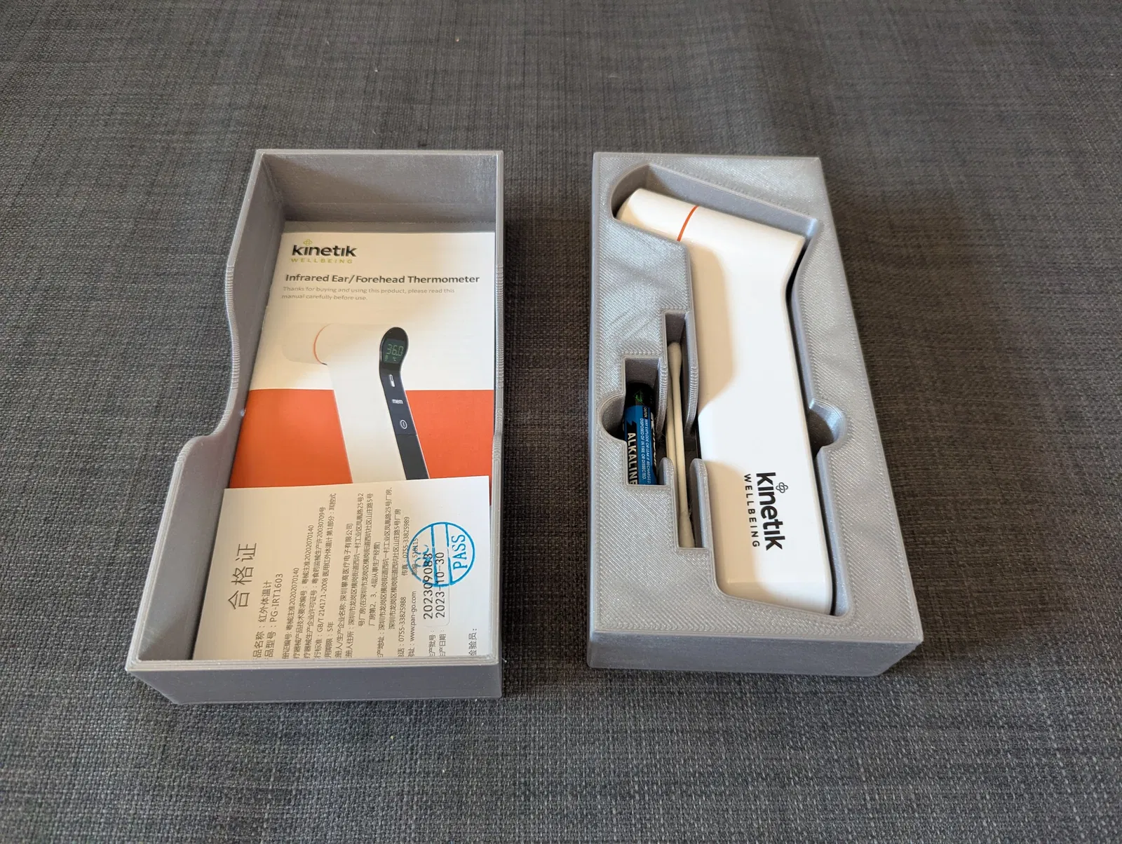 Hộp 2 phần để cất nhiệt kế tai/trán Kinetik, có ngăn để pin AAA và tăm bông vệ sinh đầu đo. Kích thước vừa đủ để để kèm sổ hướng dẫn. Kèm file “termometerTool” làm mẫu hình dáng.