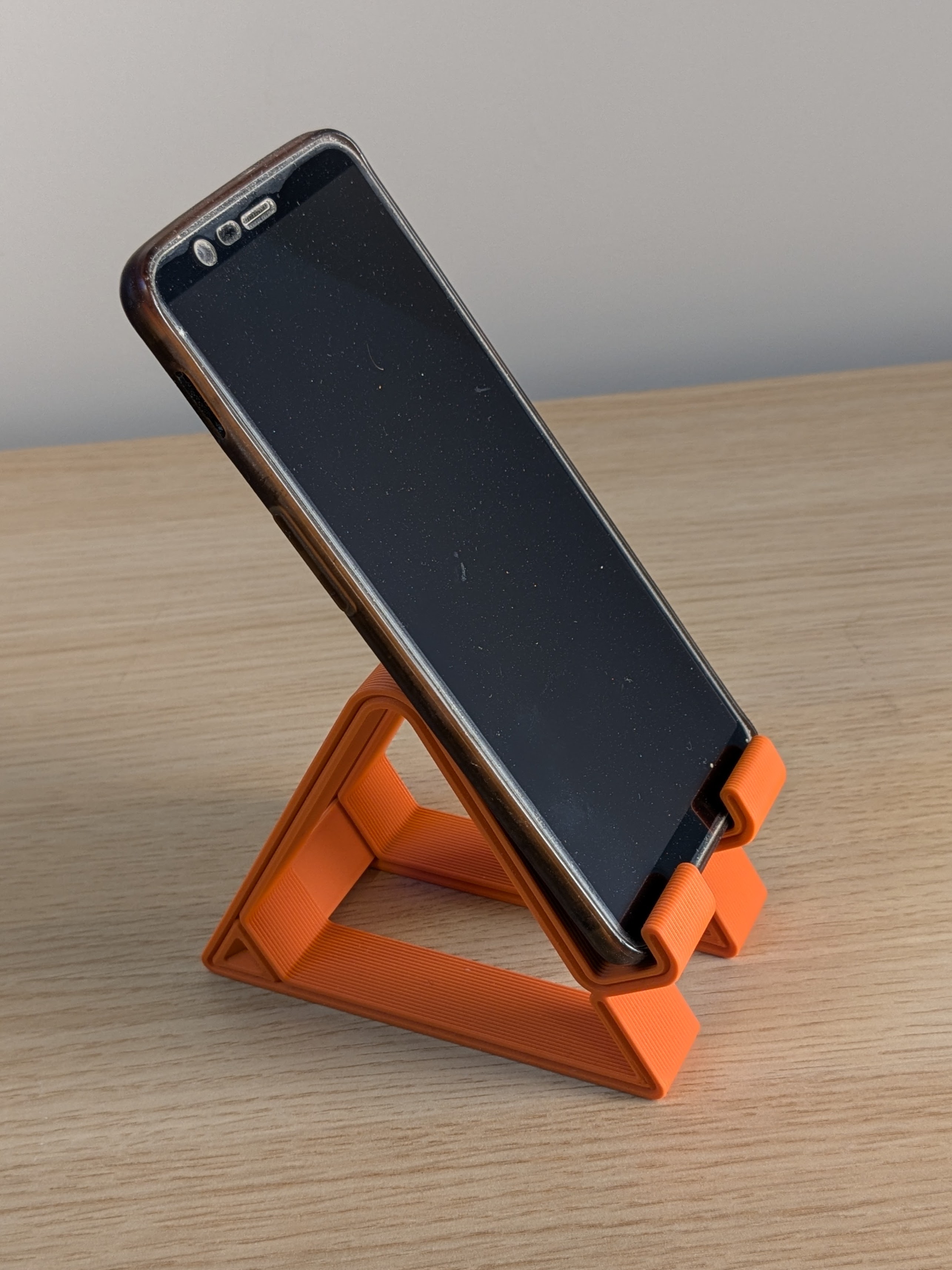Kệ điện thoại sạc tại chỗ, thiết kế sạch đẹp và cực kỳ ổn định. Không cần supports, không có overhang dốc nên in ra mịn và dễ cho người mới. Dùng được cả dọc/ngang, vừa máy kèm ốp tới 14 mm.