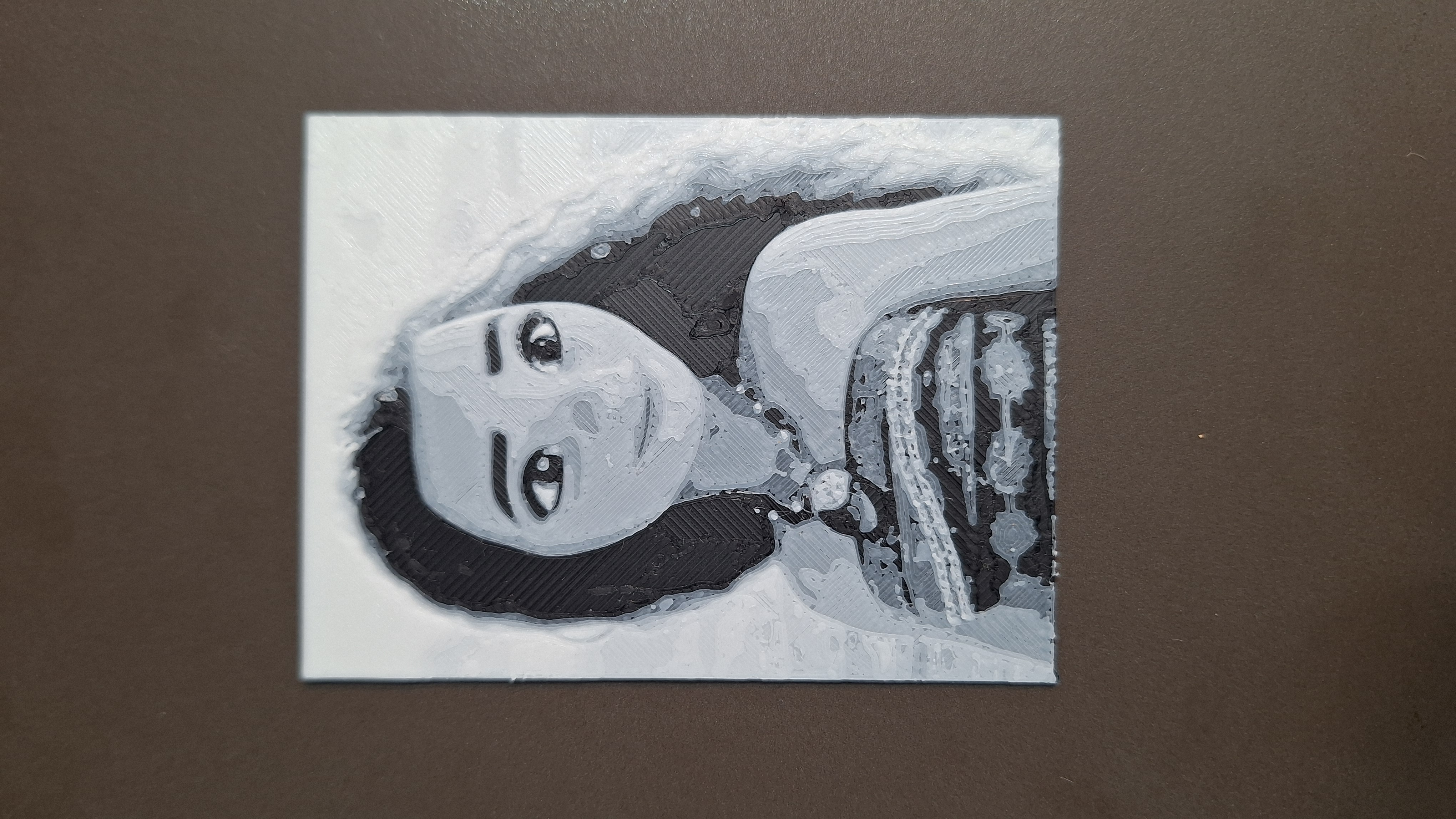 Mẫu thẻ Hueforge đen trắng kích thước 60x80mm của Vaiana. Thông số in: first layer 0,16mm, các lớp còn lại 0,08mm; 0,72mm đầu in màu đen, phần sau in màu trắng.