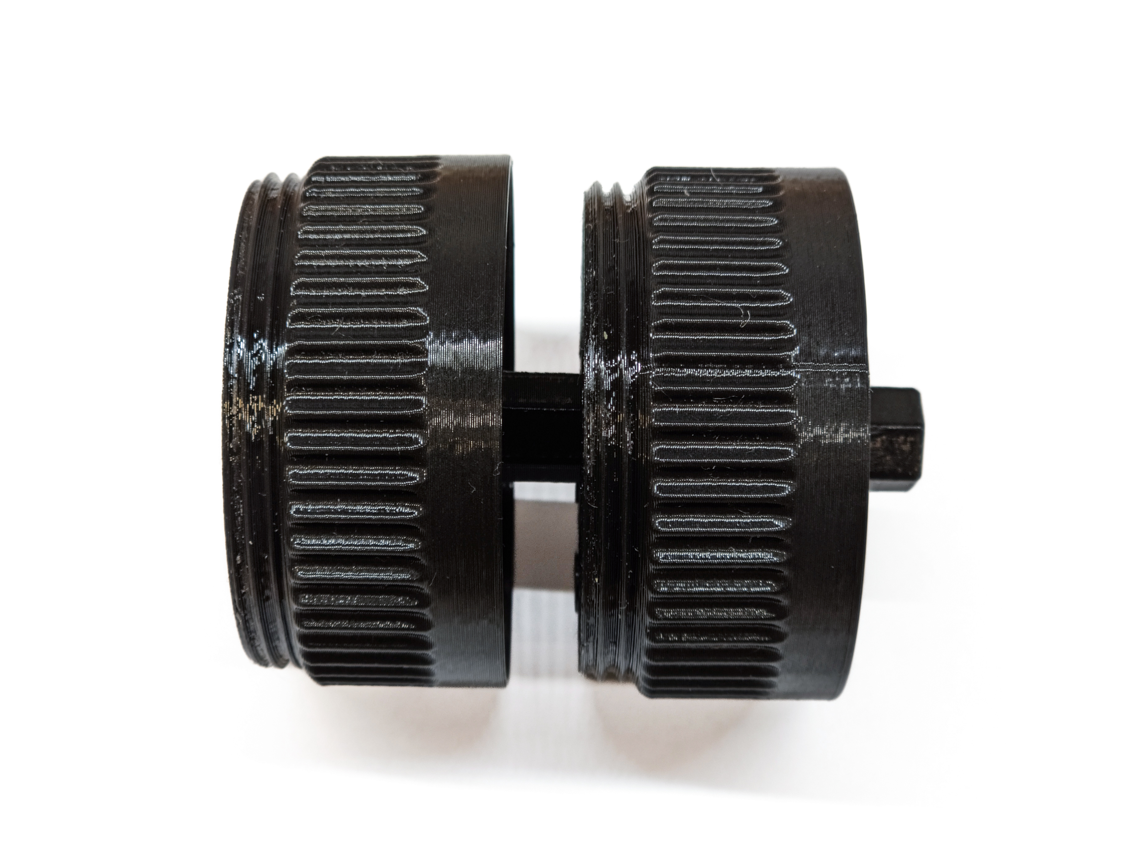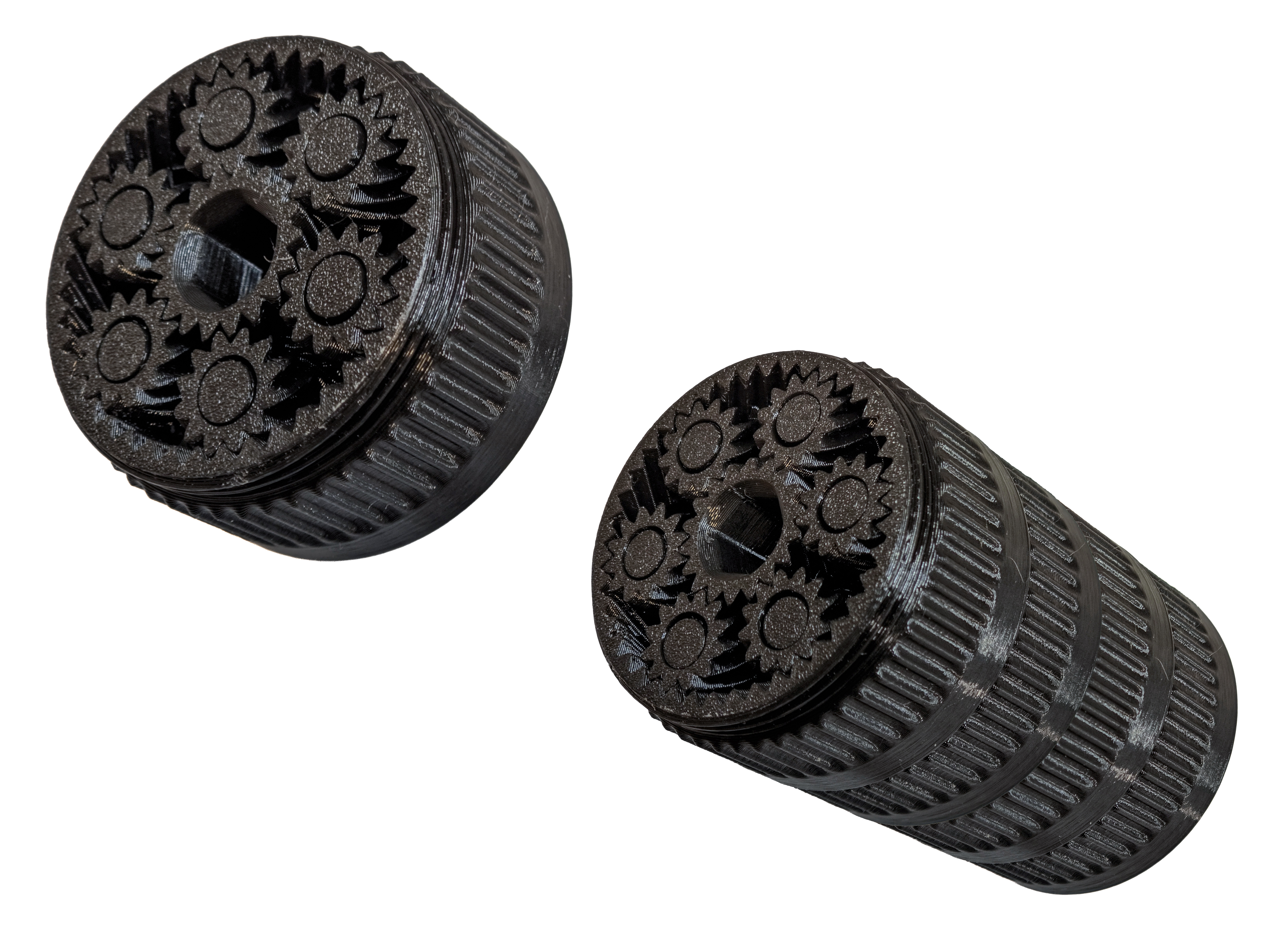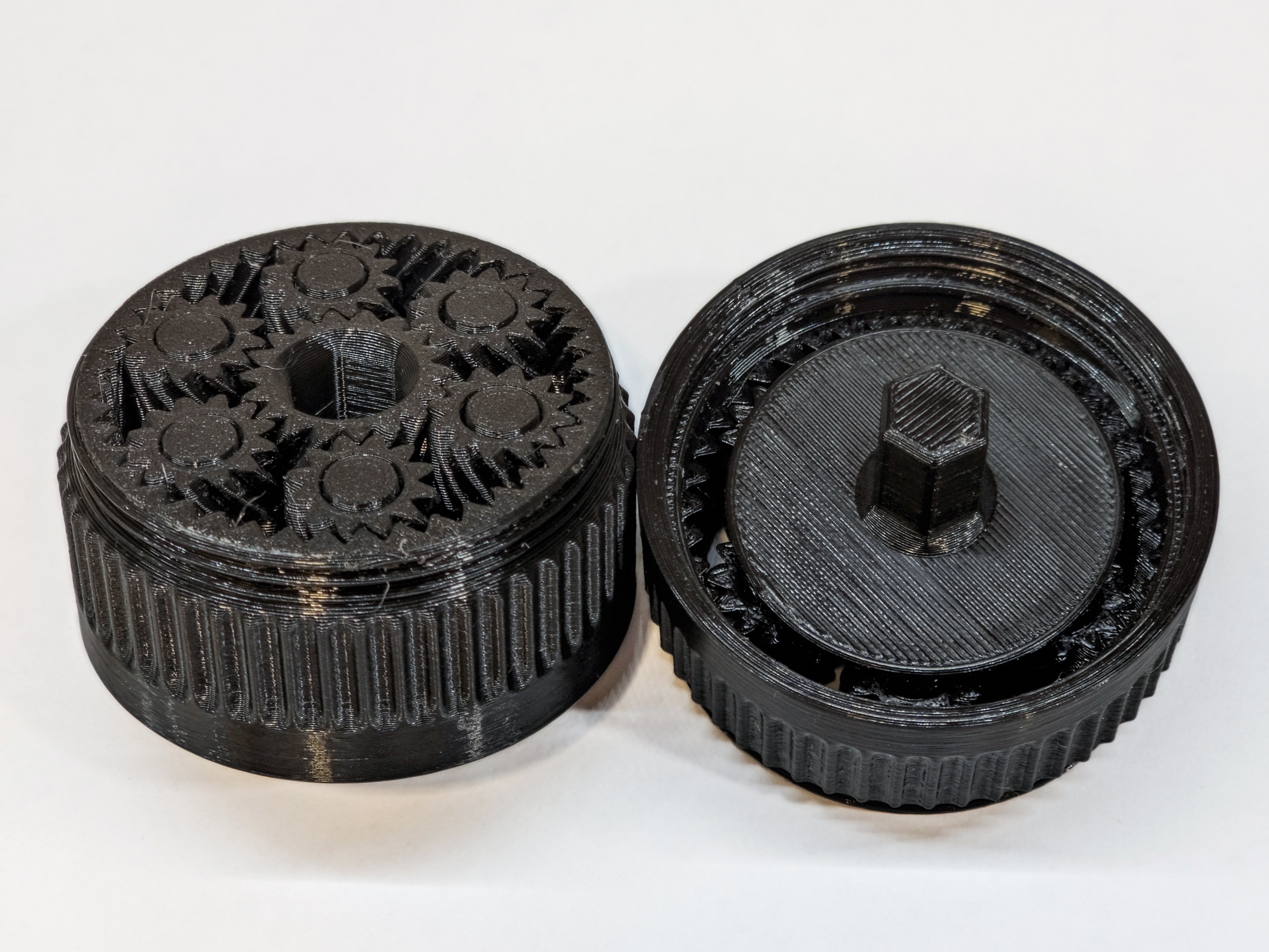 Ren tích hợp trên ring gear cho phép xếp chồng bằng cách vặn chúng vào nhau. Không cần thêm phần cứng nào khác. Trục input có thể xoay bằng tay, bằng lục giác 5mm hoặc dùng đầu tuýp/cờ-lê 12mm để có thêm lực siết (torque). Nhờ vậy, tốc độ của sun gear sẽ được nhân lên. Càng stack nhiều tầng thì sun gear ở tầng cuối sẽ quay càng nhanh. Không biết cộng đồng có ai làm thêm món gì hay hay gắn vào sun gear để nó quay “phê” hơn không ta?