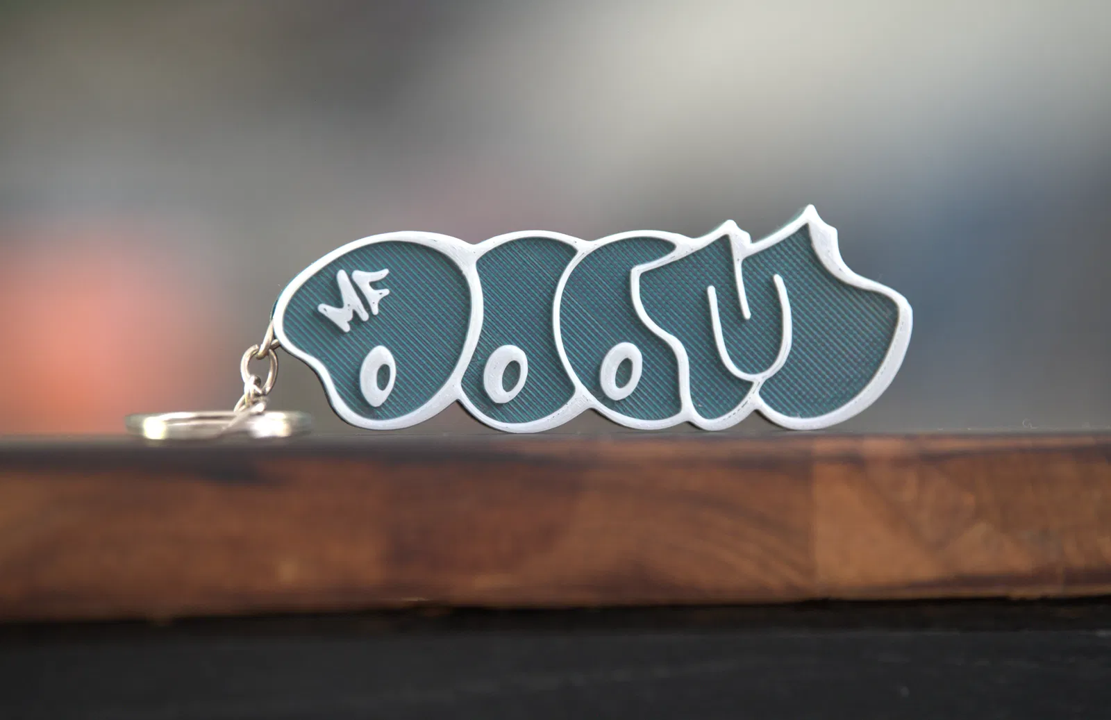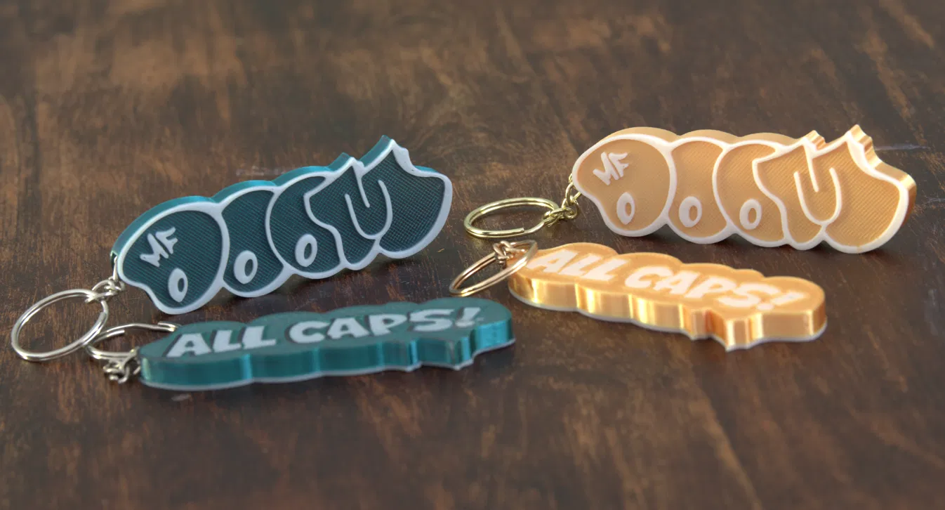 Mẫu móc khóa MFDOOM đơn giản. Khi in, canh pause ngay trước phần overhang để đặt khoen móc khóa tiêu chuẩn 20x1.3mm. Nếu in không dùng AMS, in chữ đáy trước rồi in phần móc khóa lên trên để đổi màu.