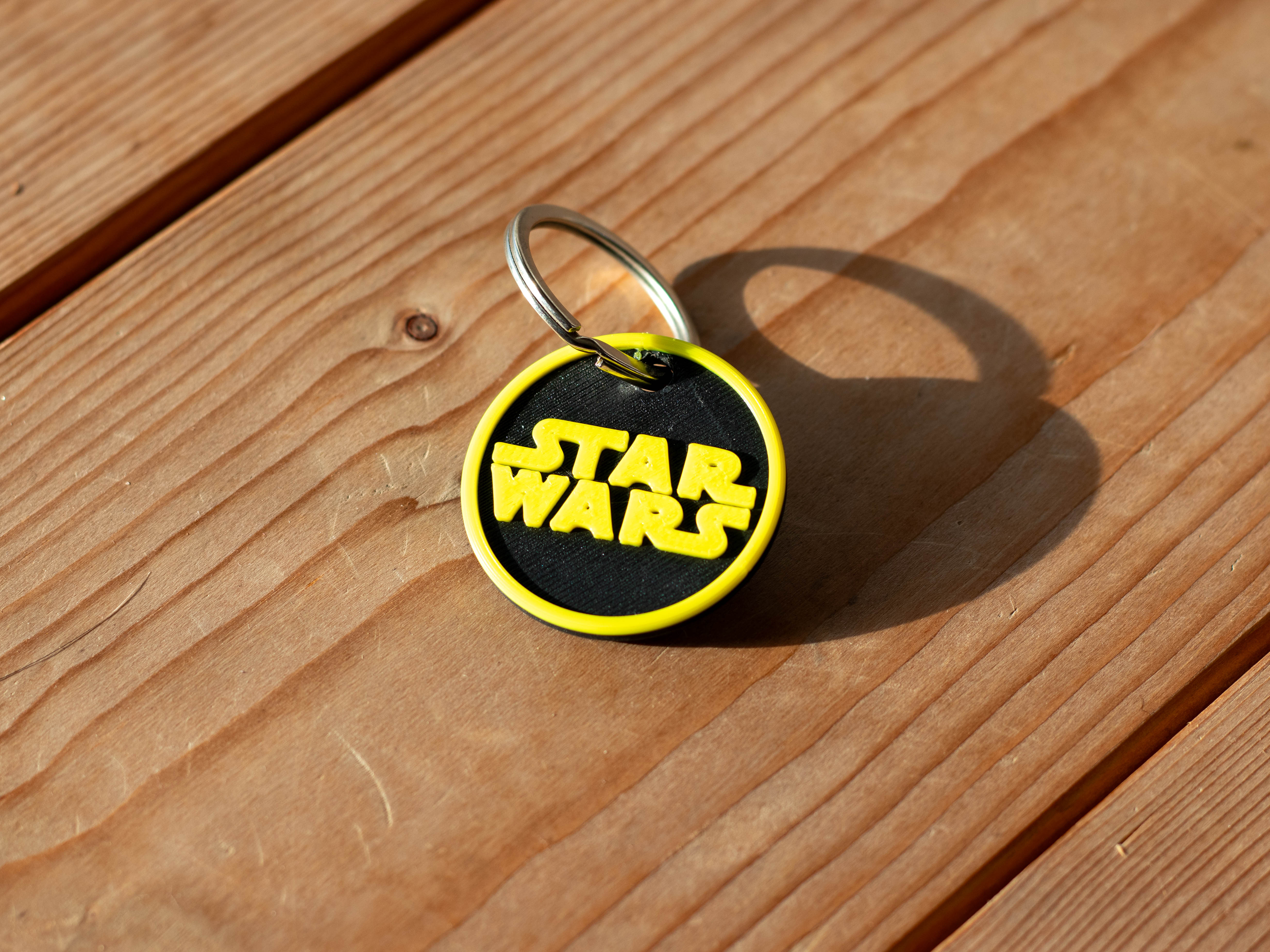 Móc khóa logo Star Wars kiểu đơn giản, in được cả khi có hoặc không có máy in multicolor/AMS. Nếu không dùng AMS, profile đã cài Pause ở 3.2mm để thay filament rồi tiếp tục in.