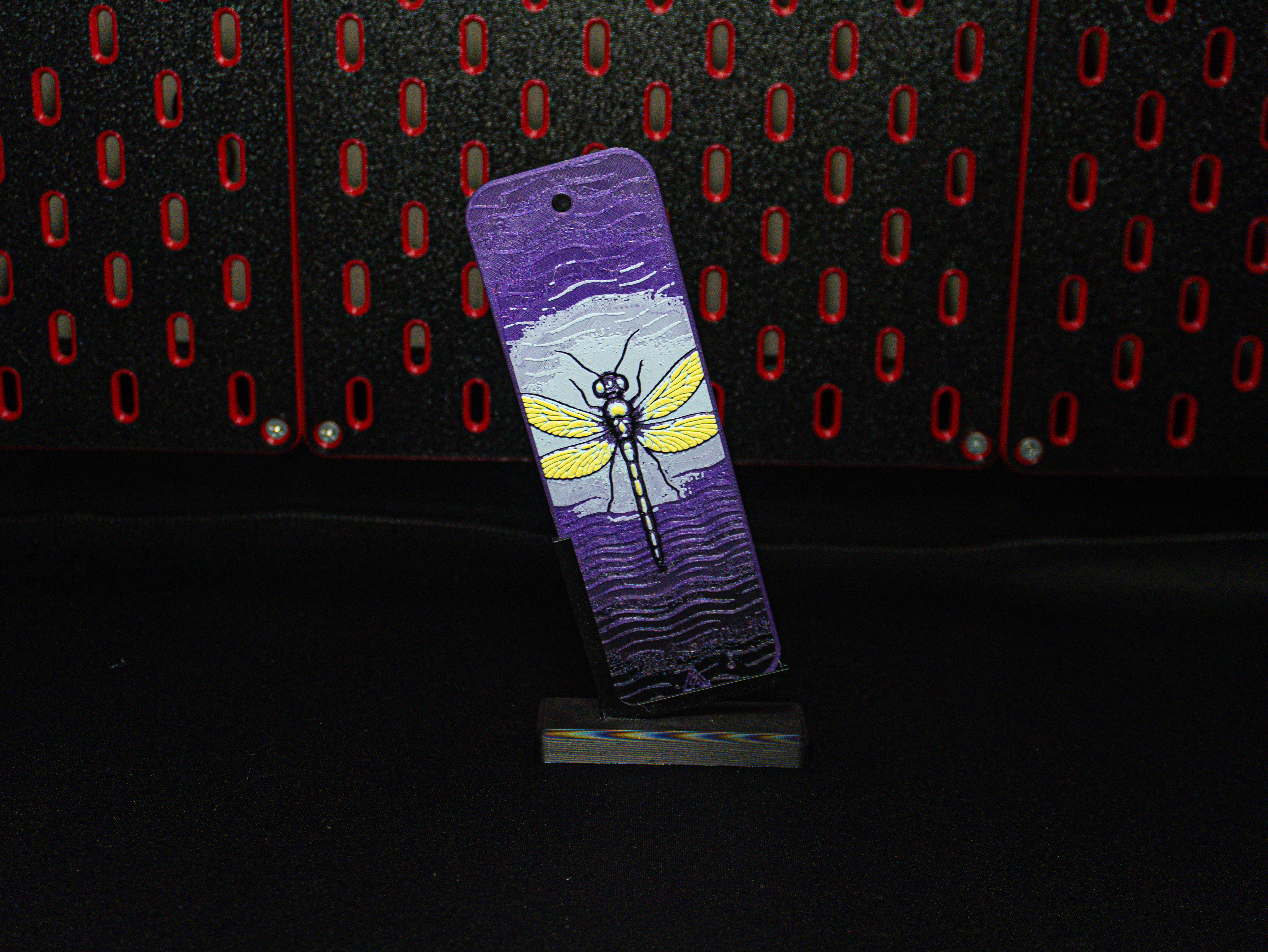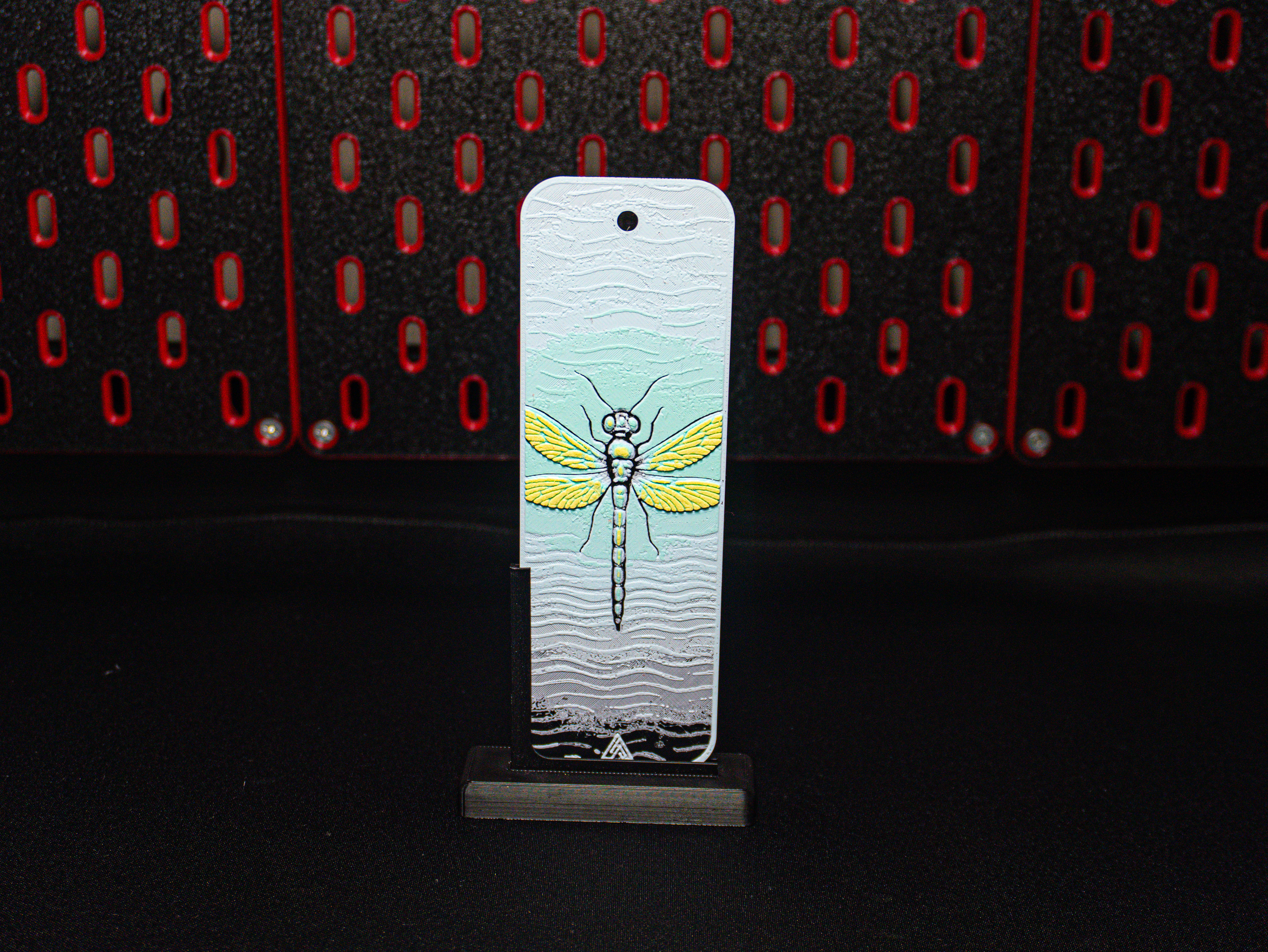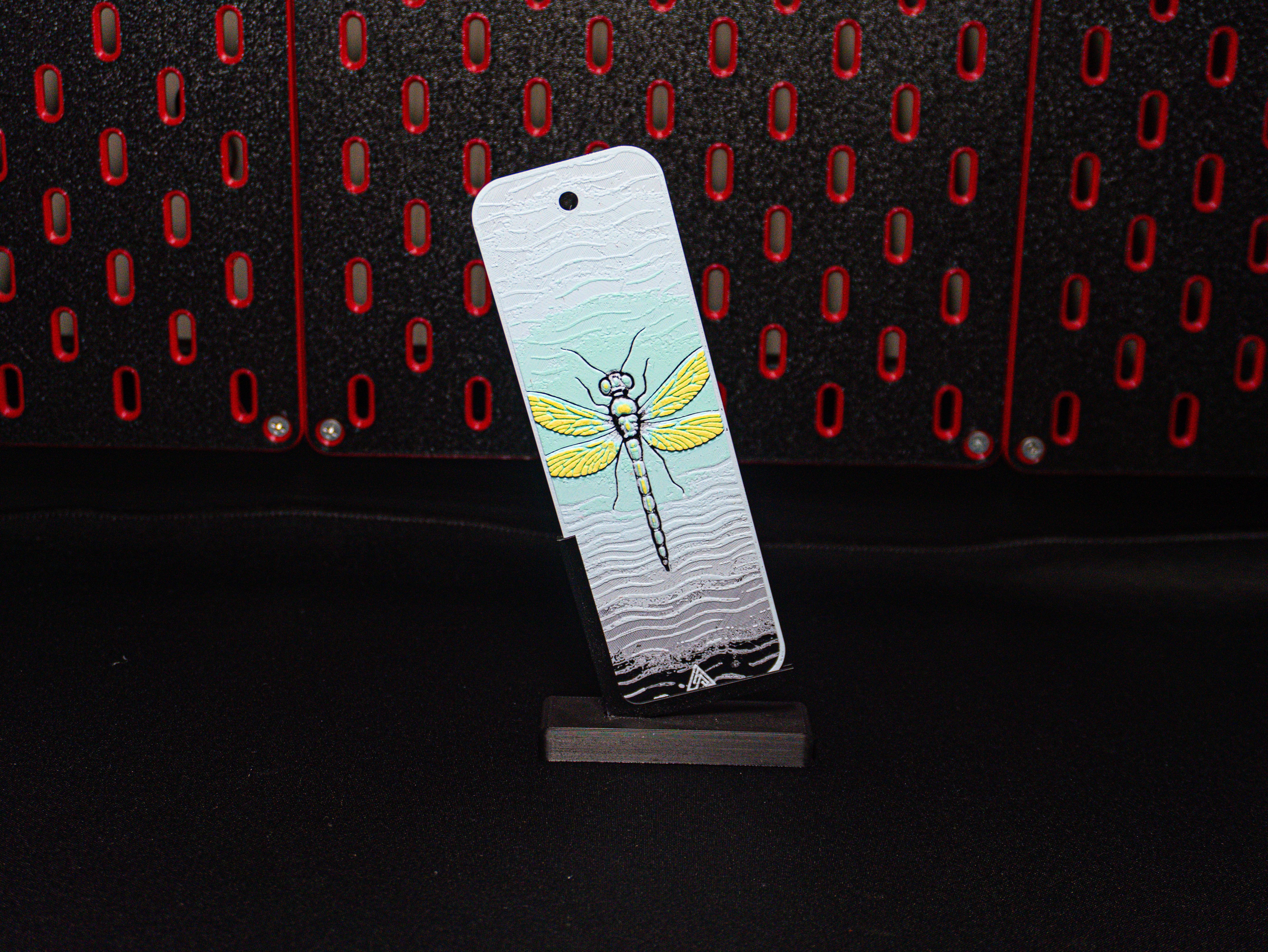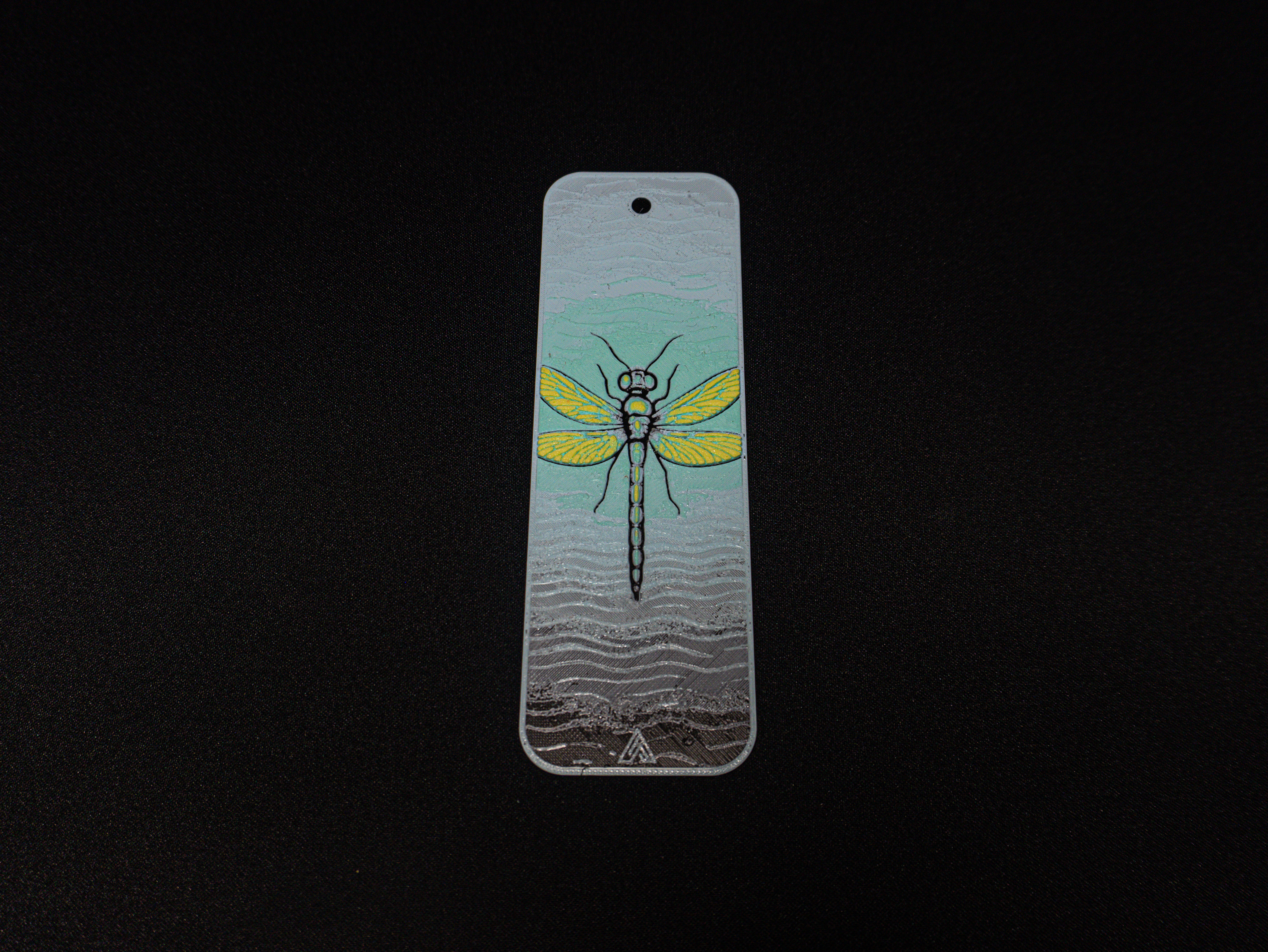 Bookmark Hueforge Dragonfly với hình chuồn chuồn cách điệu trên nền texture, tạo chiều sâu đẹp khi in. Thiết kế mỏng gọn giúp giữ trang sách an toàn, hợp dùng hằng ngày hoặc làm quà tặng tinh tế.