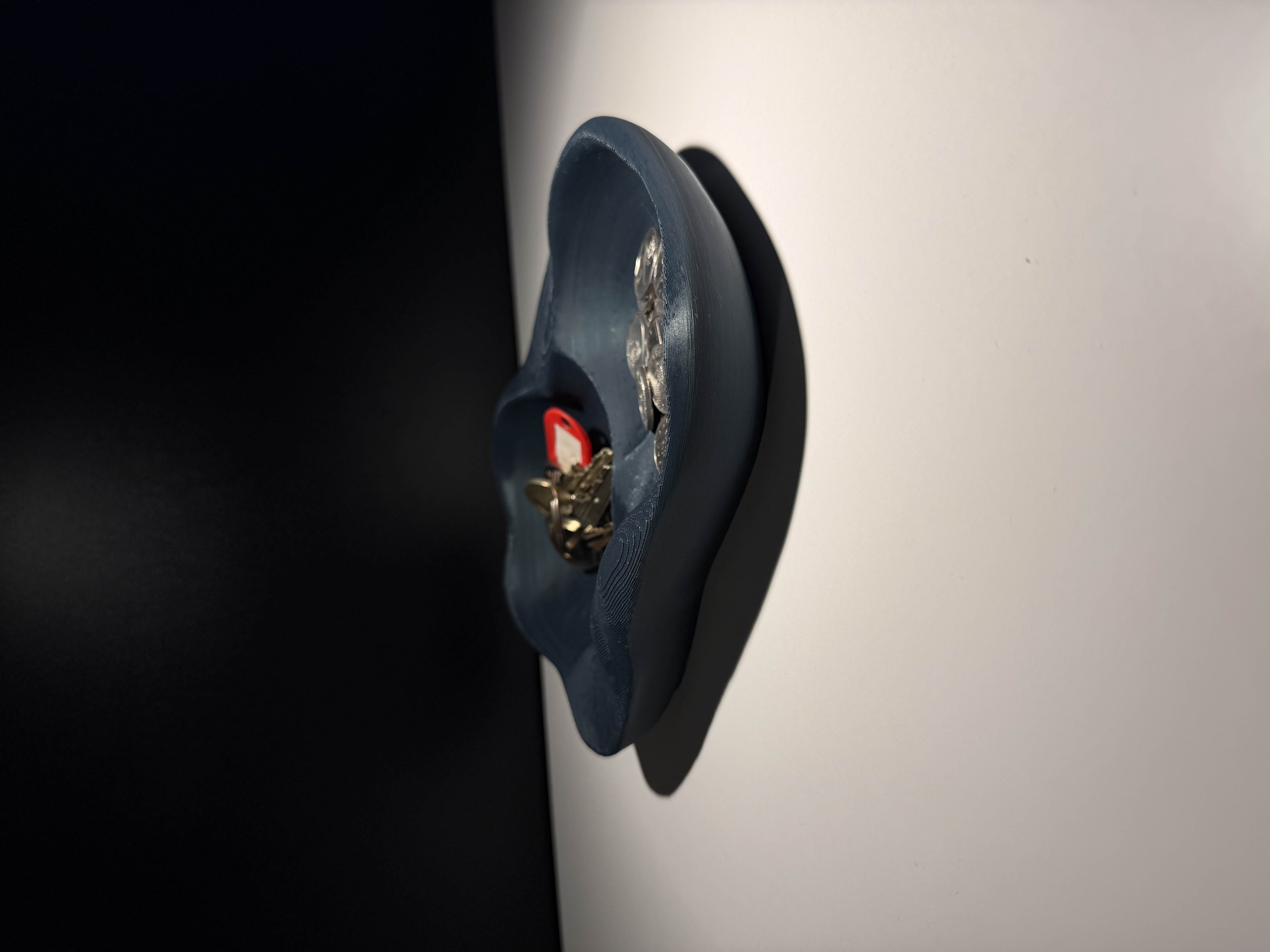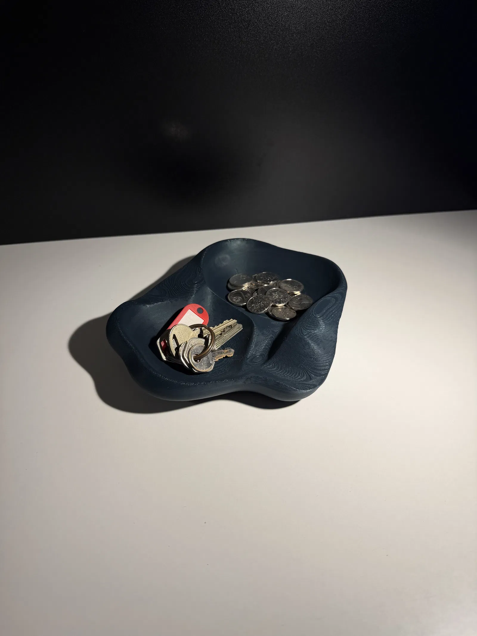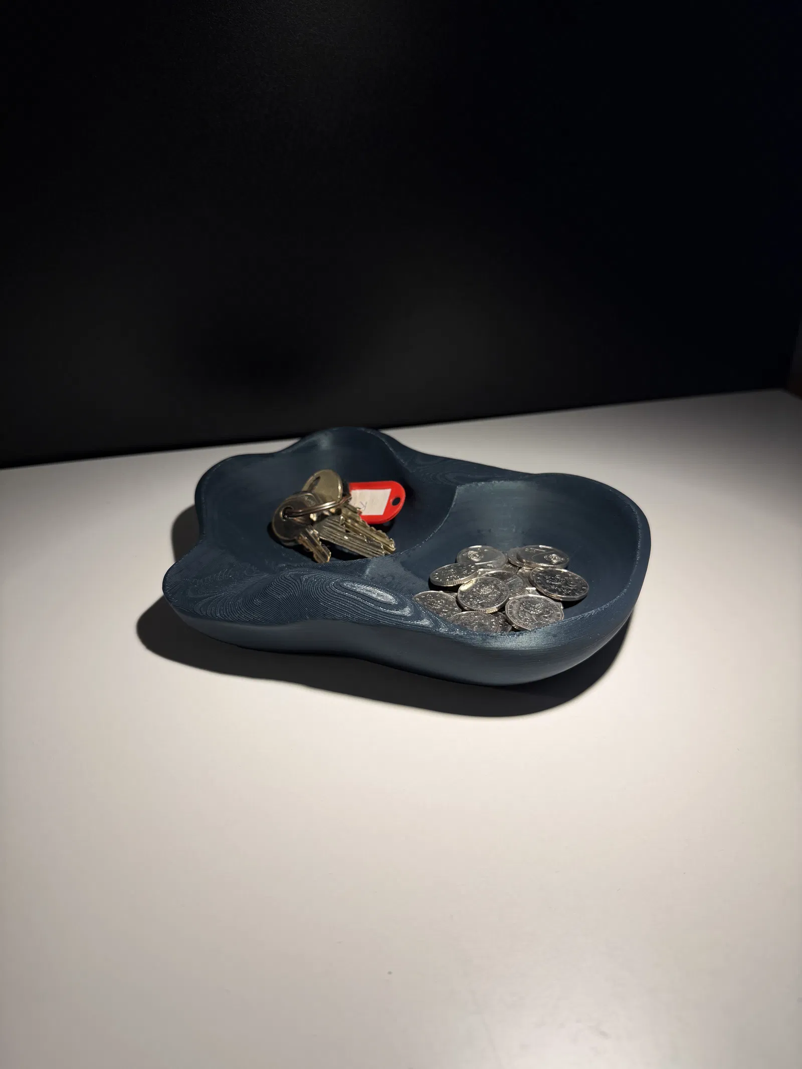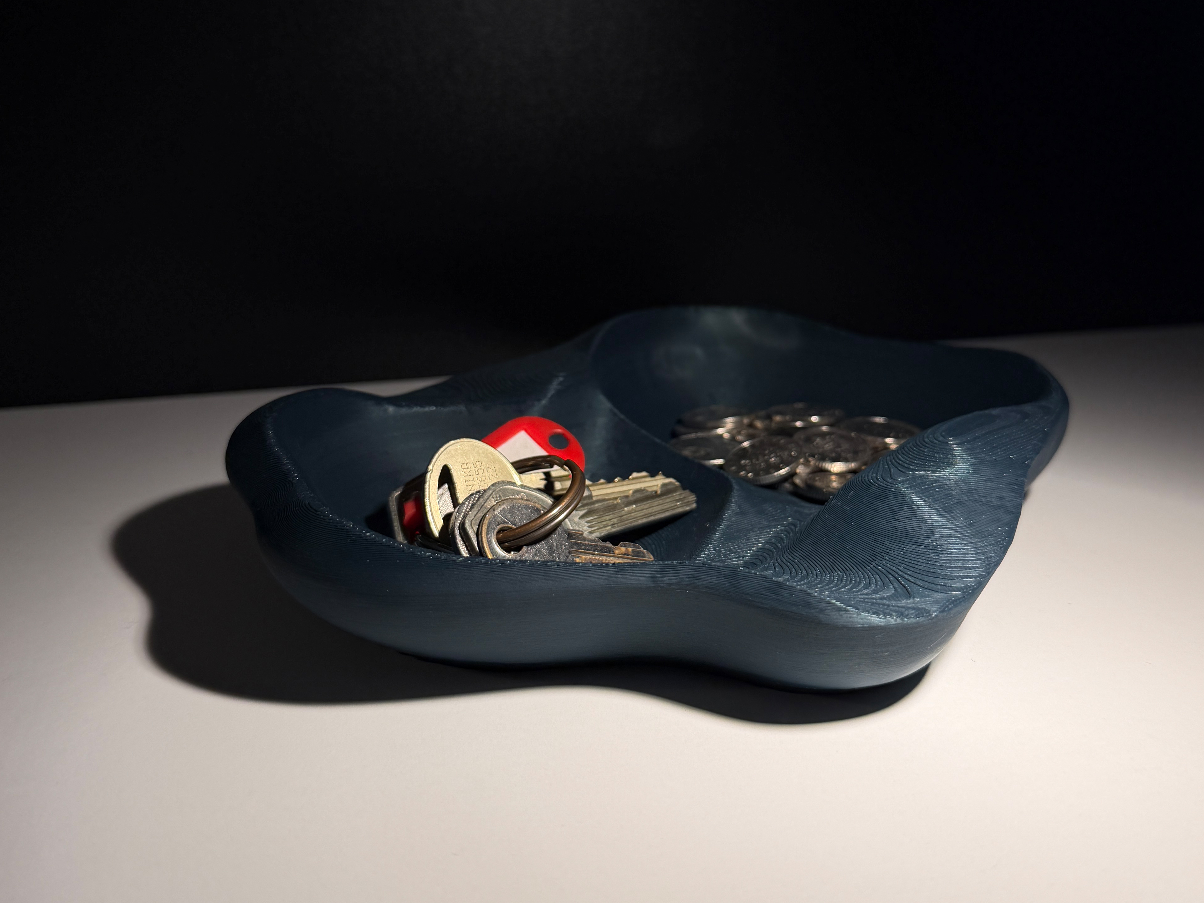 Catchall bowl lấy cảm hứng từ đá chạm khắc với dáng hữu cơ, cạnh bo mềm và vân bề mặt nhẹ. Phù hợp để đựng chìa khóa, tiền xu, đồ dùng hằng ngày; dùng được trên bàn, kệ hoặc khu vực entryway. Không cần supports.