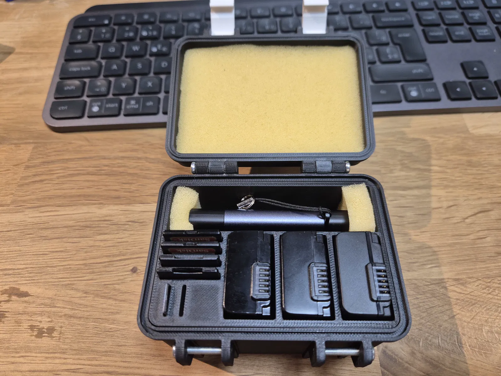 Hộp rugged gọn chắc để đựng 3 pin Nikon EN-EL25, 4 thẻ SD và 2 thẻ microSD. Khuyến nghị dùng ốc M3 cho độ fit chuẩn và thêm mút xốp ở nắp chống lắc. In PLA được, seal nên in TPU.