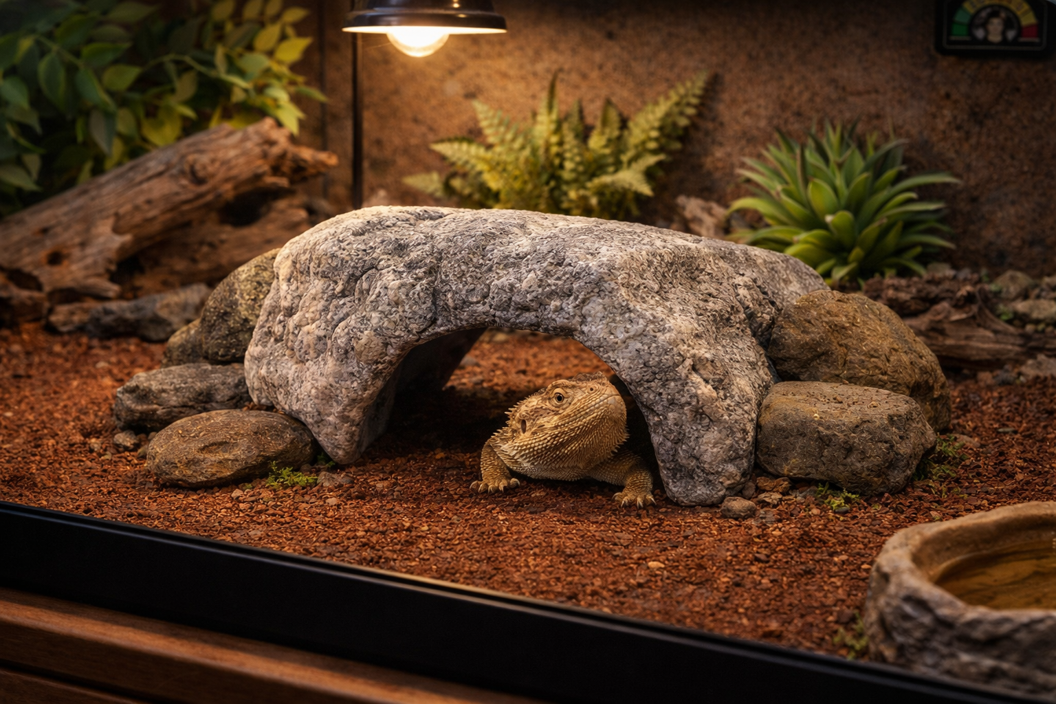Dáng vòm giúp bò sát di chuyển thoải mái xuyên qua nơi trú, đồng thời làm bố cục trong bể nhìn sinh động hơn. Phần đế vững giúp đặt vào chuồng dễ, hạn chế bị lật, và bề mặt texture kiểu đá cũng hợp với setup sa mạc, rừng, hoặc bioactive.
