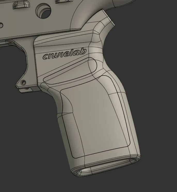 Tay cầm ergonomic ciwielab CSAG Pistol Grip cho chuẩn ngàm AR-pattern, thiết kế ôm tay và có điểm tựa cho ngón cái/ngón trỏ. Có 2 lựa chọn: bản beavertail hoặc bản flush; gợi ý dùng fuzzyskin trong slicer để tạo texture.