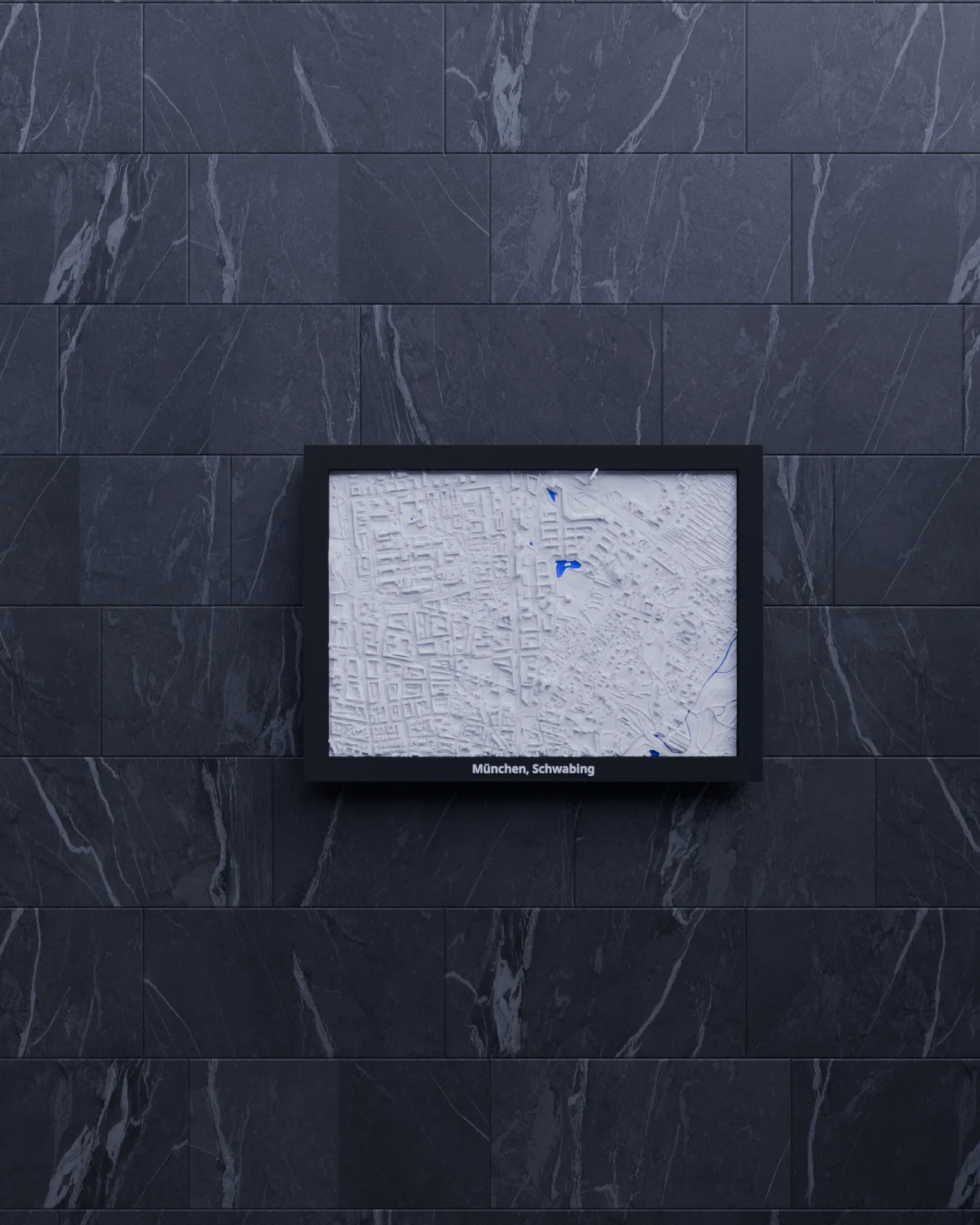 Bản thu nhỏ địa hình in 3D tái hiện khu vực München, Schwabing (Đức) từ dữ liệu địa lý, thu nhỏ từ 2.392 km x 1.671 km xuống 170.5 x 119.5 mm. Có nhiều frame kèm lỗ treo, phù hợp trưng bày và học tập.