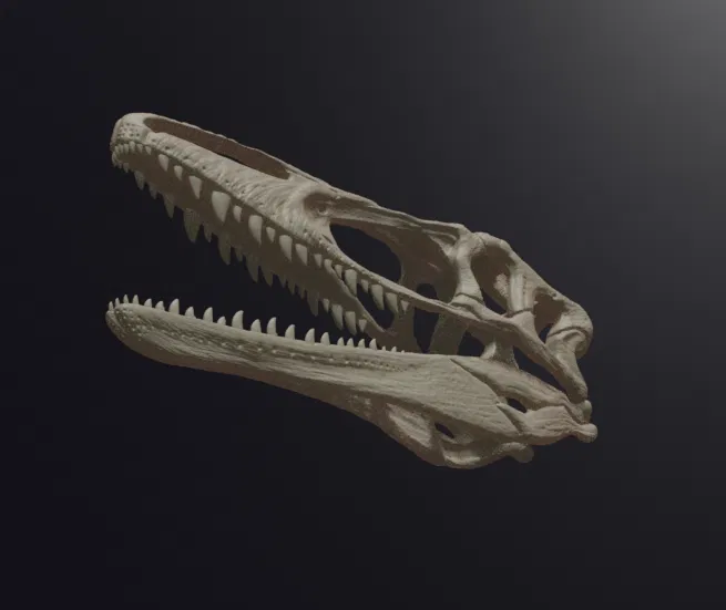 Mẫu hộp sọ Megaraptor Replica Skull chi tiết tỉ lệ 1:1 và 1:4. File STL nặng, phù hợp print bed 300mm^3; bản scale dễ in hơn. Khuyến nghị infill gyroid ≤15%, layer height ≤0.2 và dùng tree/organic supports.