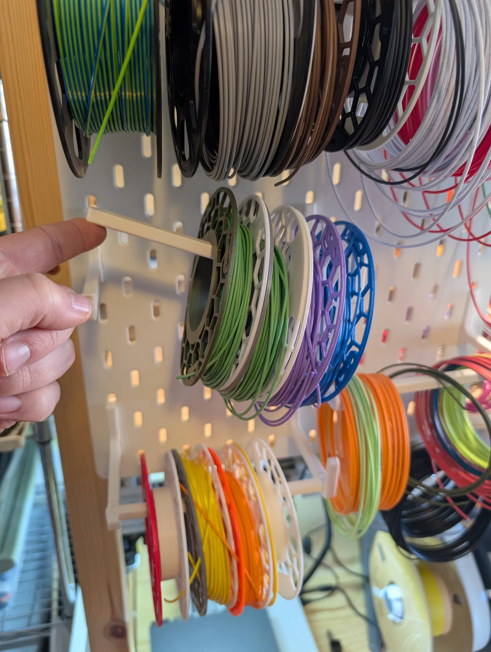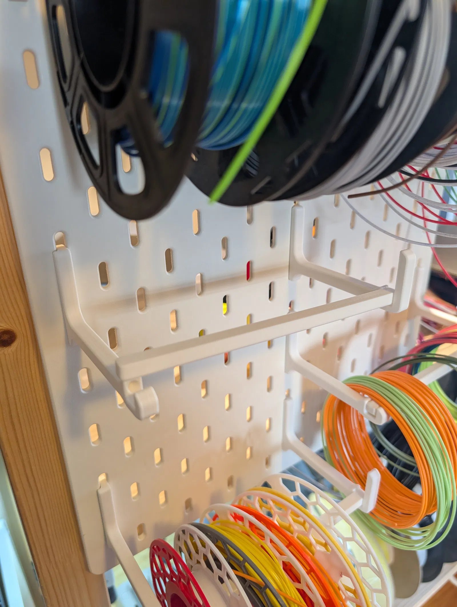 Giá treo Skadis dạng print-in-place cho mini spool và các đoạn filament thừa. Thiết kế đưa giá ra xa khỏi tấm board để dễ quan sát, dễ cấp filament thẳng vào máy in, đồng thời kéo dài đầu móc để tránh bị xoay mắc khi nhấc tay đòn.