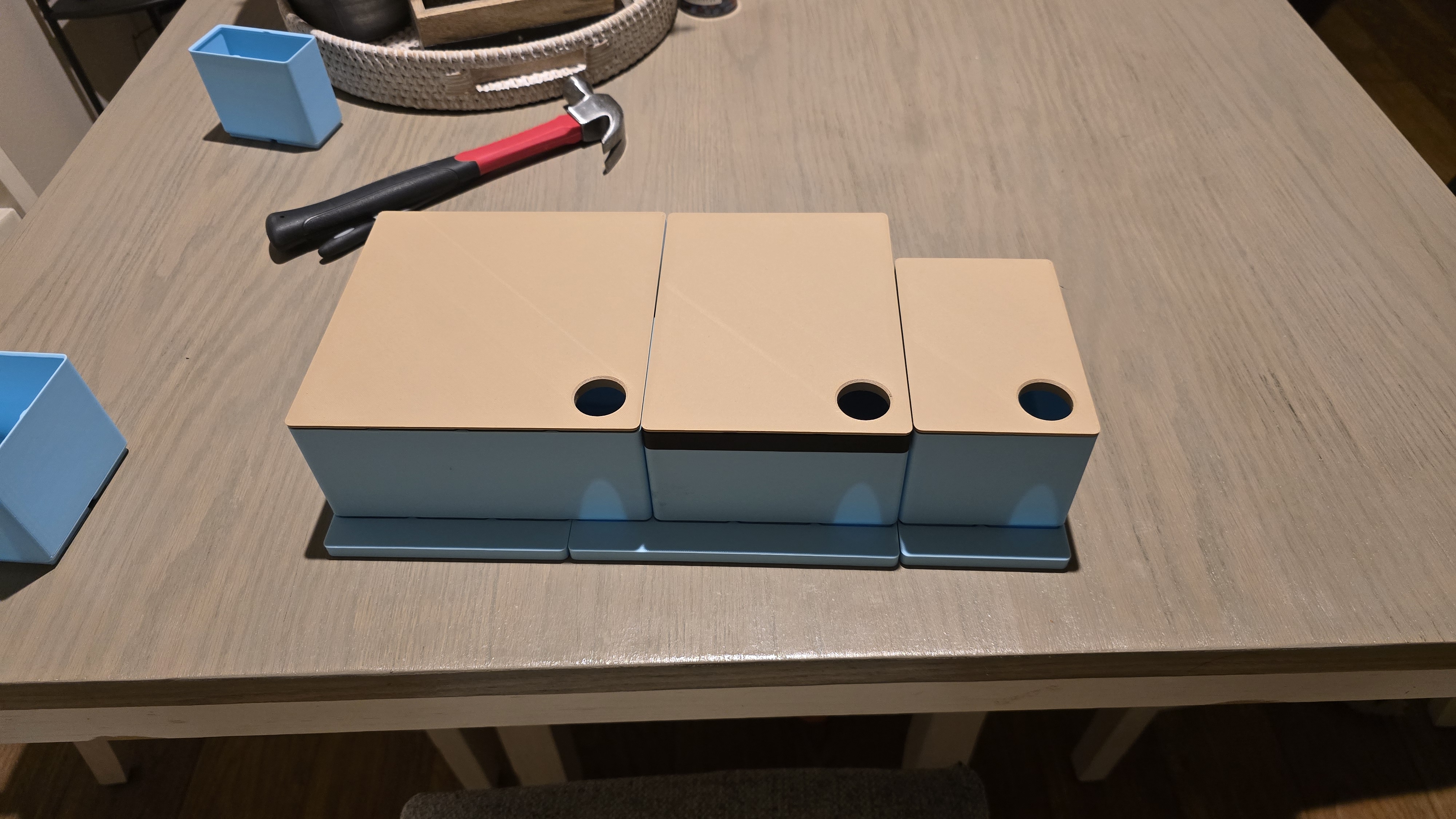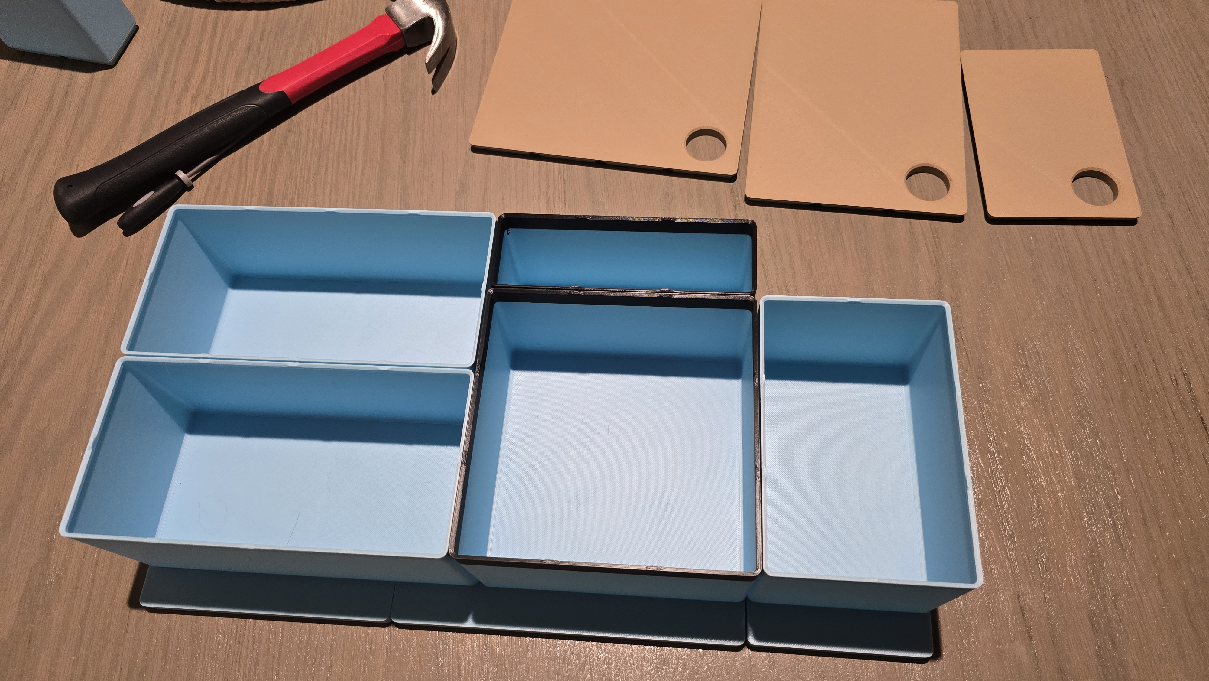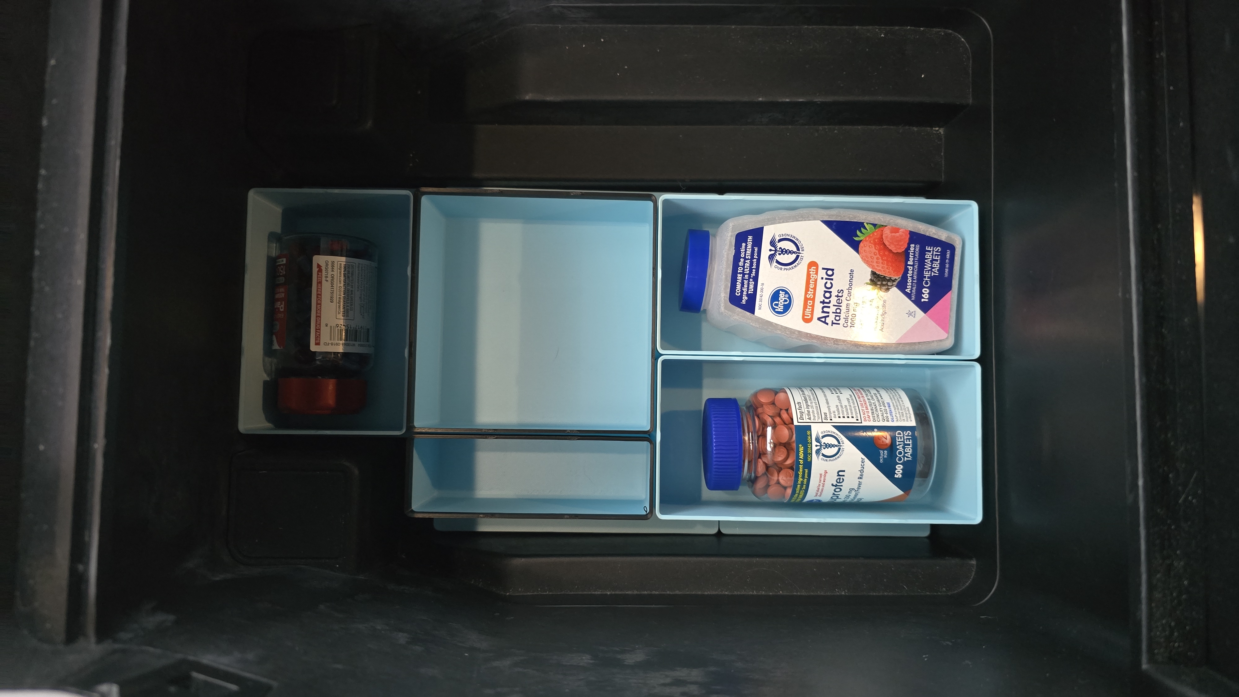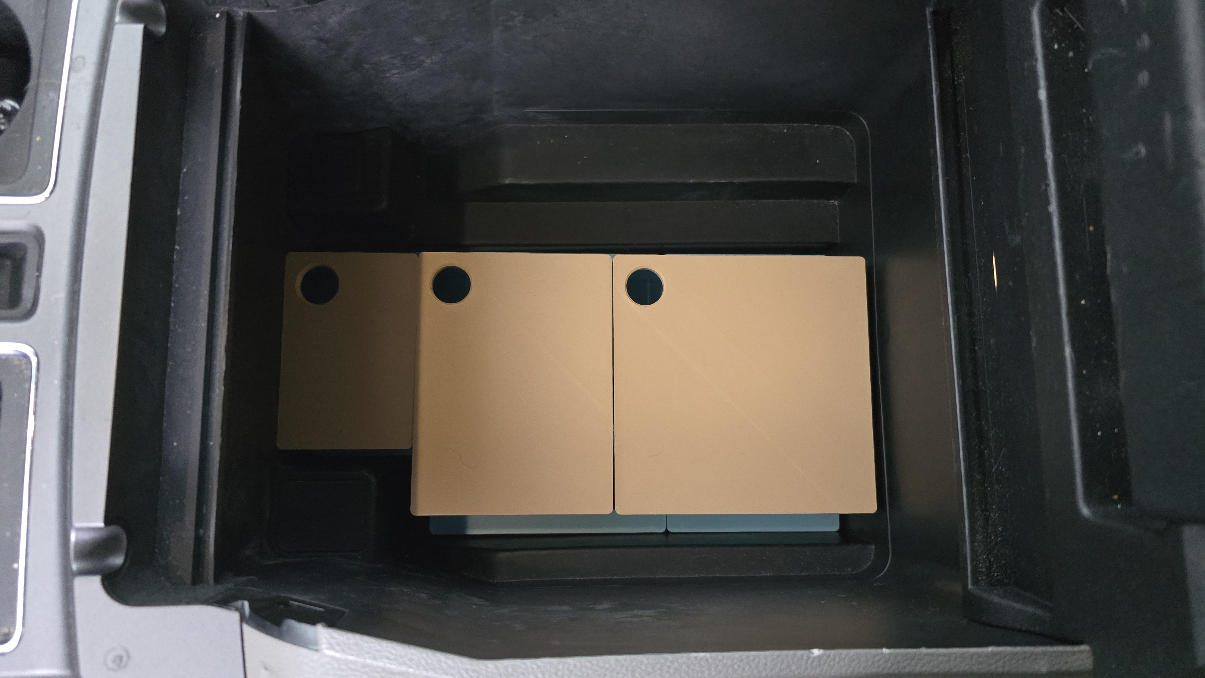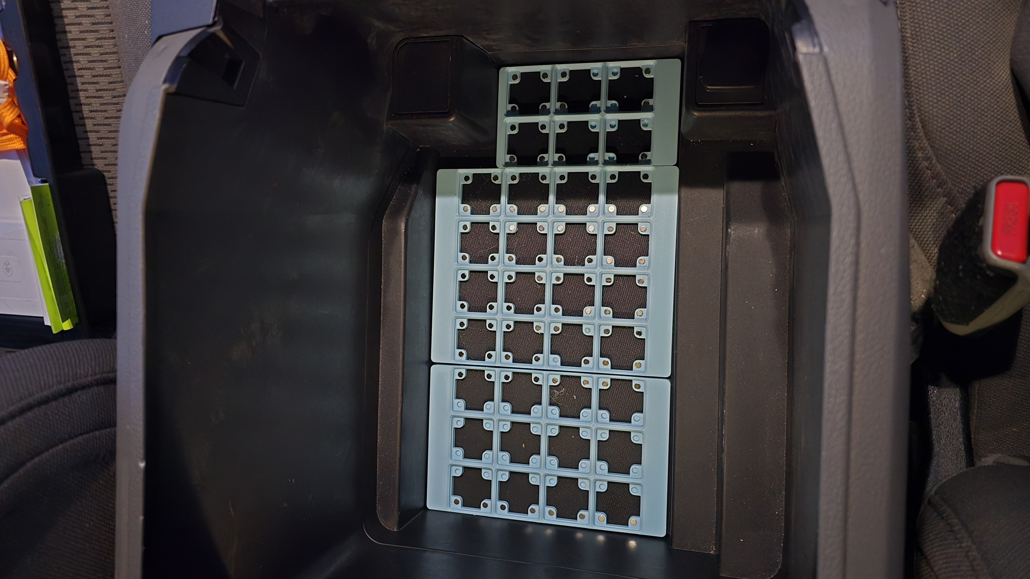 Mẫu này dùng pattern Gridfinity tiêu chuẩn để đặt vừa phần đáy của hộc center console, giúp bạn sắp xếp gọn gàng ngăn chứa đồ. Model có kèm nắp (lids) để bạn có thể đặt đồ lên trên hệ ngăn này, đảm bảo tận dụng tối đa dung tích chứa. Mình cũng dùng nam châm cho mẫu này (có thể hơi “dư” một chút) để giữ các khay (bins) bám vào baseplate, nhưng nếu bạn không gắn nam châm thì vẫn dùng bình thường. Mình hay để một vài loại thuốc trong xe nhưng không cần dùng thường xuyên, nên muốn có một hệ thống để giữ mọi thứ ngăn nắp, gọn khuất đi, mà khi cần thì vẫn lấy ra dễ dàng.