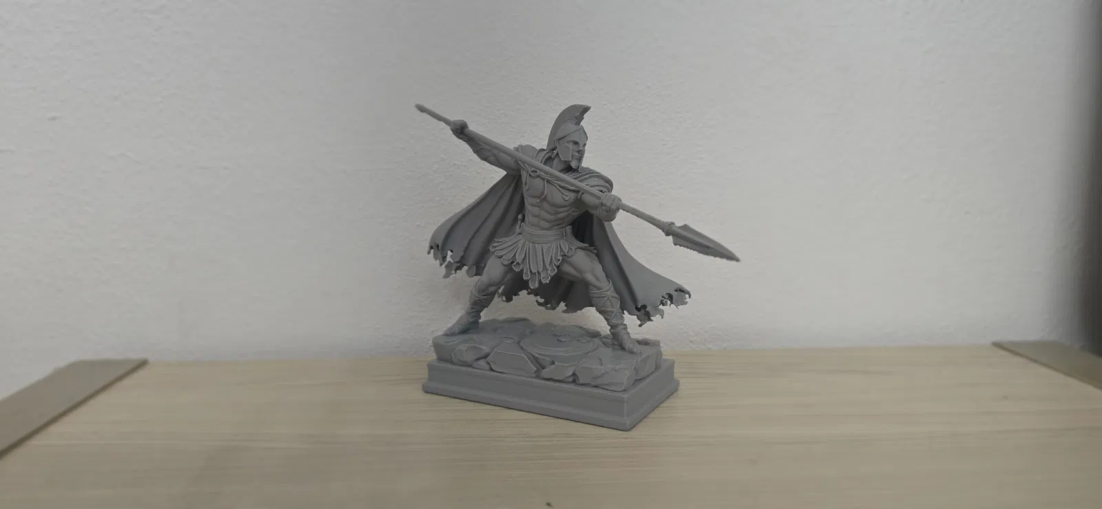 Mẫu mô hình chiến binh Spartan (hoplite) cổ đại cầm giáo, tạo dáng sẵn sàng xung trận. Phù hợp in 3D làm figurine/miniature trưng bày, sưu tầm lịch sử, hoặc trang trí bàn làm việc.