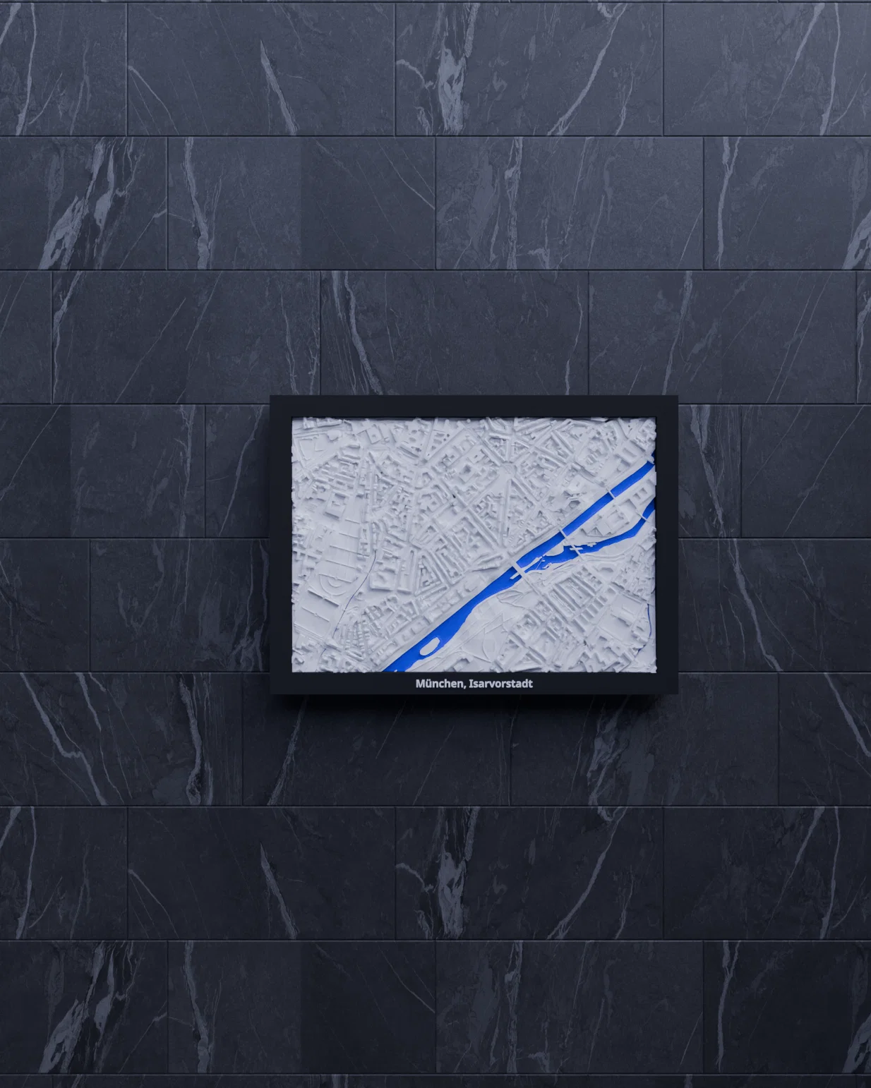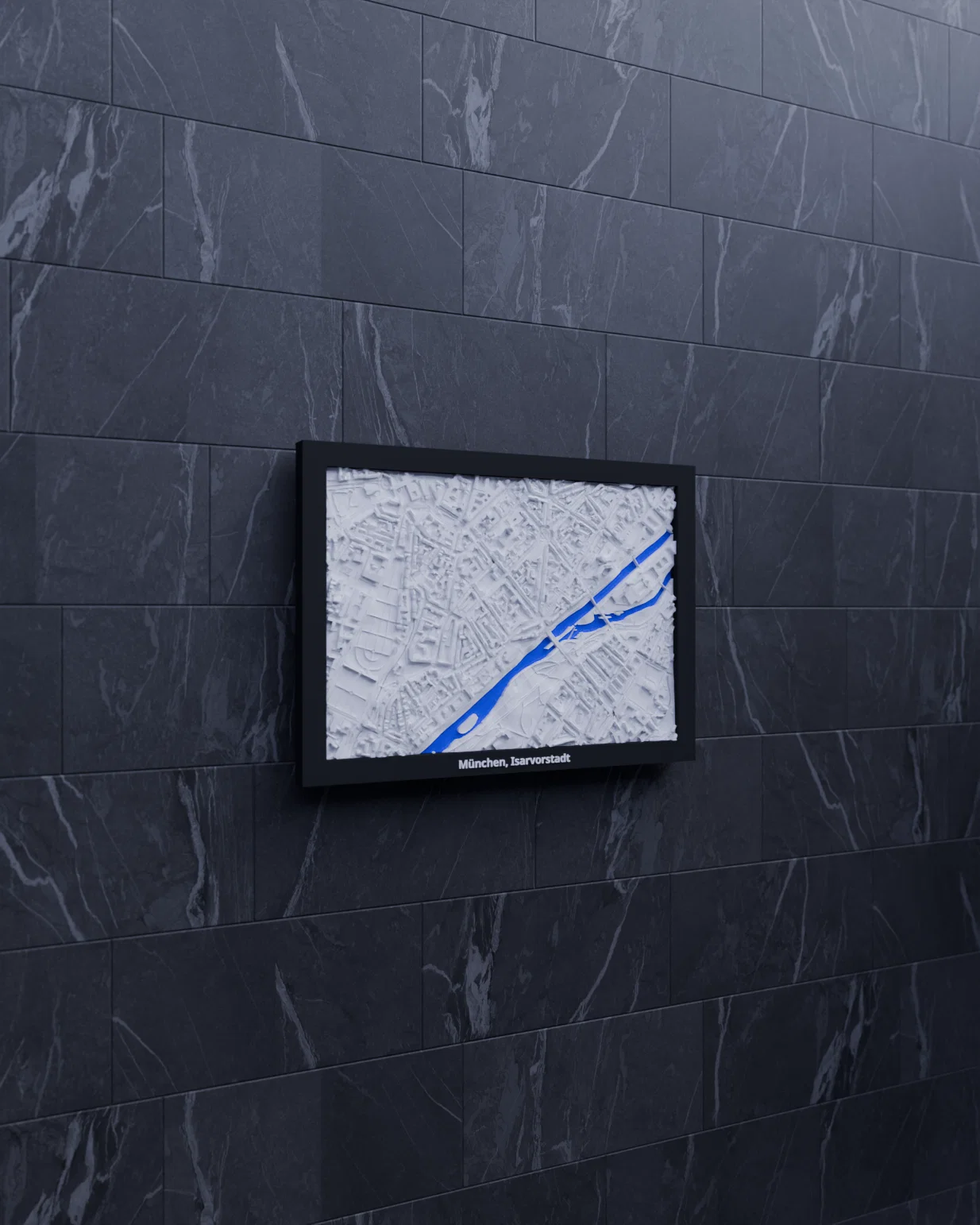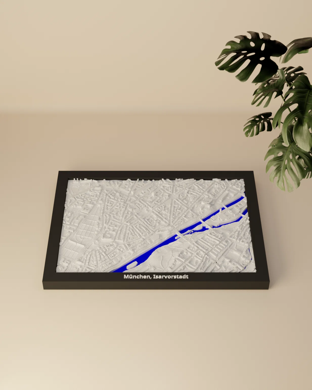 Mô hình thu nhỏ địa hình 3D tái hiện München, Isarvorstadt (Đức) từ dữ liệu địa lý, kích thước 170.5×119.5 mm, tỷ lệ ~10019:1. Phù hợp trưng bày, học tập, hoặc làm decor; có sẵn nhiều frame kèm lỗ treo.