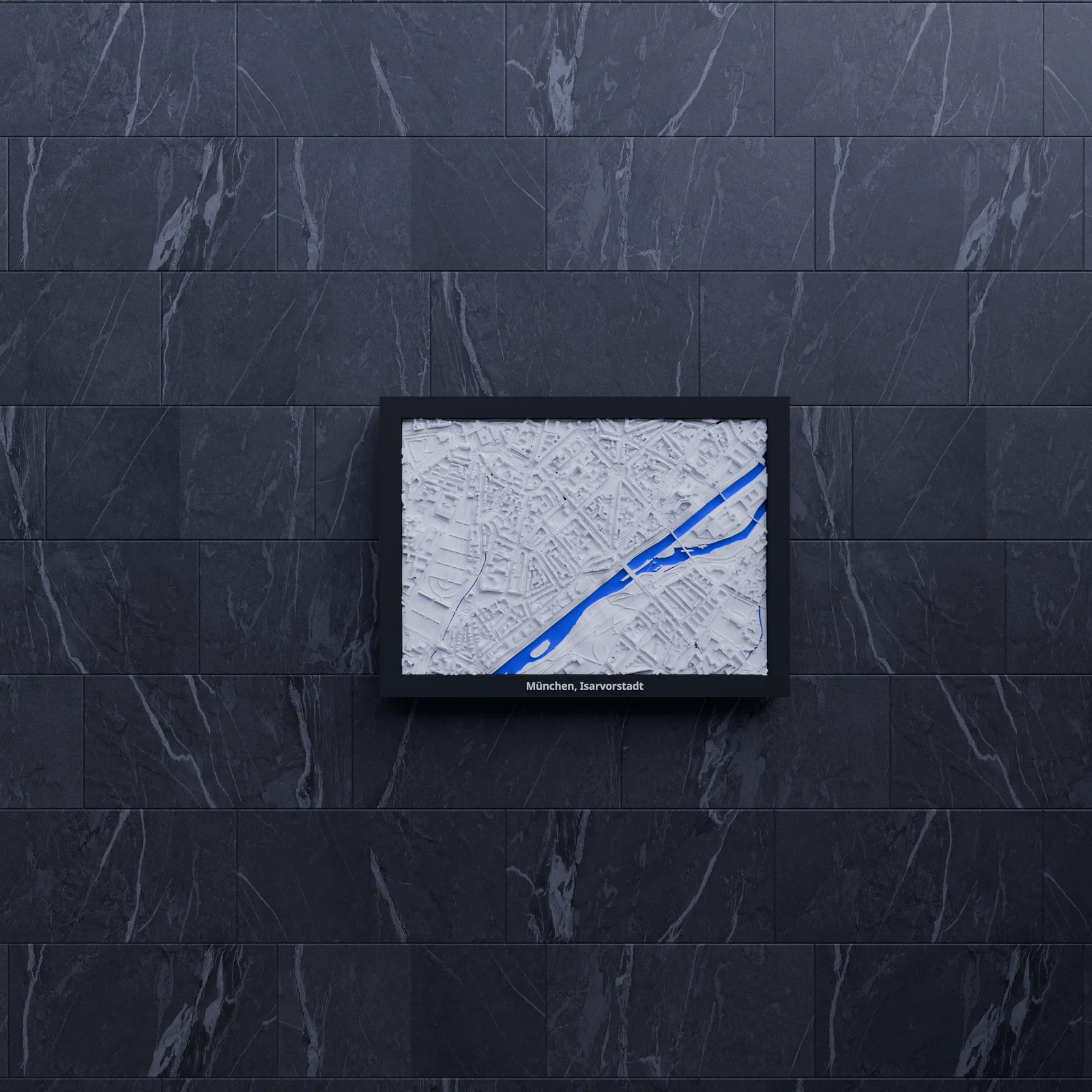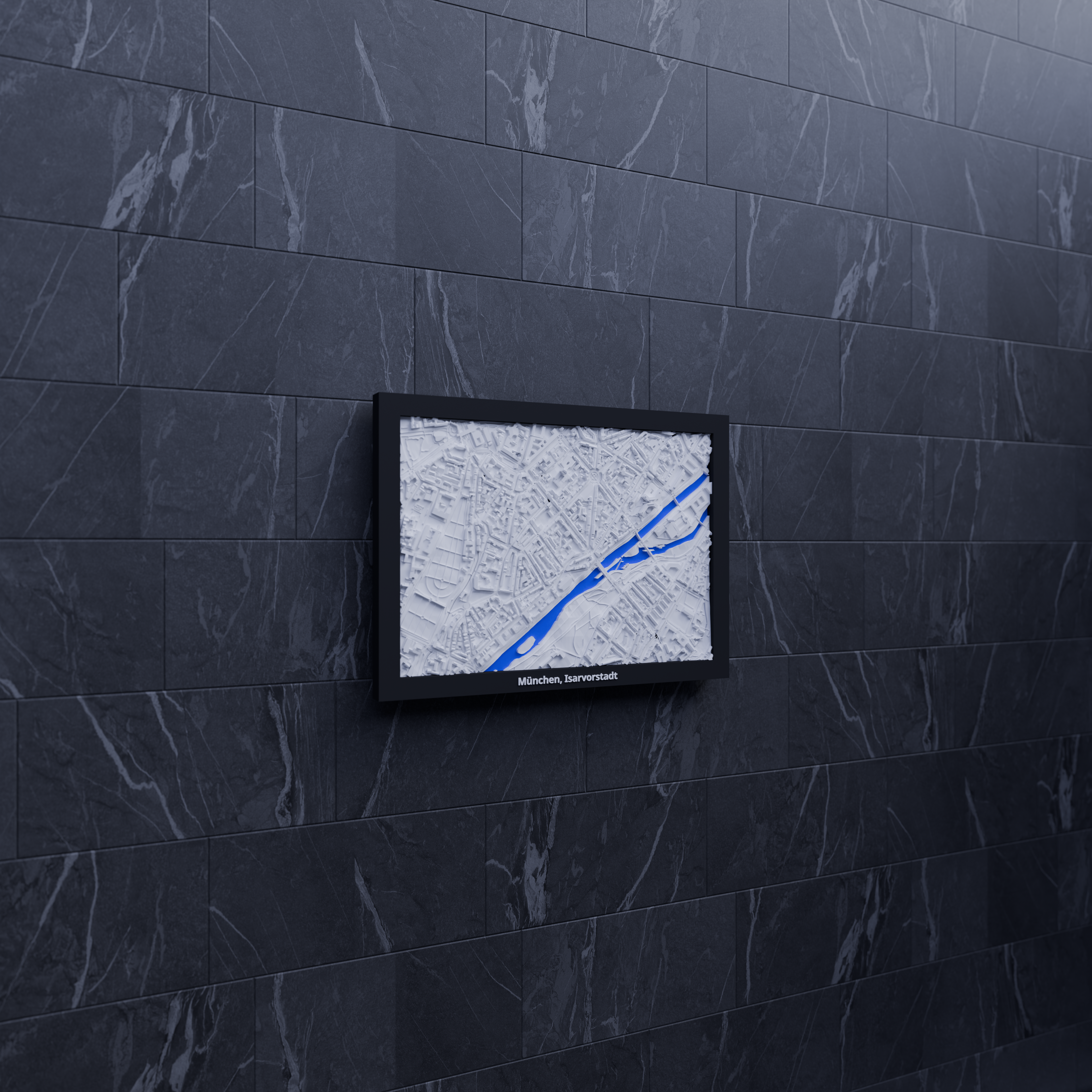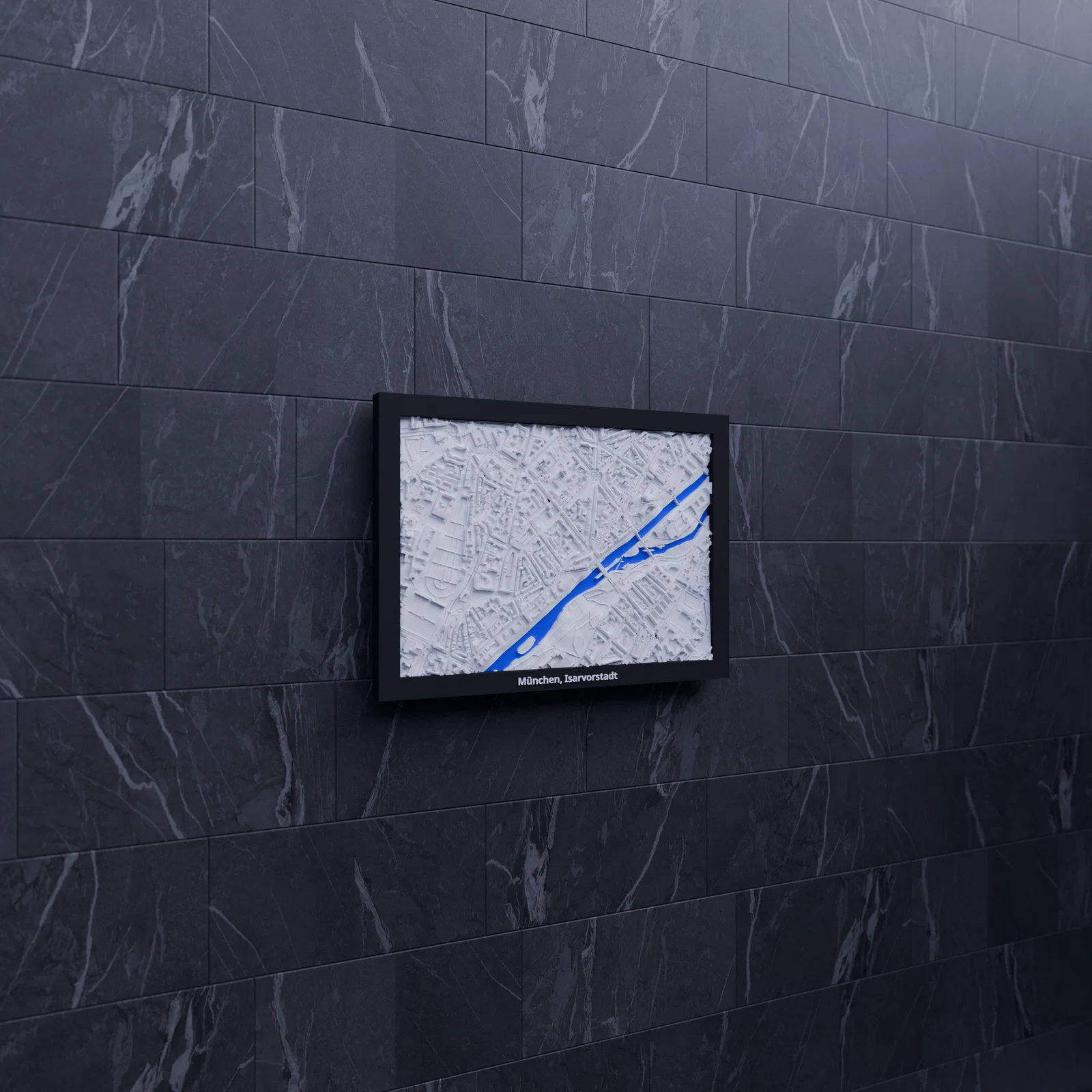 Mô hình thu nhỏ địa hình 3D tái hiện München, Isarvorstadt (Đức) từ dữ liệu địa lý, kích thước 170.5×119.5 mm, tỷ lệ ~10019:1. Phù hợp trưng bày, học tập, hoặc làm decor; có sẵn nhiều frame kèm lỗ treo.