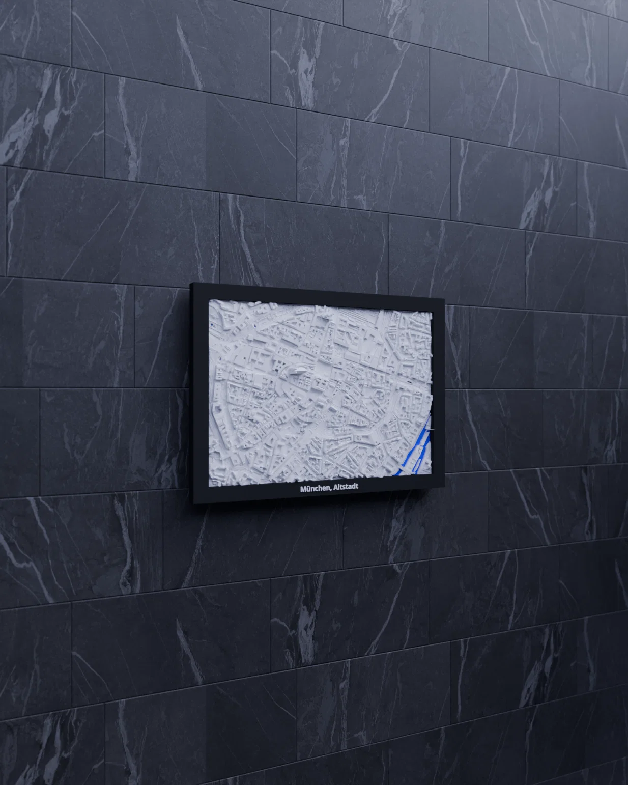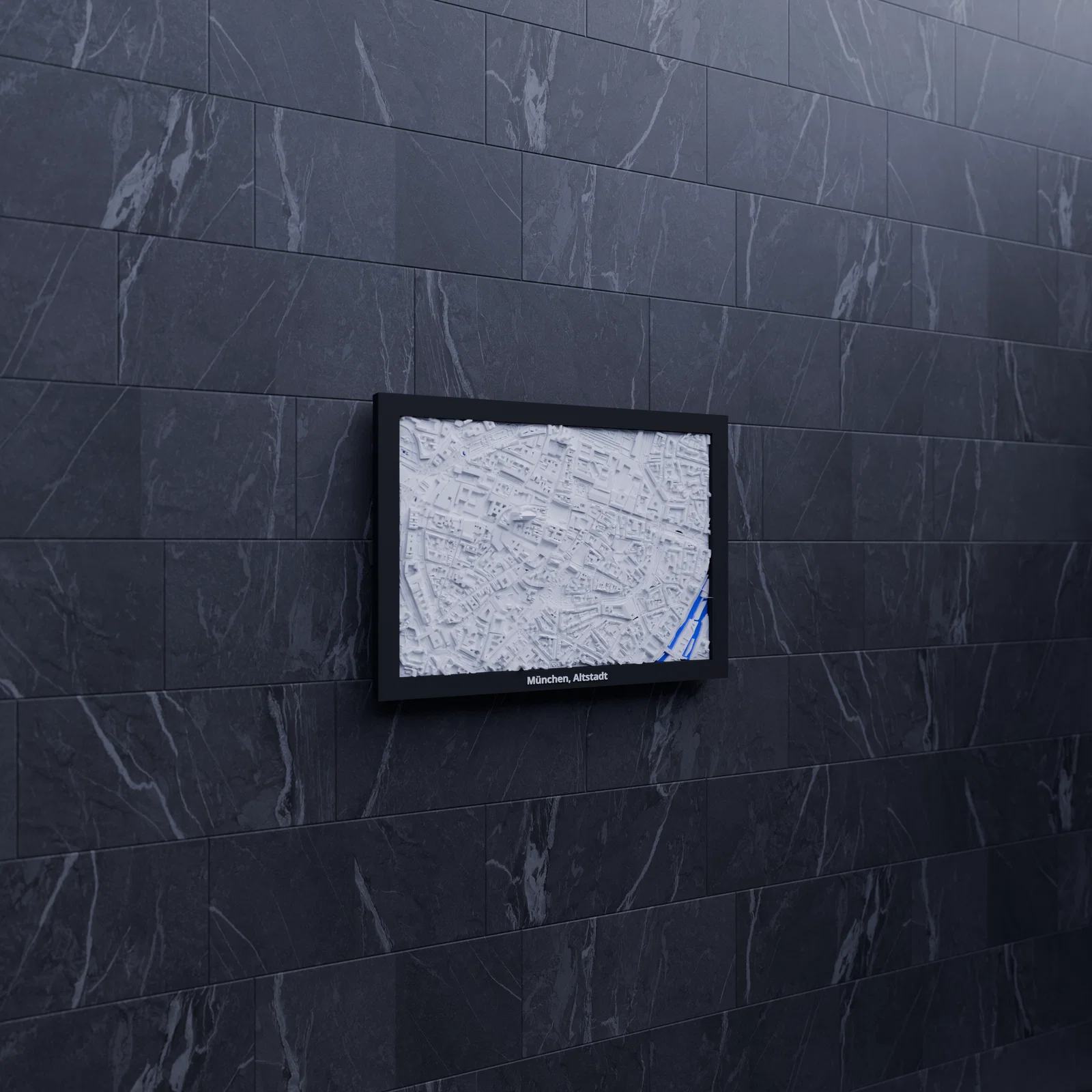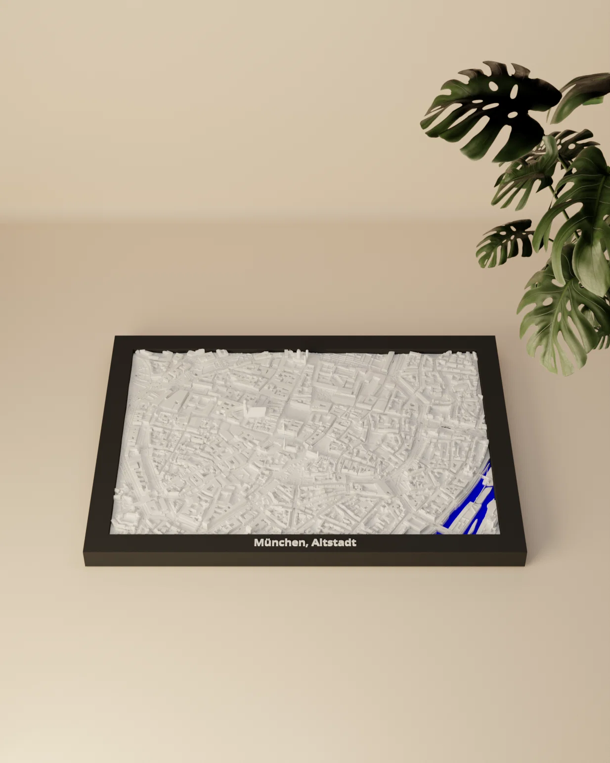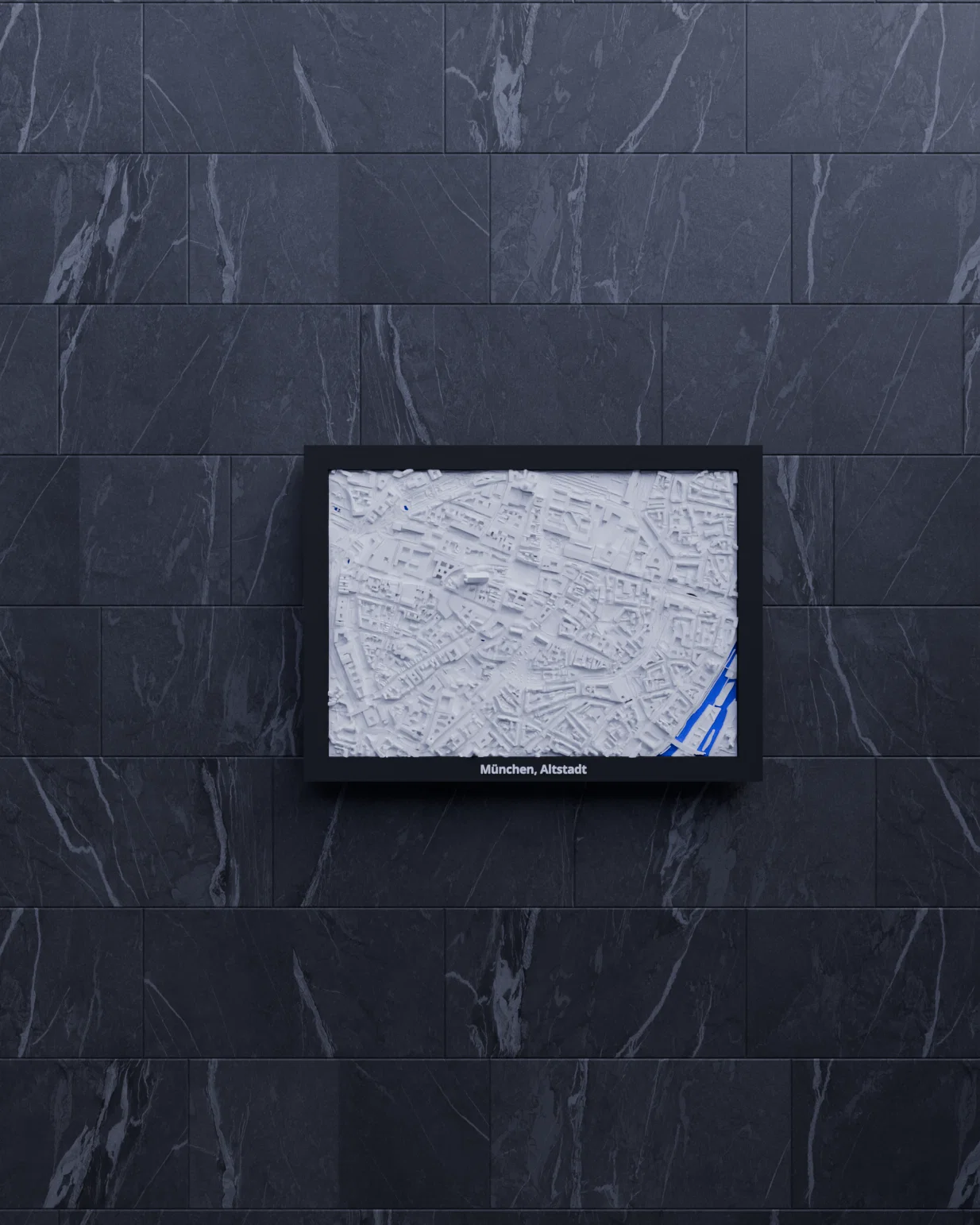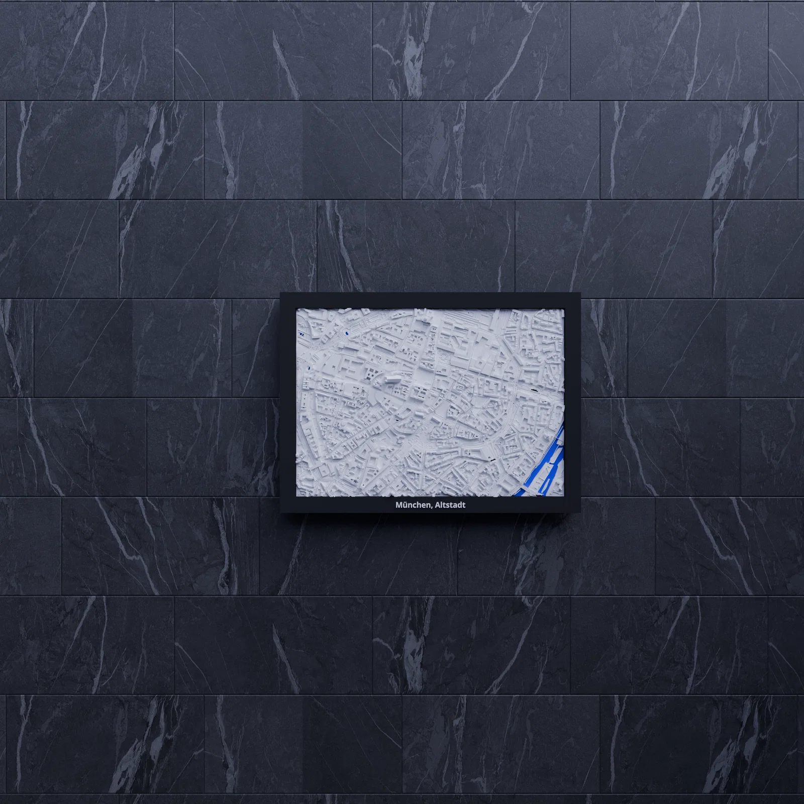 Mô hình topographic thu nhỏ tái hiện khu vực München, Altstadt (Đức) từ dữ liệu địa lý, tỷ lệ ~10220:1, kích thước 170.5×119.5 mm. Có nhiều lựa chọn frame kèm lỗ treo, phù hợp trang trí, học tập và trưng bày.