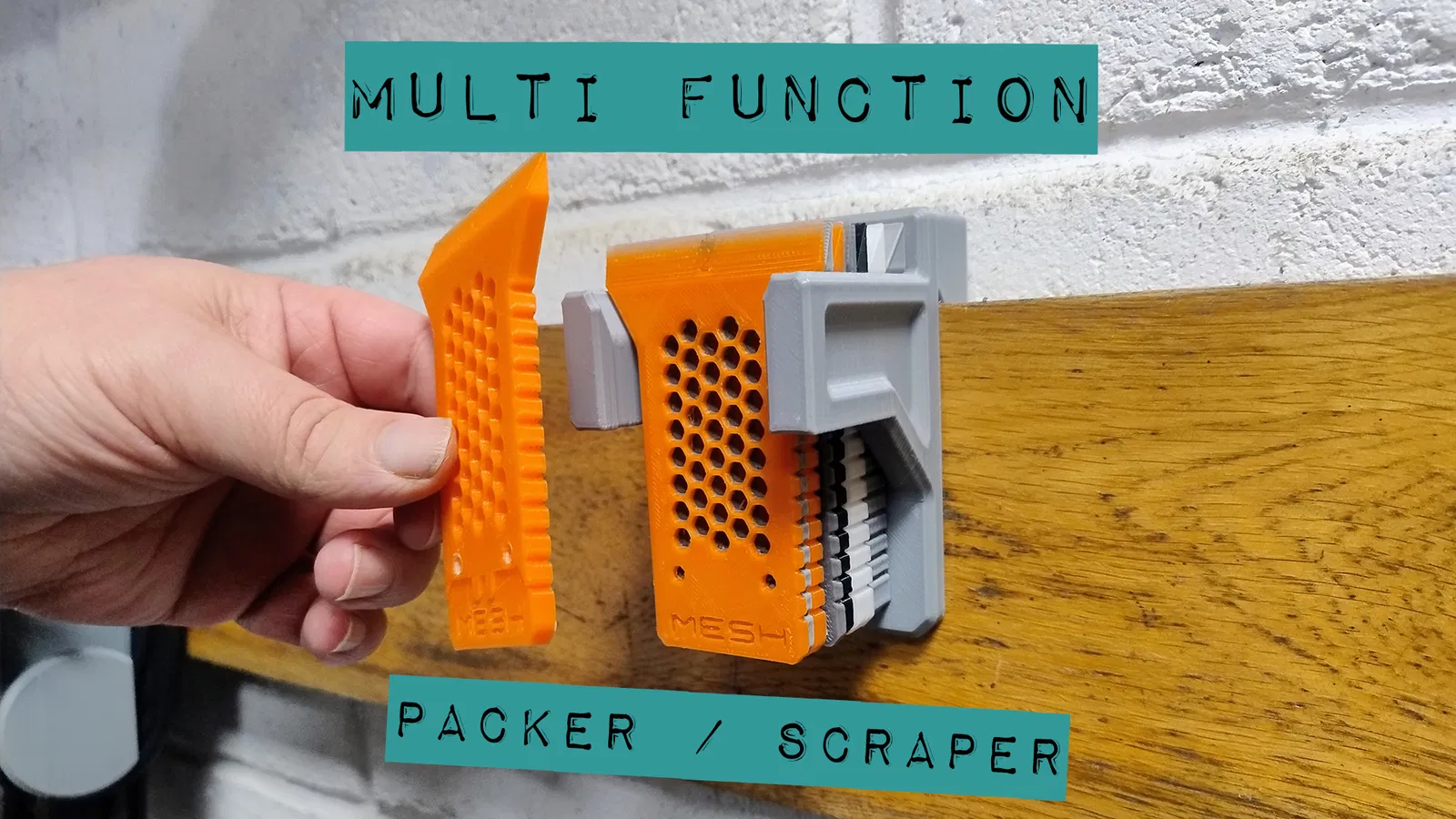 Packer/shim đa năng cho workshop: vừa làm shim/packer có lỗ giữa, vừa là plastic scraper, vừa là utility blade holder (2 ốc), kèm thước spacer tham chiếu nhanh. In PLA ít tốn filament, hợp dùng filament cuối cuộn.