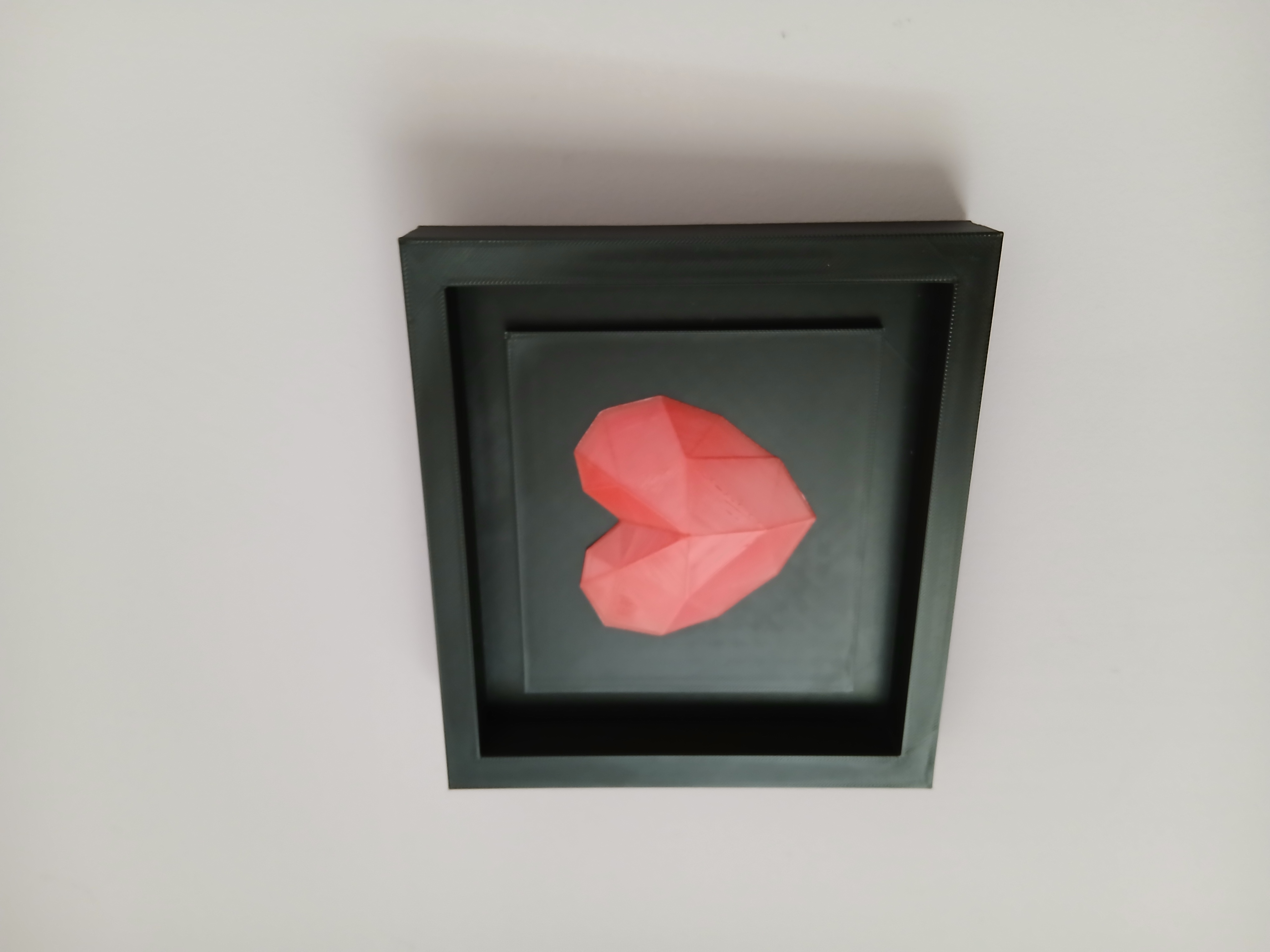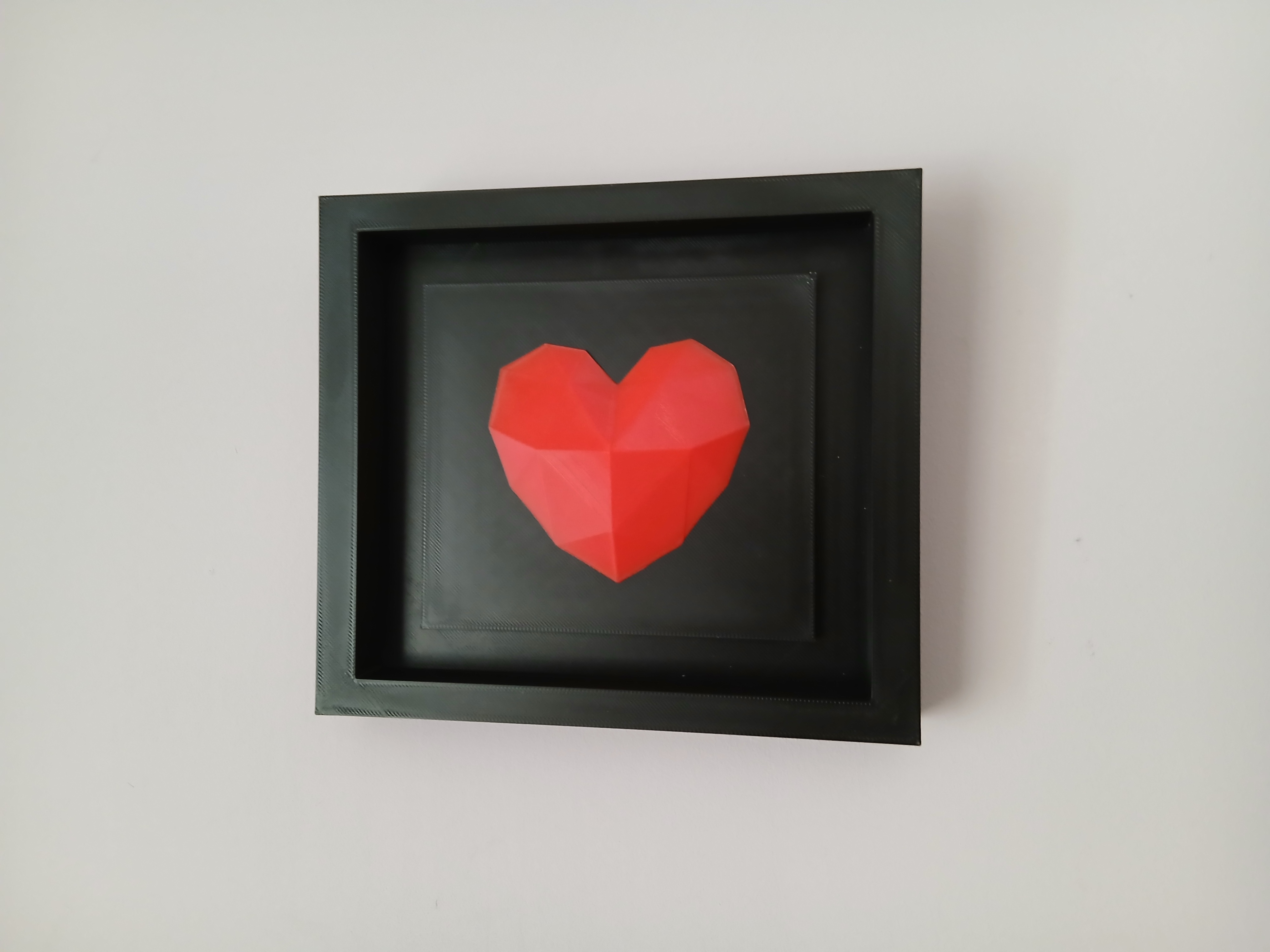 Thiết kế trái tim dạng đa giác tạo hiệu ứng phản chiếu ánh sáng đẹp mắt, cho cảm giác có chiều sâu và nhìn “premium” hơn. Phần khung hoàn thiện tổng thể, nhìn như một tác phẩm hoàn chỉnh vừa in xong là trưng được liền.