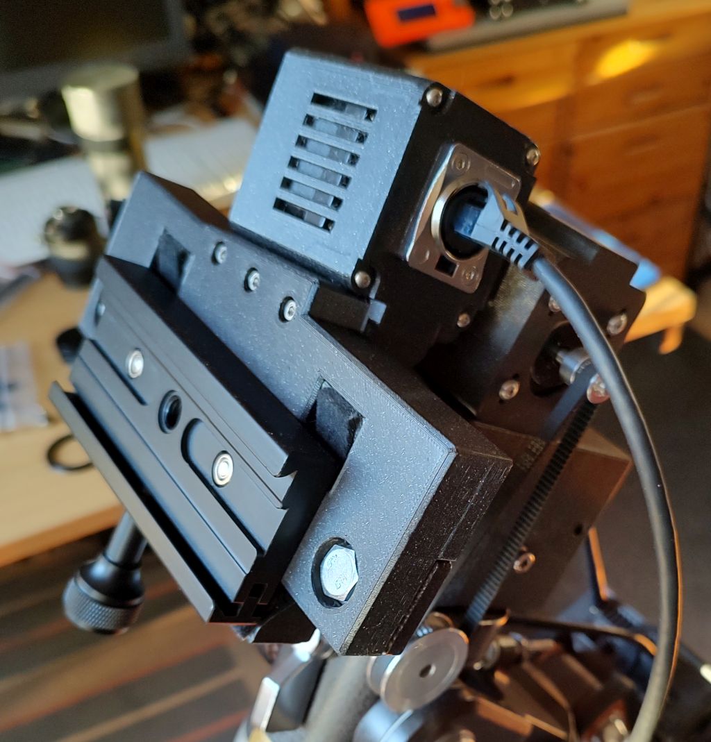 Để gắn bát motor DEC, phần gá/đế kẹp ống kính (telescope saddle) được bổ sung thêm một kết cấu nâng. Do New Polaris chỉ tải được quang học nhẹ (nặng hơn là không phù hợp), ở đây bố trí kẹp Arca-Swiss để gá.