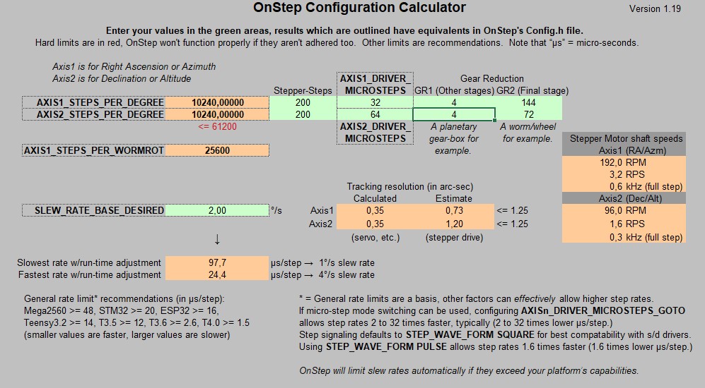 Tỉ số truyền của ngàm New Polaris là 144:1 cho trục RA và 72:1 cho trục DEC. Ví dụ tính toán cho OnStep có trong phần hình ảnh.