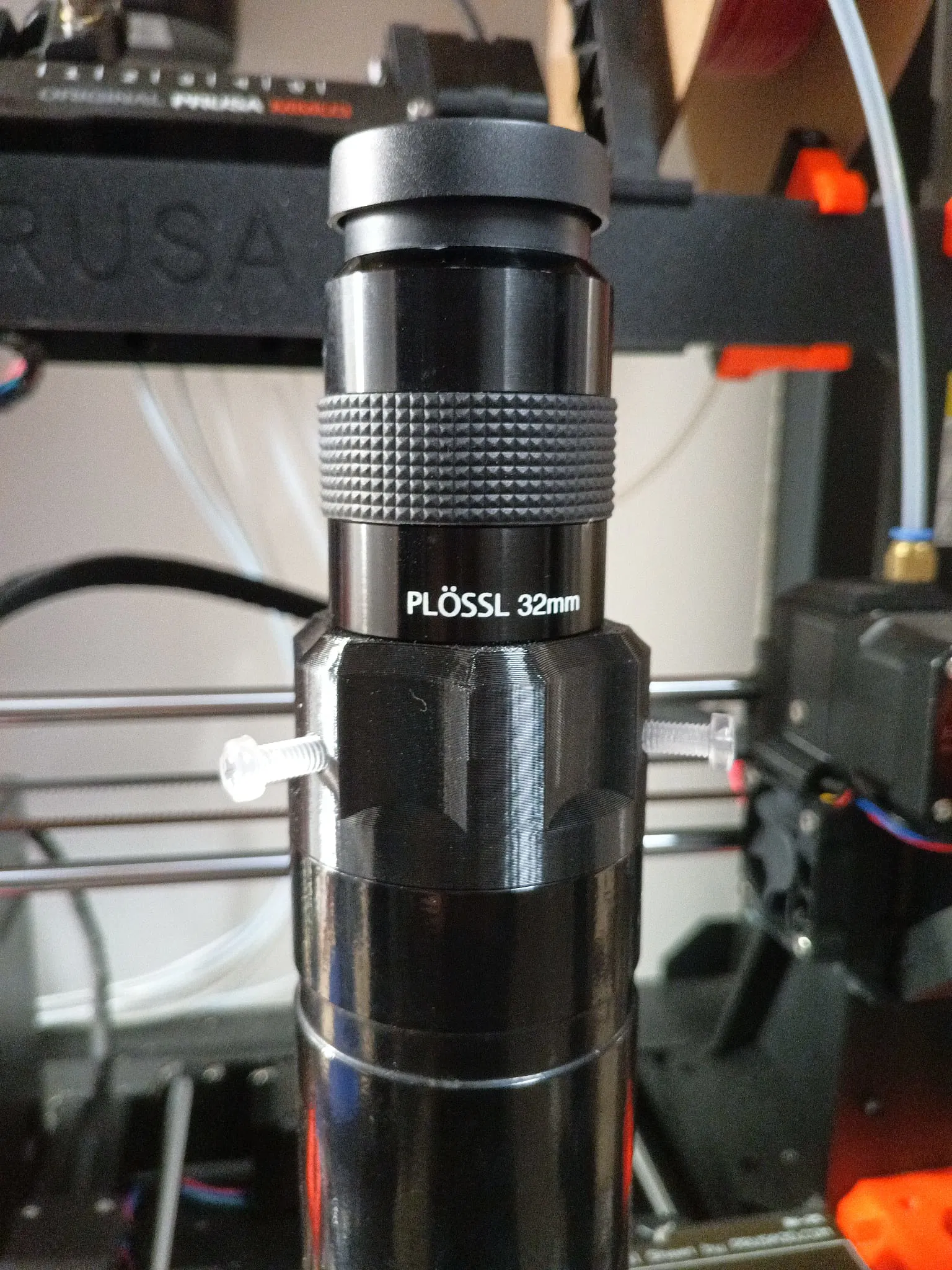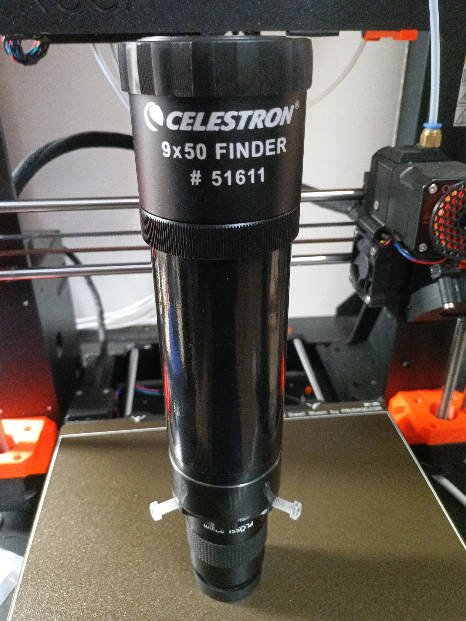 Adapter thị kính 1.25" dùng cho finder scope Celestron/SkyWatcher 9x50. Gợi ý in: 4 perimeter, có ren (thread), layer height 0.1 mm để lên ren mịn và chắc chắn khi lắp.