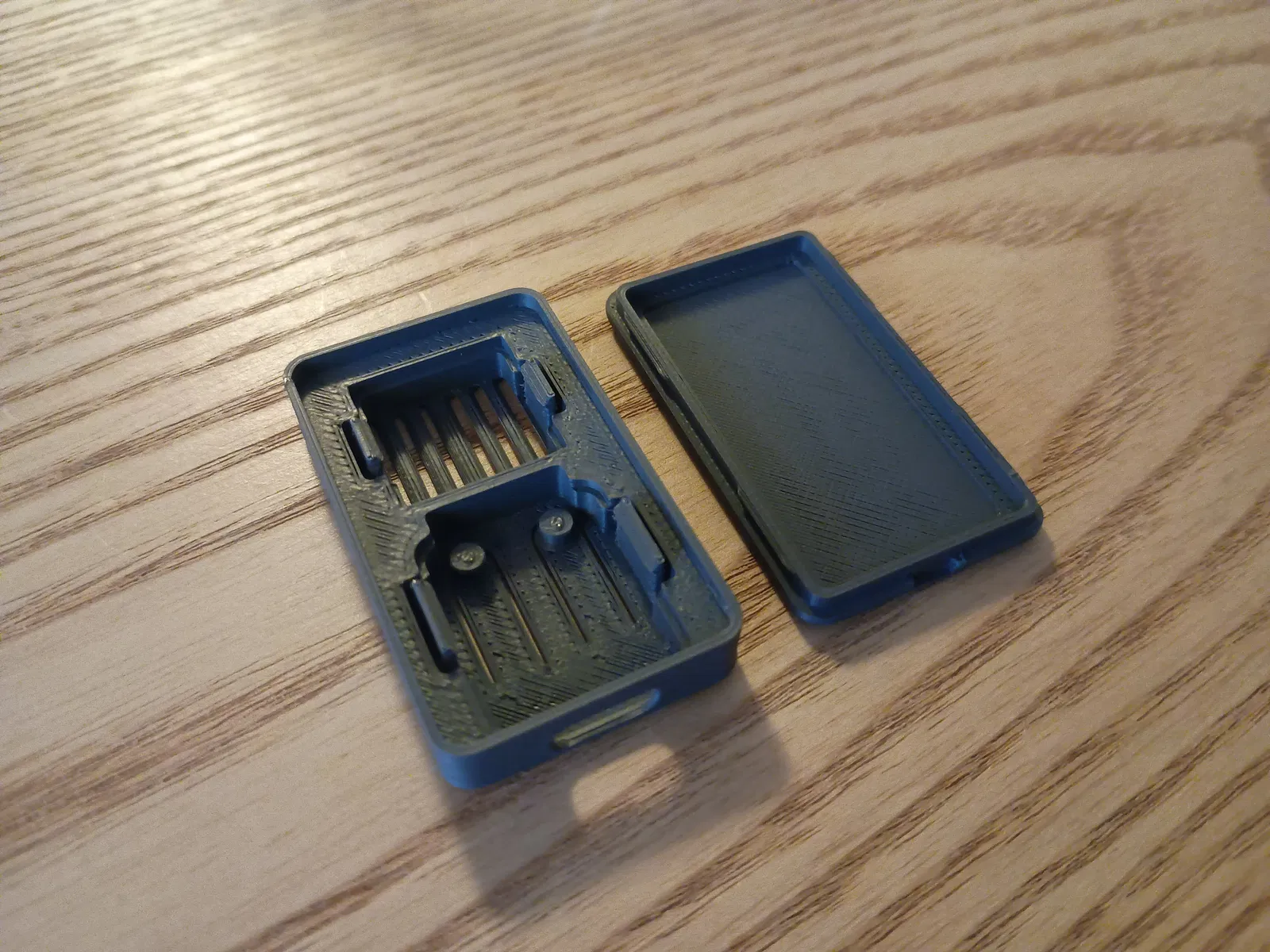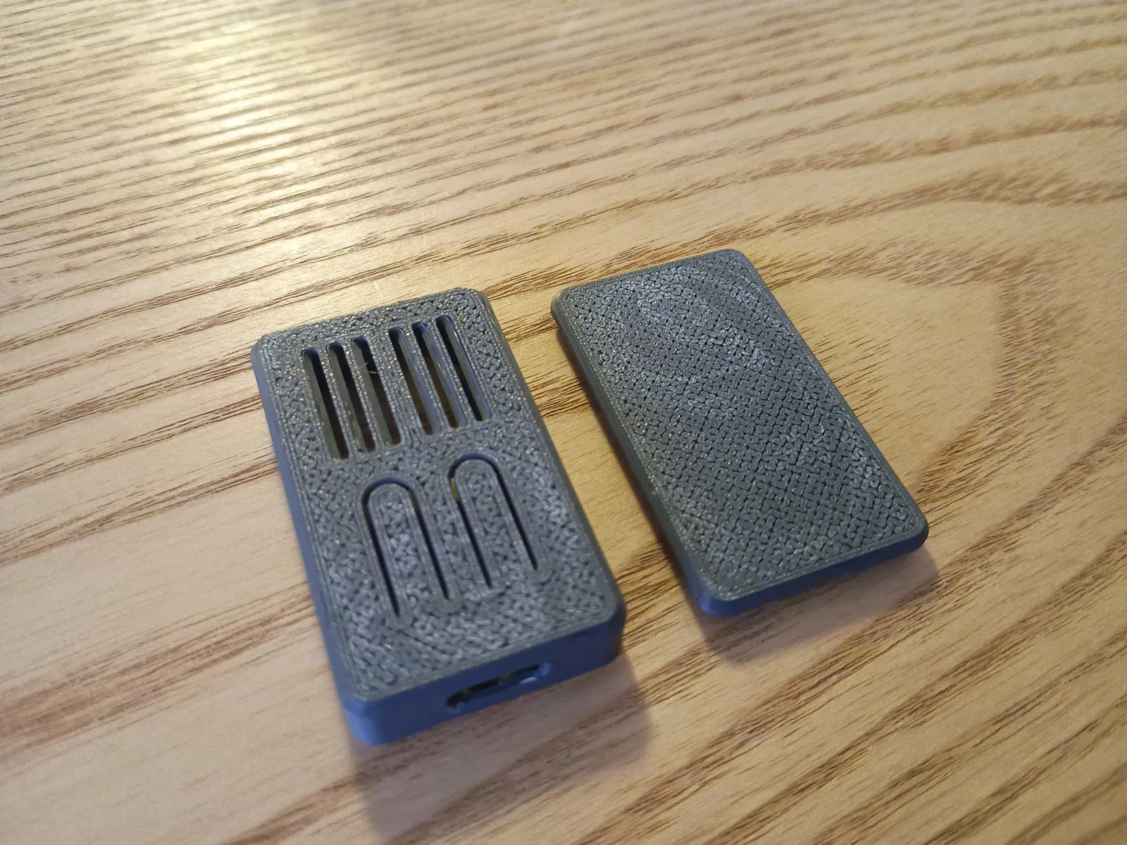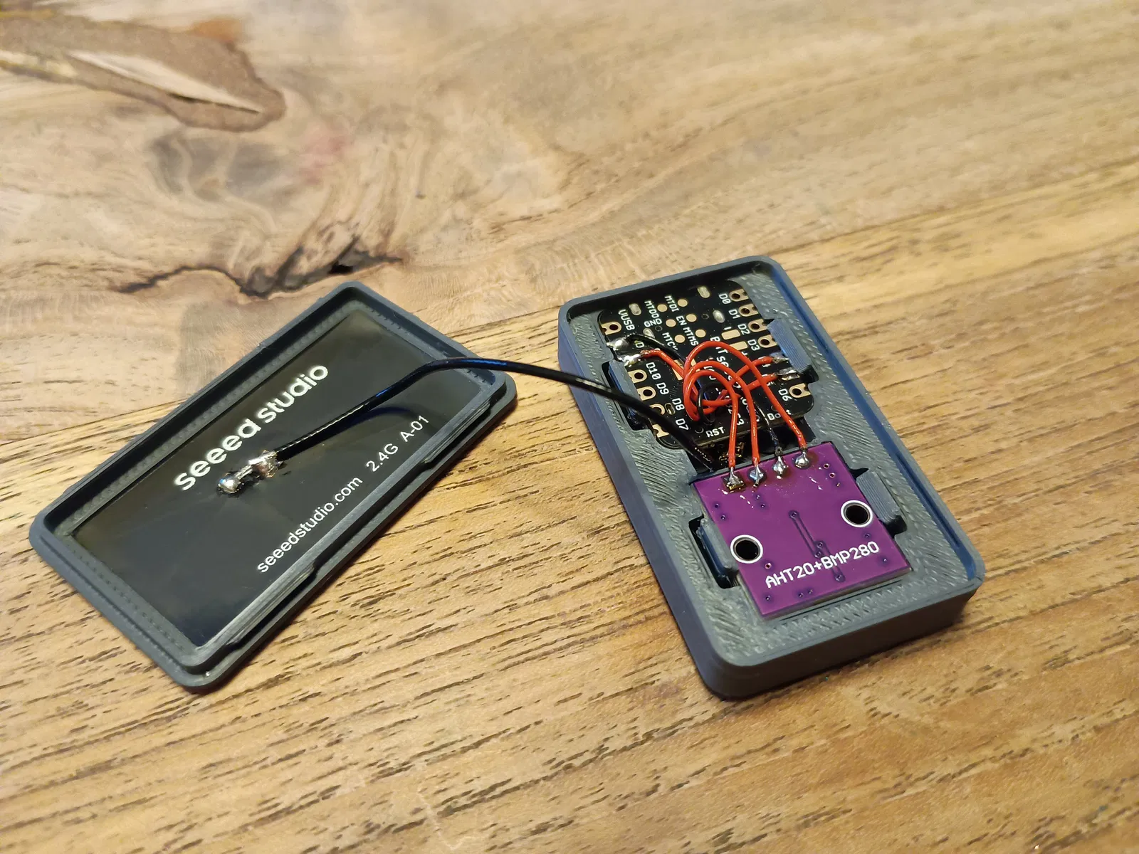 Vỏ case mini cho XIAO-ESP32C3, có chỗ cho anten WiFi và module cảm biến AHT20 + BMP280. PCB cố định bằng ngàm kẹp, dễ lắp/tháo. Nắp lưng bấm khớp, không cần ốc.
