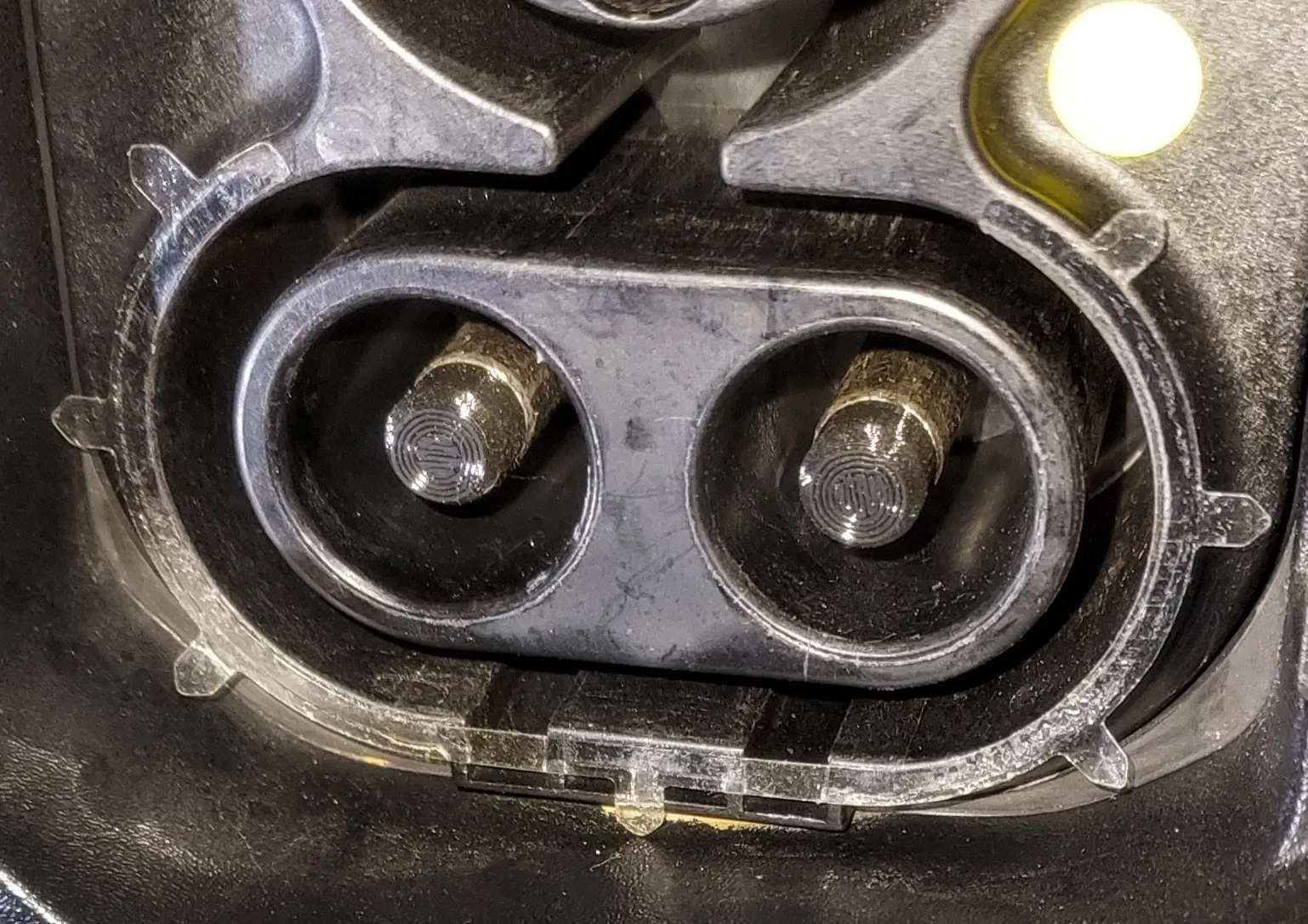 Đây là cách nhận biết bạn đang cần chi tiết này. Nắp dẫn hướng nhựa màu đen bị thiếu ở chân sạc DC bên phải. Lưu ý các chân này là rỗng và bên trong có một ngàm (detent) để cái kẹp (clip) gài vào: