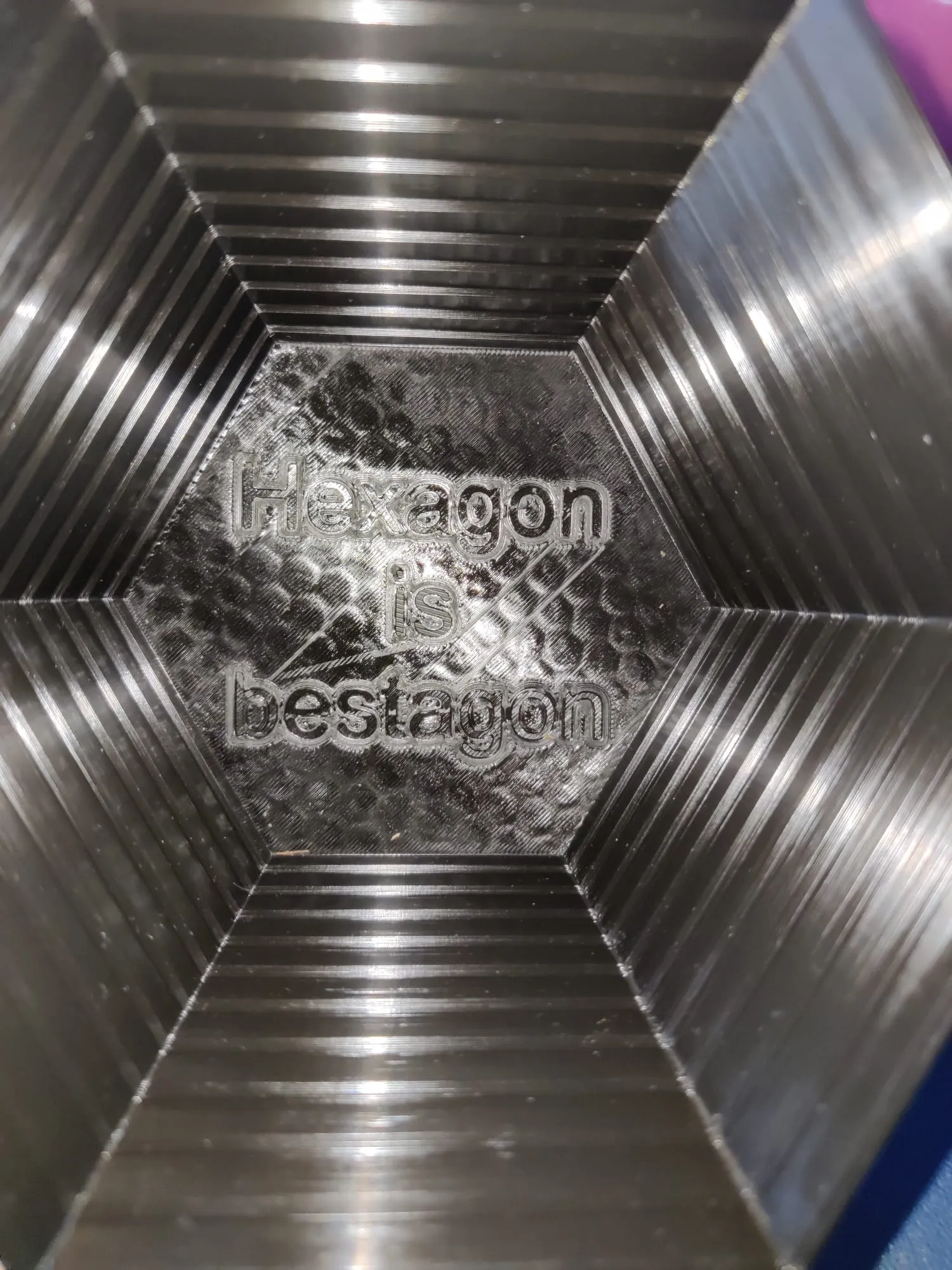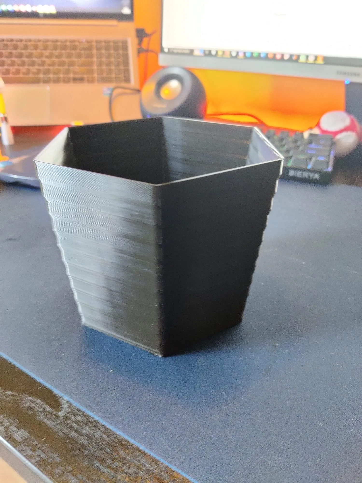 Chậu cây hình lục giác, đường kính đáy 10cm, đường kính trên 12cm, độ dày tường 2mm. Hãy chắc chắn bao gồm một túi nhựa hoặc đặt một cái gì đó dưới đáy vì in 3D không chống thấm nước.