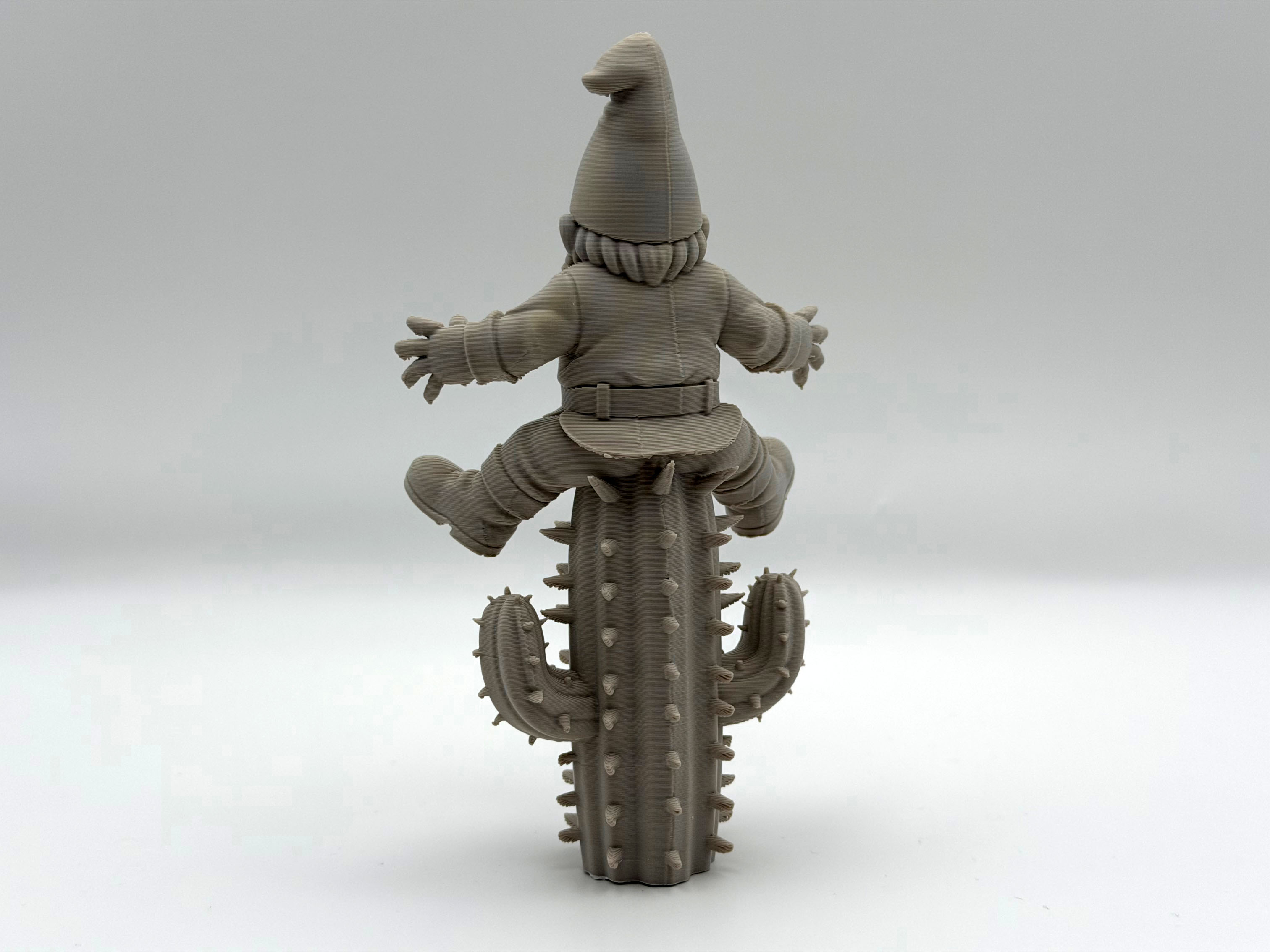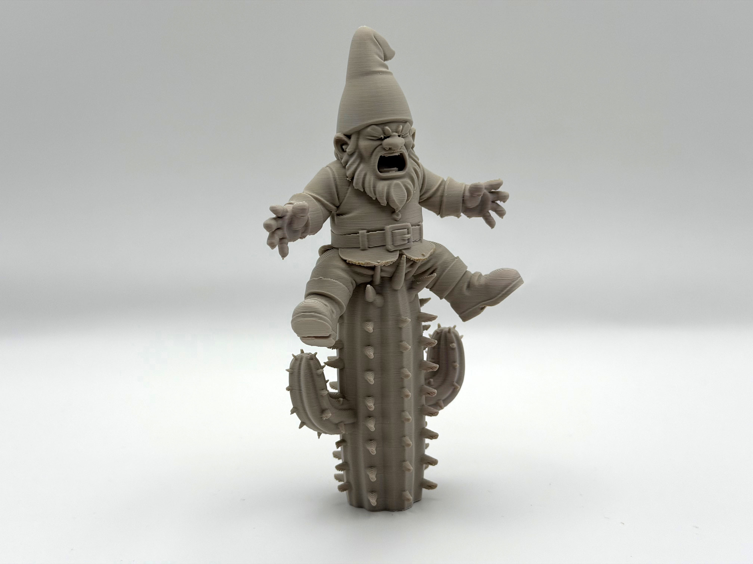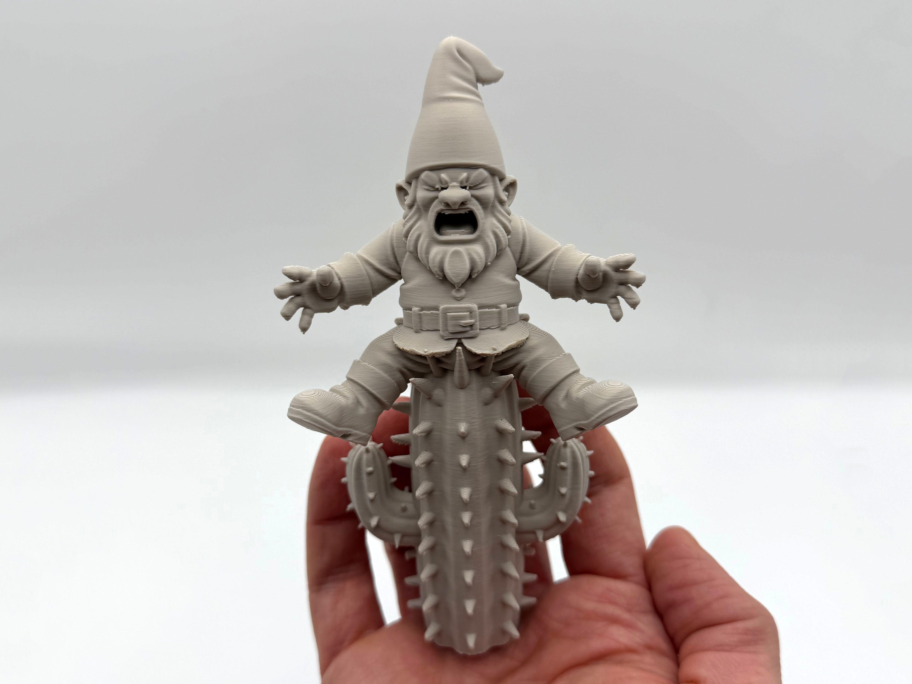 Cacti Pain Garden Gnome – một anh gnome lỡ “hạ cánh” nguyên mông lên cây xương rồng cao chót vót. Mẫu trang trí vui nhộn cho sân vườn/hiên nhà. Ít cần support; organic supports dễ gỡ, chỉnh Z-top height để tháo nhanh hơn.
