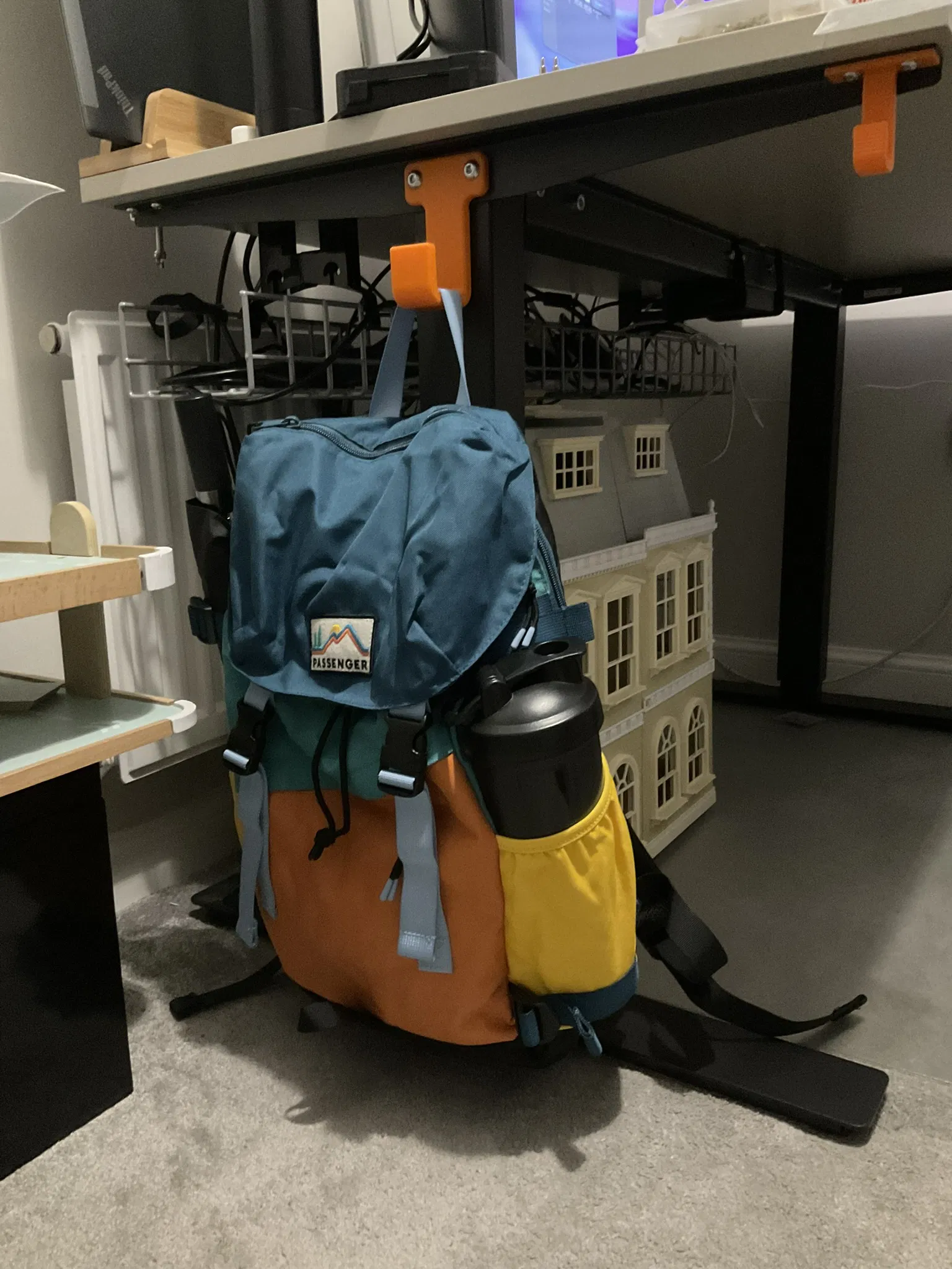 Móc treo gắn giữa khung bàn nâng hạ IKEA TROTTEN, tận dụng điểm lắp sẵn nên chắc chắn mà không cần khoan hay dùng vít/keo. Dùng để treo tai nghe, túi, dây cáp và phụ kiện; in PLA hoặc PETG, cần supports.