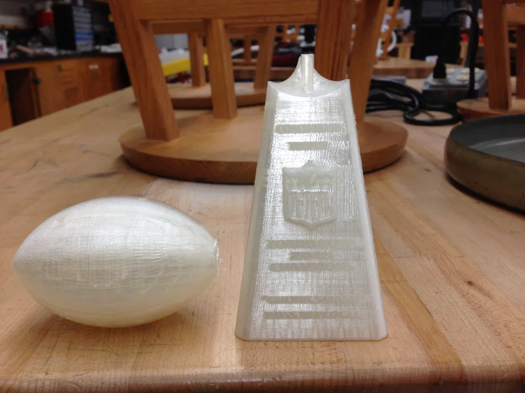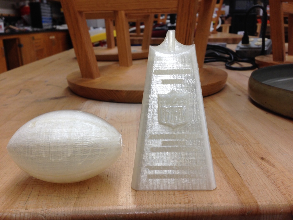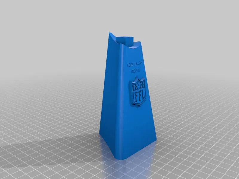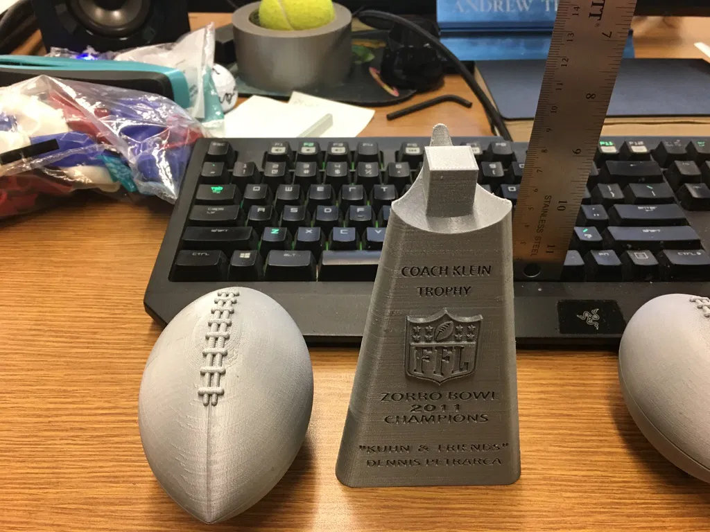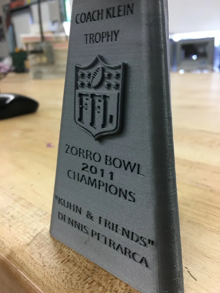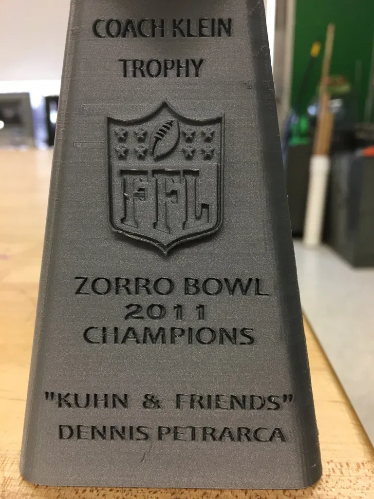 Thay vì thưởng tiền, tác giả thiết kế cúp vô địch Fantasy Football theo phong cách Lombardi và đặt tên theo Coach Klein (The Waterboy). File .stl là bản nhỏ; có thể scale trong Makerbot Desktop để đế cao 140mm theo trục z.