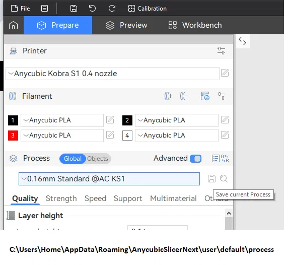 Sau khi bạn lưu các printing profiles, bạn sẽ tìm thấy chúng trong thư mục: //AppData\Roaming\AnycubicSlicerNext\user\default\process.
