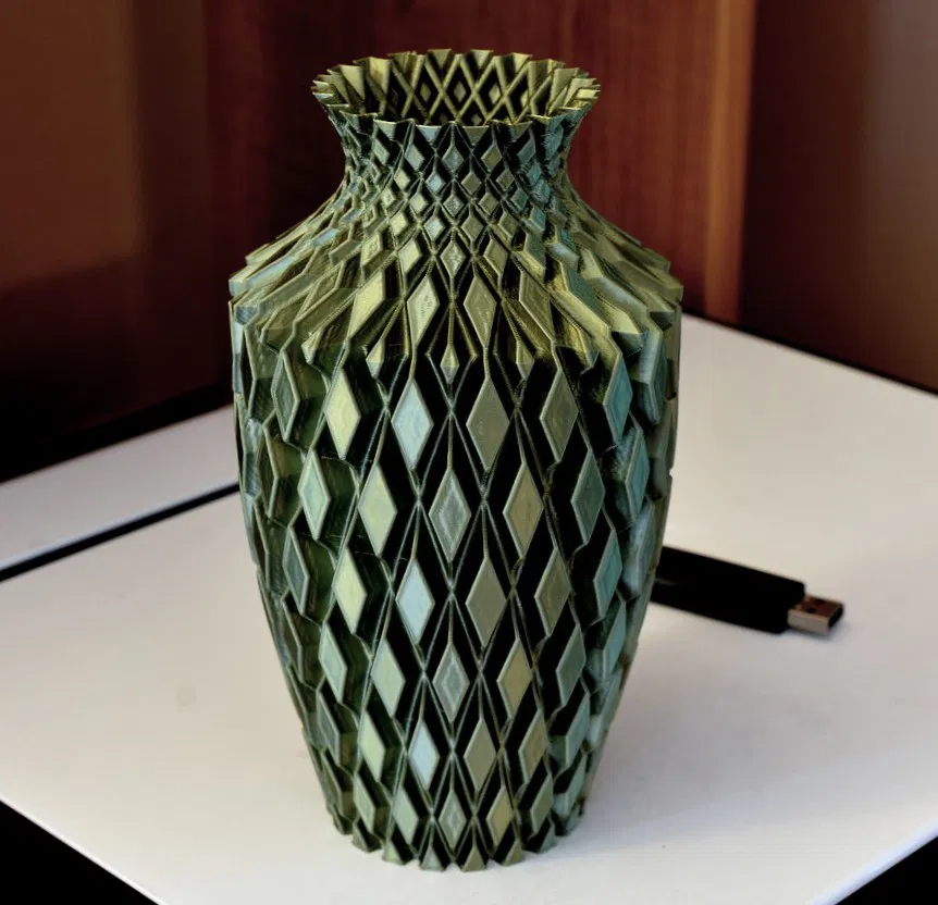 Hình chụp cho thấy bình được in ở chế độ vase mode, tức là in một lớp tường (single wall). Bạn có thể in bằng vase mode, hoặc in chế độ bình thường với 0 top layers và 0% infill, 1 lớp tường trở lên để tăng độ chắc, và 3 lớp bottom layers trở lên. File STL là dạng solid. In bằng vase mode hay chế độ thường đều cho kết quả rất ổn.