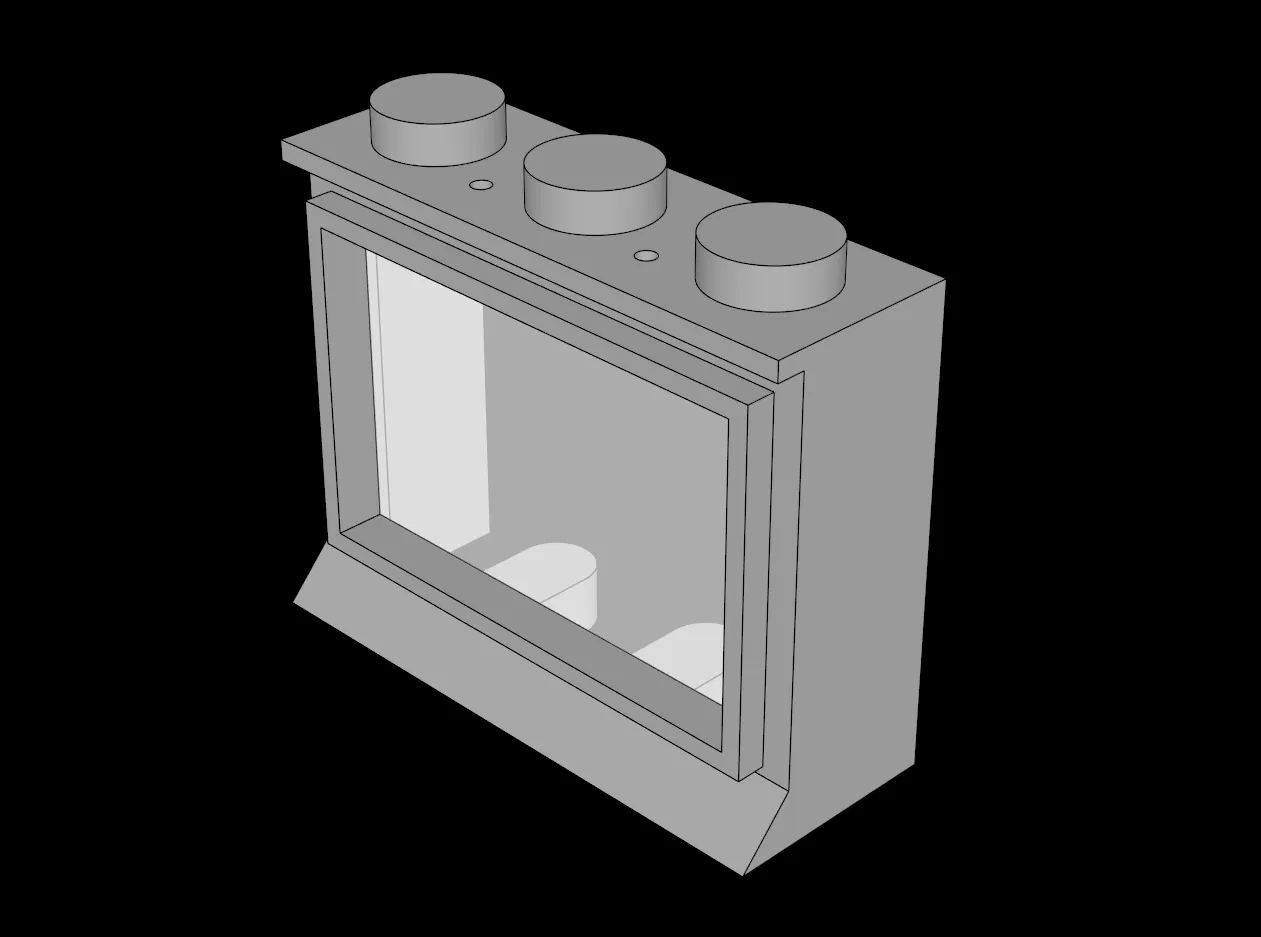 Mẫu 3D Lego Compatible (31ac01.dat) dạng cửa sổ 1 x 3 x 2 Classic với Solid Studs (bản Complete). Thiết kế tương thích với hệ thống LEGO, phù hợp để lắp ghép vào các mô hình theo chuẩn LEGO.