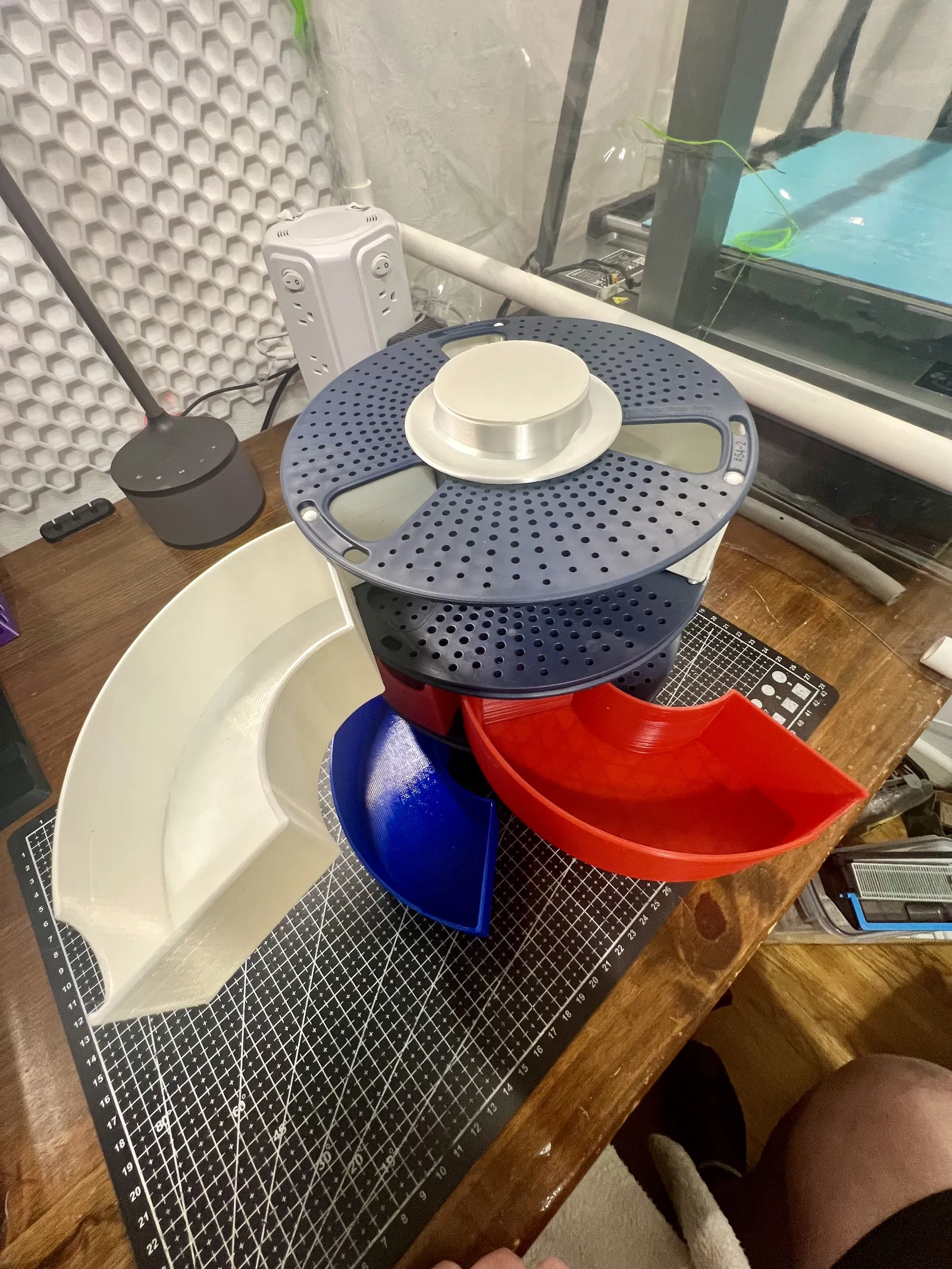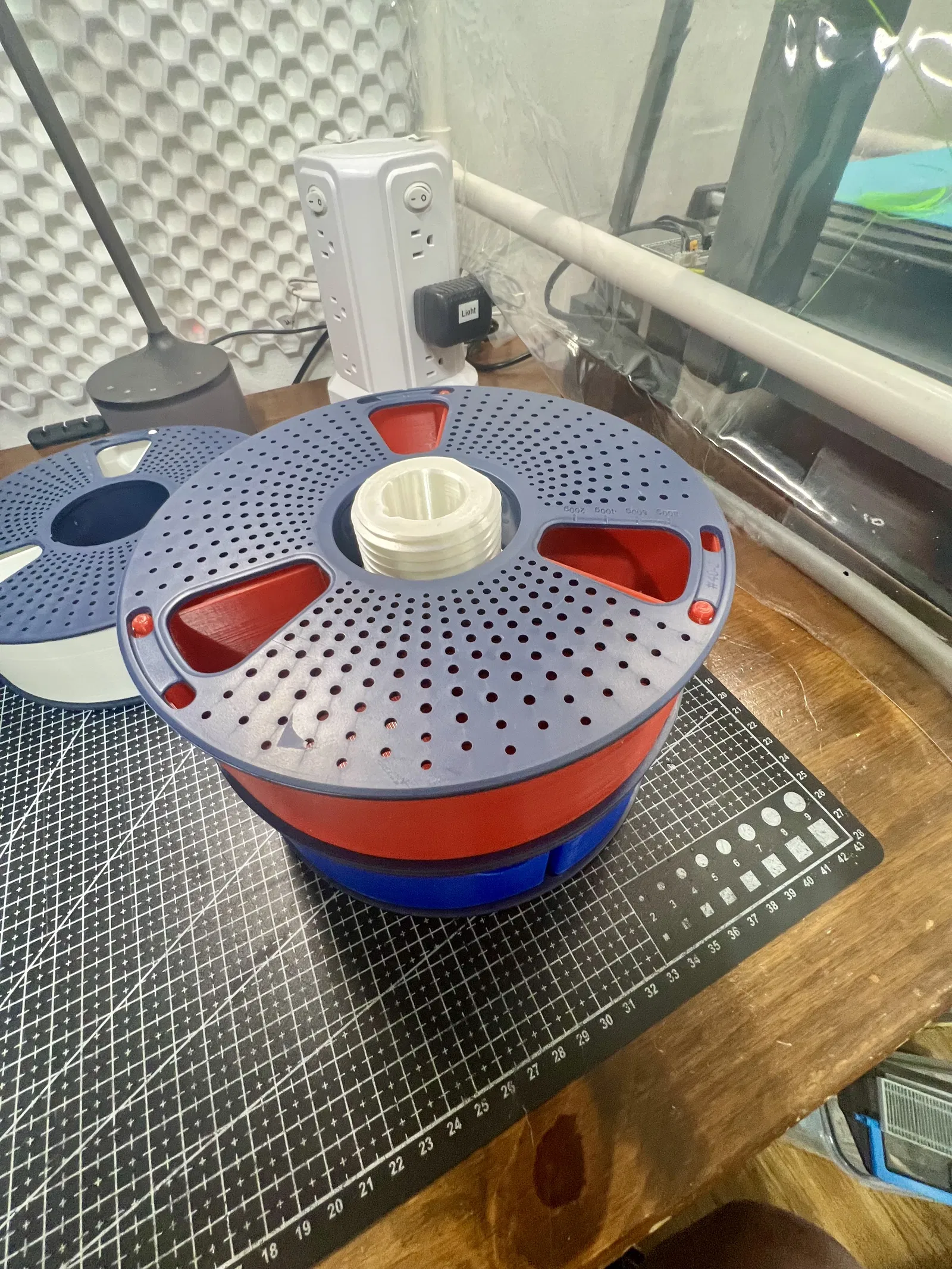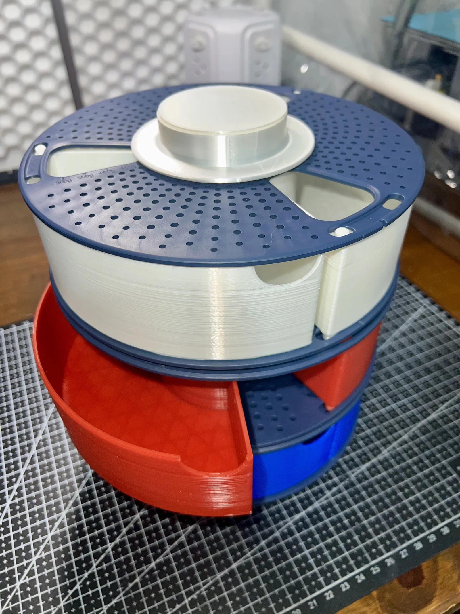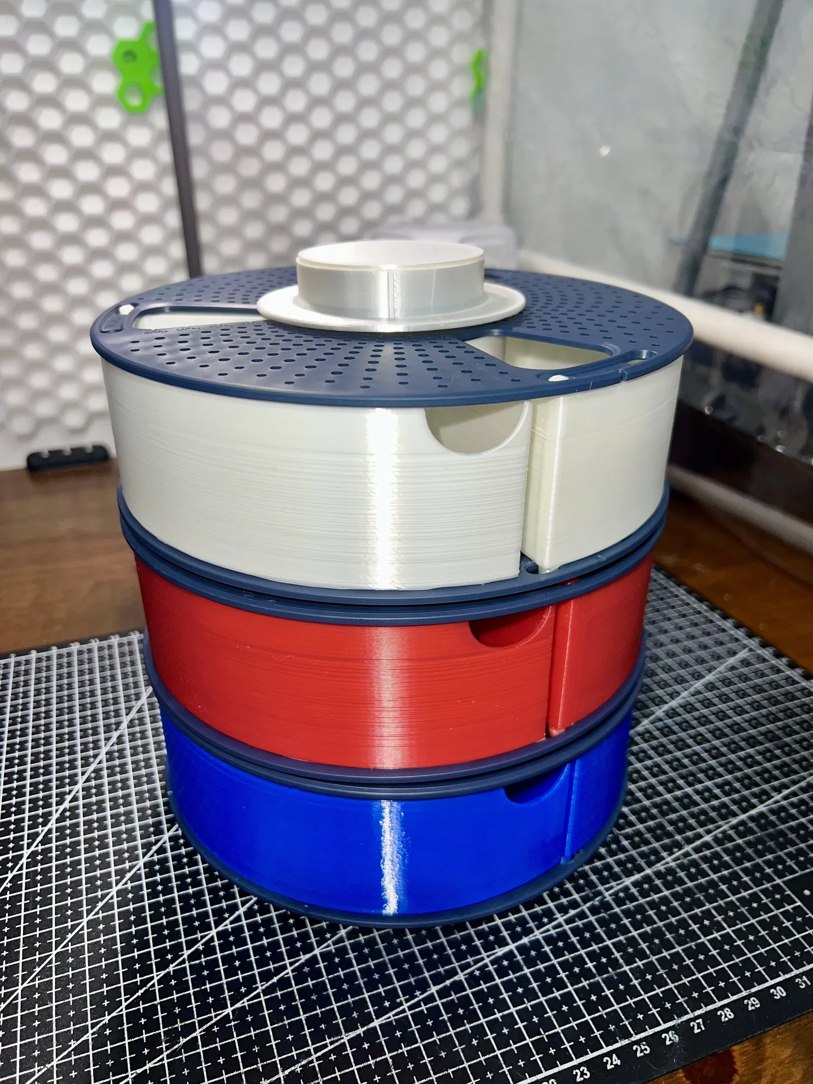 Tận dụng cuộn rỗng Sunlu 1kg để làm hệ ngăn kéo xếp chồng. Có phiên bản cho spool đen đời cũ 8 lỗ (4 ngăn) và spool xanh đời mới 6 lỗ (3 ngăn dài). Đã tách ring/cap, chỉnh pin và nhiều chiều dài screw.