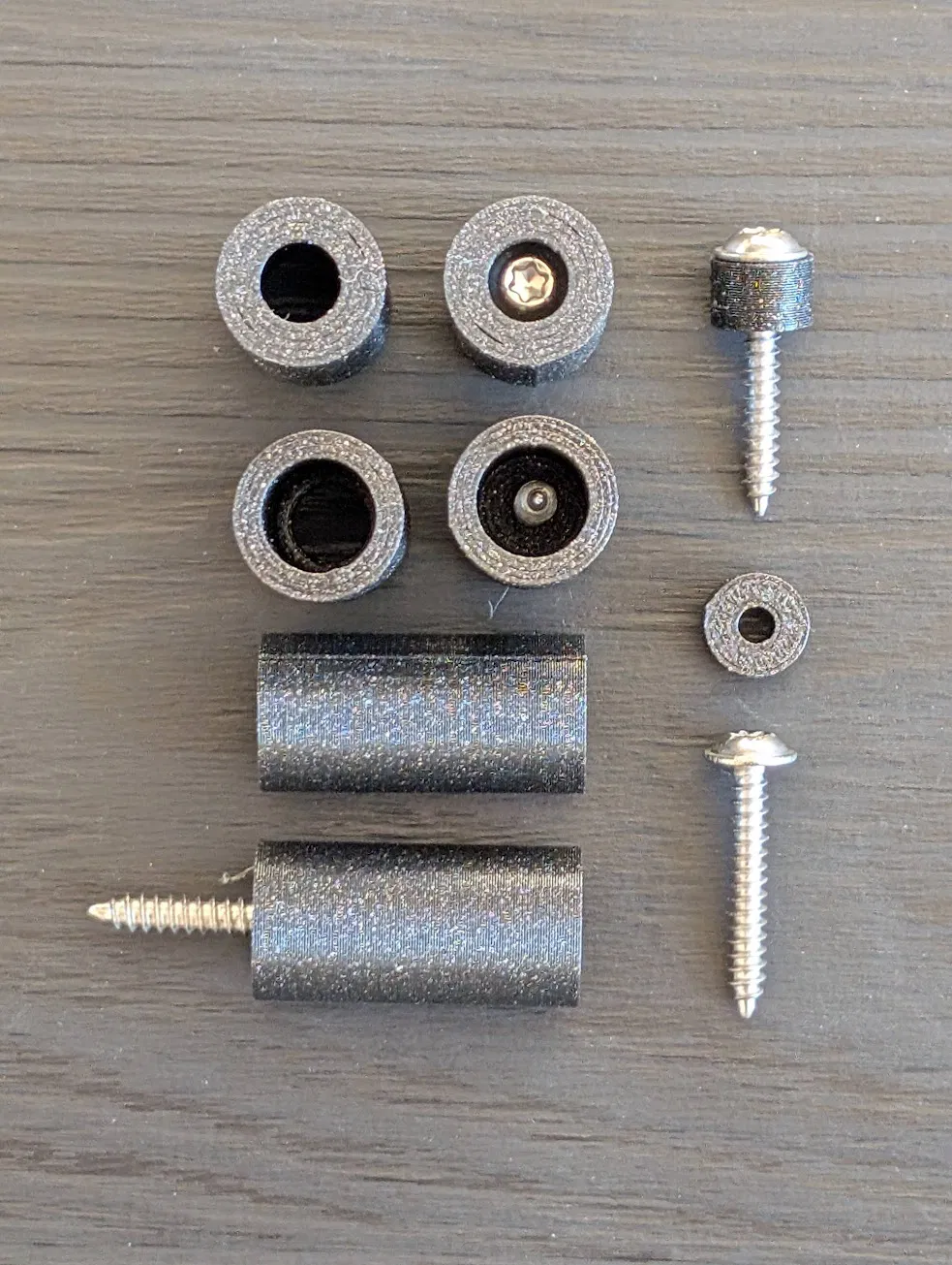 Về ốc, mình dùng loại "Flat Head Wood Screws torx M3 x 20 mm Self Tapping Screws with Disk, Stainless A2 V2A Torx Screws, Full Thread, Plate Screws Stainless Steel". Vặn ốc vào vòng ốc (screw ring) rồi cho vào trong ống giữ ốc (screw holder tube) với đầu Torx hướng về phía lỗ nhỏ. Sau đó canh thẳng toàn bộ với lỗ trên khay đi dây, đưa mũi Torx vào để chắc là vừa, rồi chấm một giọt keo siêu dính (super glue) ở cạnh chỗ tiếp giáp ống/khay và xoay nhẹ cái ống. Keo nên chỉ thấm len giữa hai bề mặt vật liệu. Giữ con ốc nằm hoàn toàn trong ống để tránh phần ốc + vòng bên trong bị keo dính cứng vào khay.