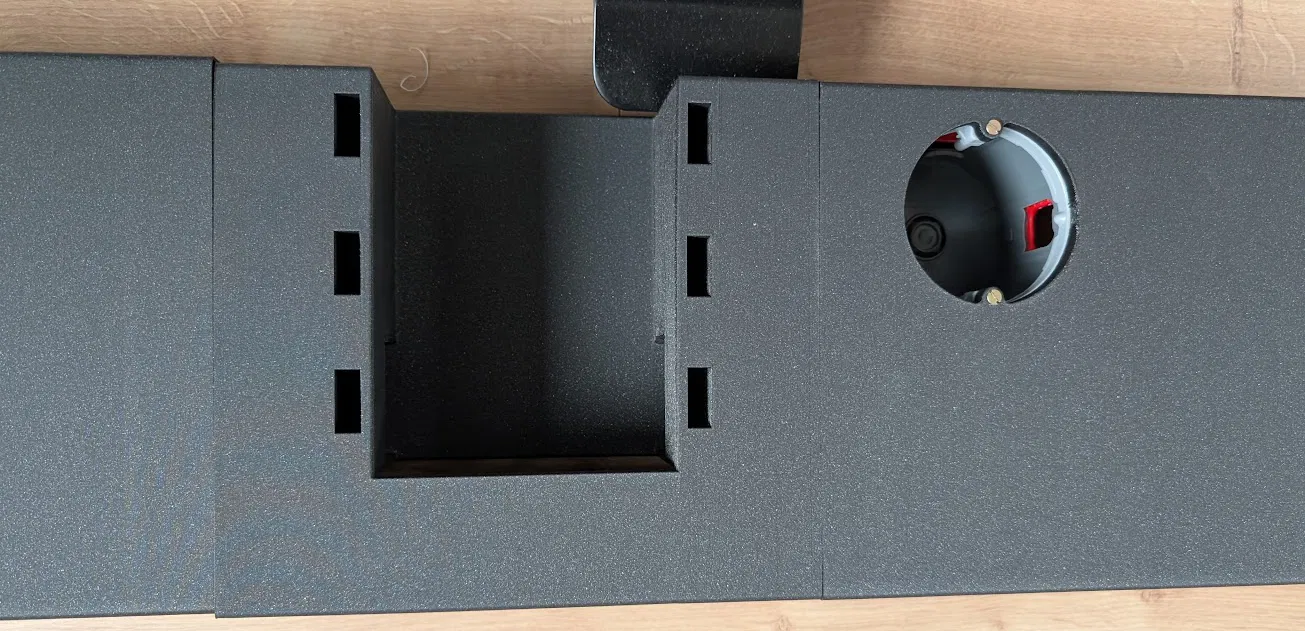 Hệ thống giấu dây dưới bàn gồm khay đôi và cụm ổ cắm điện, tối ưu cho in 3D (đa số không cần support). Có nhiều chiều dài, chốt nối và các mức free play để lắp khít; giúp tách dây nguồn và dây tín hiệu gọn gàng.
