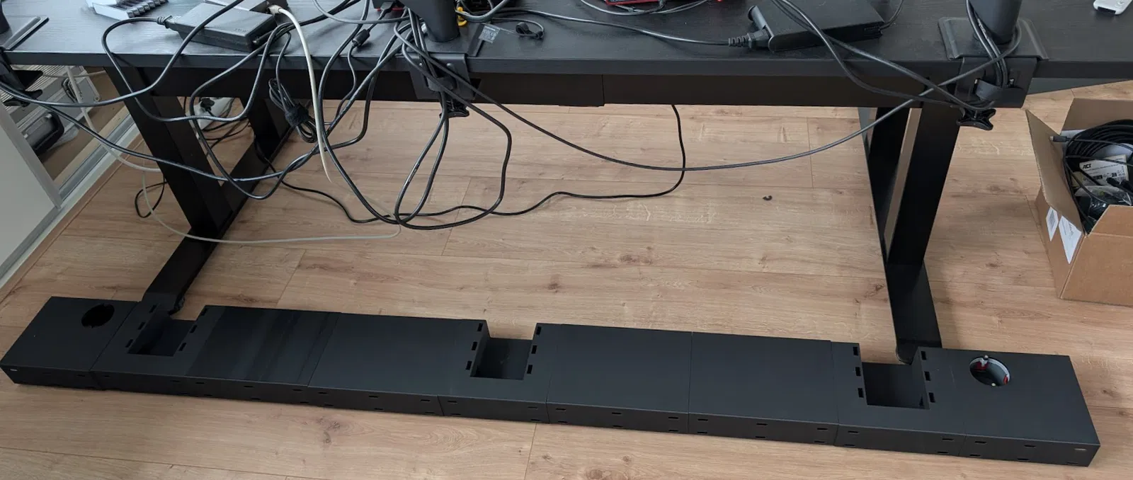 Phía sau bàn của mình quay ra phía phòng, nên mình muốn thiết kế một hệ thống để giấu dây và các ngàm kẹp màn hình ARCTIC X1-3D. Mình cũng muốn có ổ cắm điện với các nhóm nguồn có thể bật/tắt riêng, để có thể tắt PC, toàn bộ màn hình và các ổ cắm khác một cách độc lập. Và mình muốn có nhiều khay, để có thêm lựa chọn sắp xếp dây; ví dụ tách dây audio khỏi dây nguồn để hạn chế nhiễu (crosstalk).