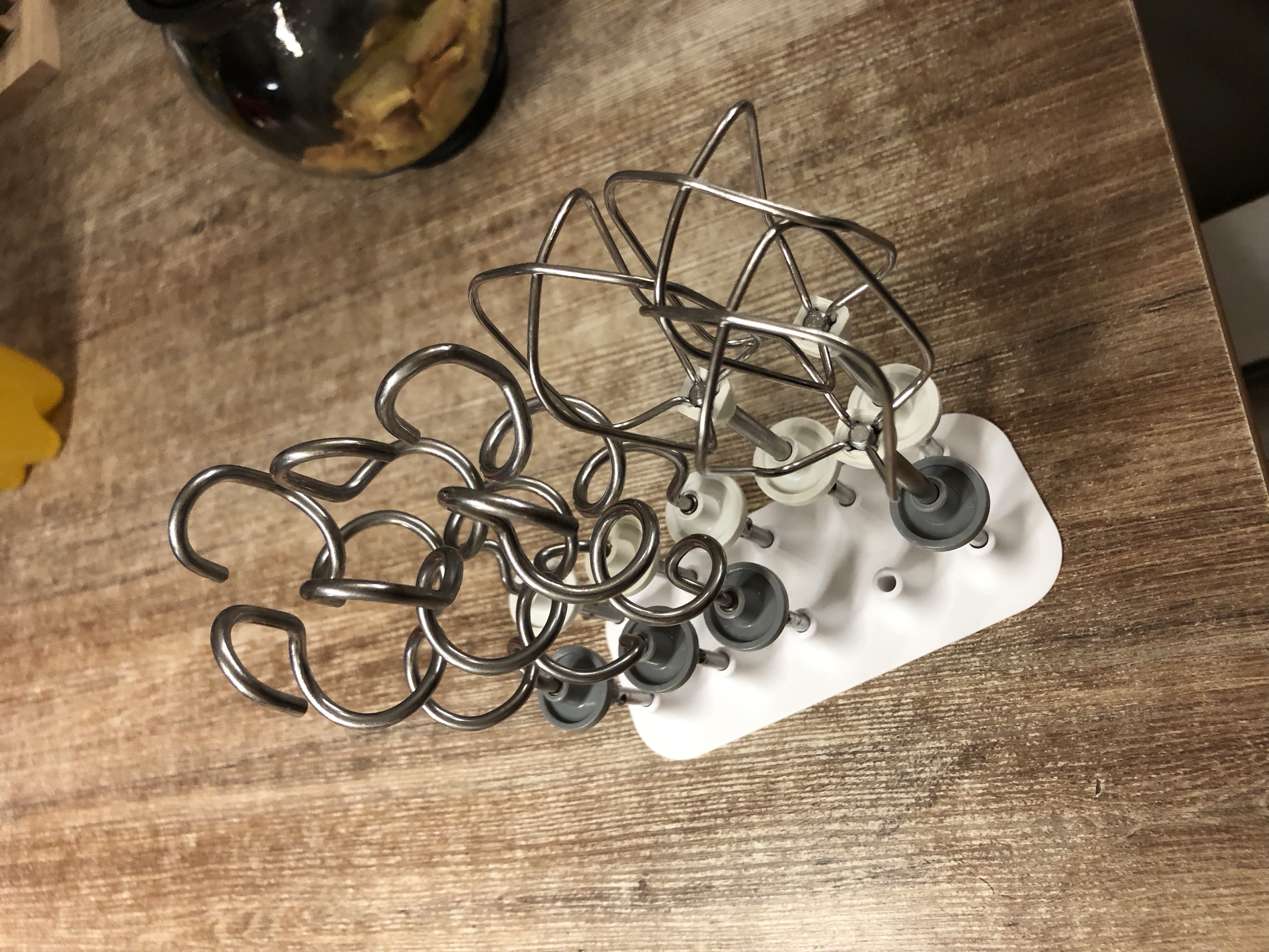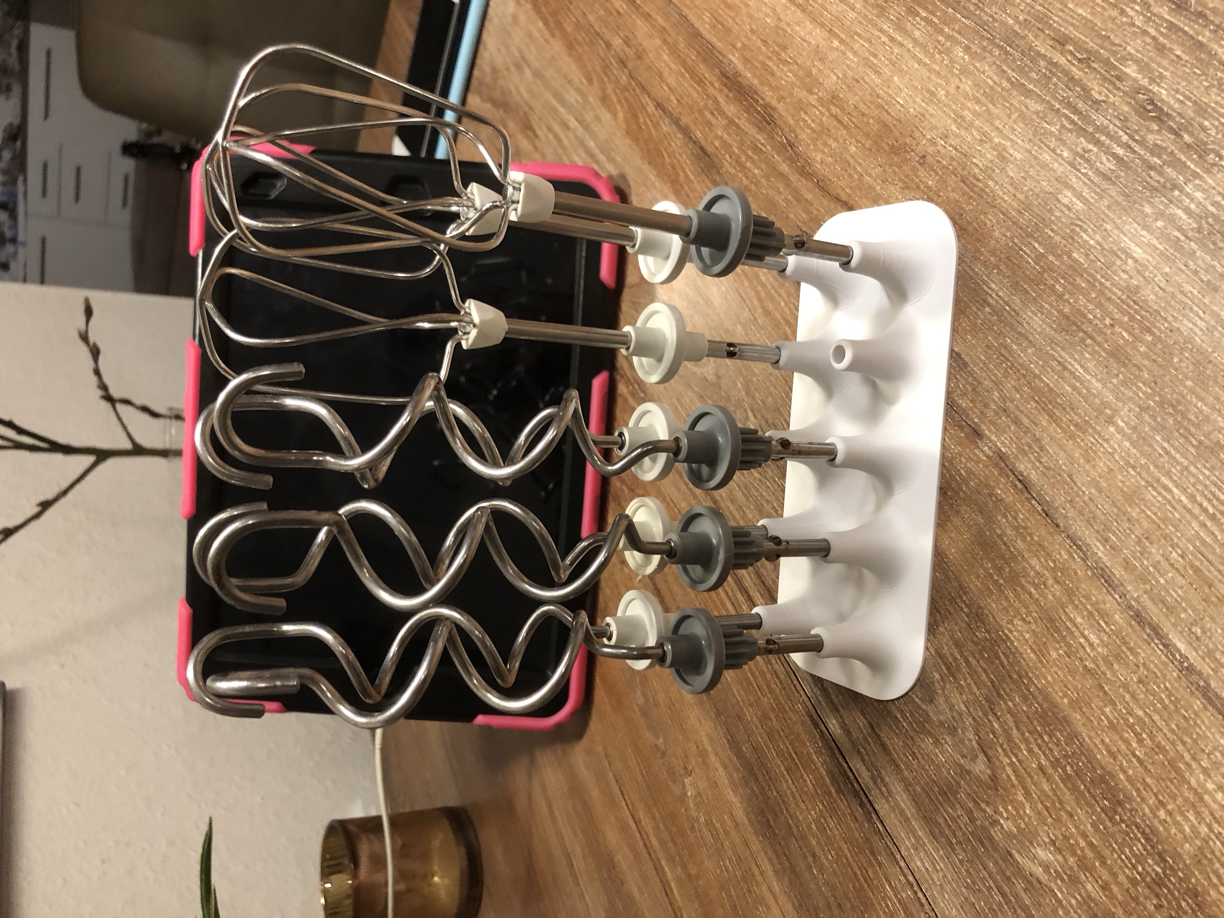 Một giá treo móc nhồi và que đánh trứng cho máy trộn Krups 3Mix. Giá có chỗ cho 5 cặp đầu trộn với đường kính thanh khoảng 5 mm (lỗ trên giá đường kính 6 mm). Mình đã in mẫu này bằng PLA và infill gyroid 15%.