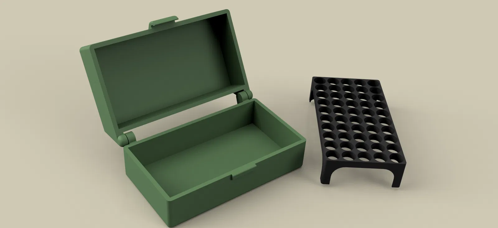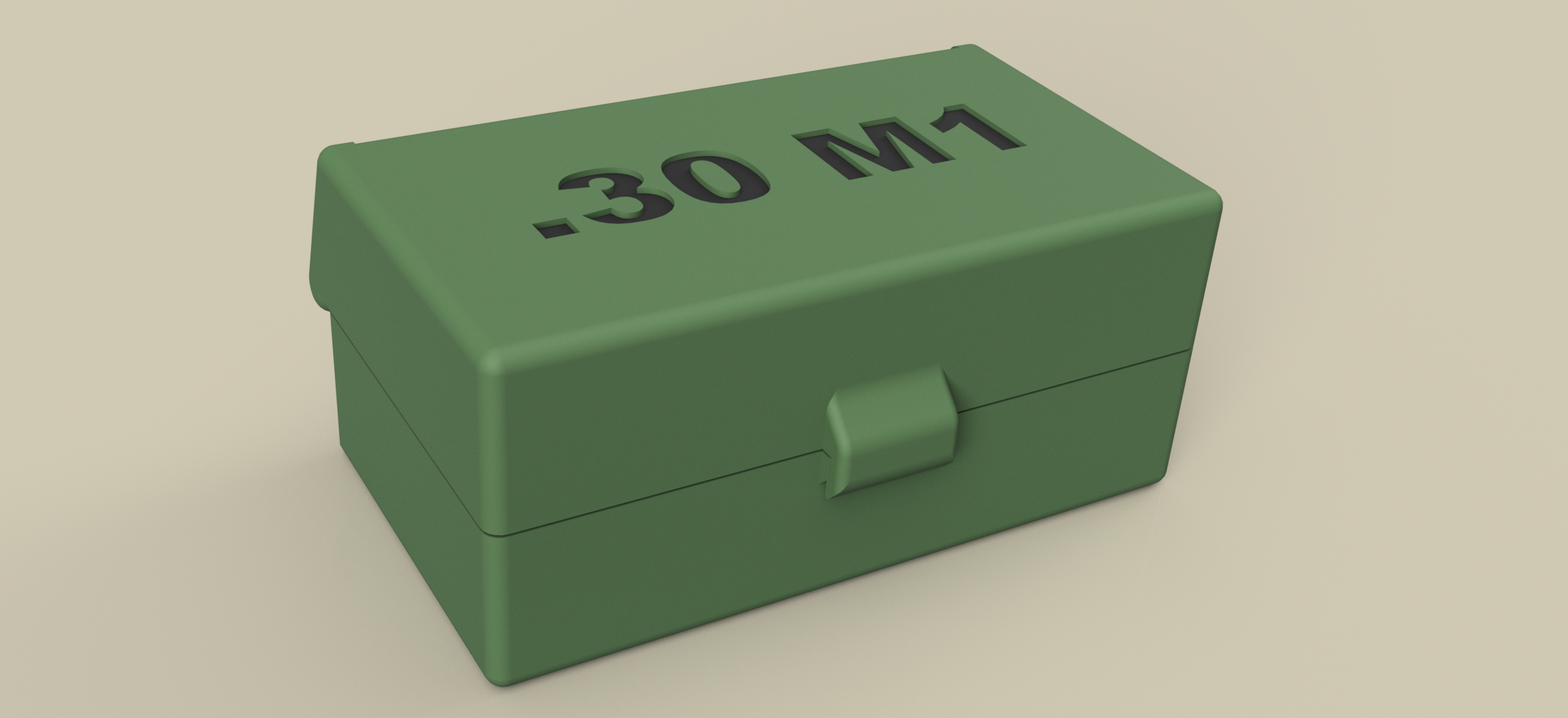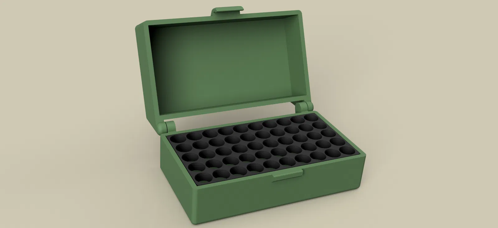 Hộp in 3D đơn giản để cất 50 viên đạn .30 M1 Carbine. Thiết kế bản lề interlocking giúp in liền một khối với hai phần chính, không cần ốc vít, dễ in và gọn gàng.