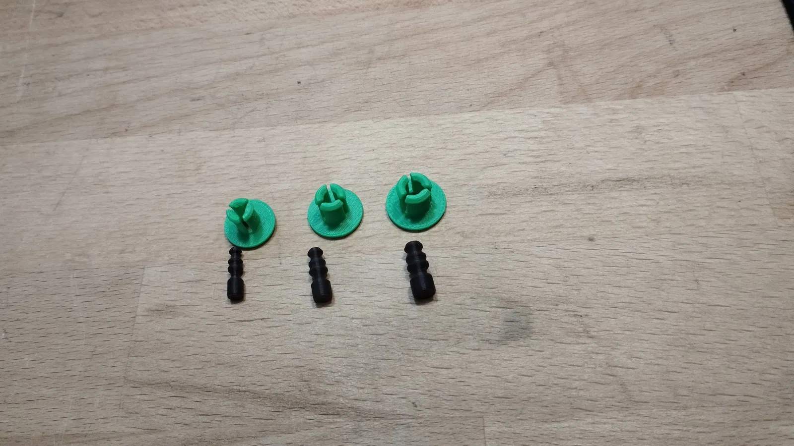 Mẫu push-in rivet/pin/clip dùng cho ô tô, phù hợp các lỗ 6mm, 7mm, 8mm và 10mm. Có hướng dẫn lắp/tháo từng bước và lưu ý in 3D: in 2 chi tiết để mát tốt, dùng brim cho insert, chọn filament bám lớp tốt.